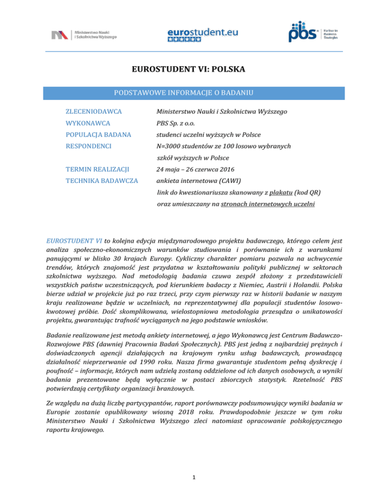 EUROSTUDENT VI: POLSKA PODSTAWOWE INFORMACJE O BADANIU ZLECENIODAWCA Ministerstwo Nauki i Szkolnictwa Wyższego WYKONAWCA PBS Sp. z o.o. POPULACJA BADANA studenci uczelni wyższych w Polsce RESPONDENCI N=3000 studentów ze 100 losowo wybranych szkół wyższych w Polsce TERMIN REALIZACJI 24 maja – 26 czerwca 2016 TECHNIKA BADAWCZA ankieta internetowa (CAWI) link do kwestionariusza skanowany z plakatu (kod QR) oraz umieszczany na stronach internetowych uczelni EUROSTUDENT VI to kolejna edycja międzynarodowego projektu badawczego, którego celem jest analiza społeczno-ekonomicznych warunków studiowania i porównanie ich z warunkami panującymi w blisko 30 krajach Europy. Cykliczny charakter pomiaru pozwala na uchwycenie trendów, których znajomość jest przydatna w kształtowaniu polityki publicznej w sektorach szkolnictwa wyższego. Nad metodologią badania czuwa zespół złożony z przedstawicieli wszystkich państw uczestniczących, pod kierunkiem badaczy z Niemiec, Austrii i Holandii. Polska bierze udział w projekcie już po raz trzeci, przy czym pierwszy raz w historii badanie w naszym kraju realizowane będzie w uczelniach, na reprezentatywnej dla populacji studentów losowokwotowej próbie. Dość skomplikowana, wielostopniowa metodologia przesądza o unikatowości projektu, gwarantując trafność wyciąganych na jego podstawie wniosków. Badanie realizowane jest metodą ankiety internetowej, a jego Wykonawcą jest Centrum BadawczoRozwojowe PBS (dawniej Pracownia Badań Społecznych). PBS jest jedną z najbardziej prężnych i doświadczonych agencji działających na krajowym rynku usług badawczych, prowadzącą działalność nieprzerwanie od 1990 roku. Nasza firma gwarantuje studentom pełną dyskrecję i poufność – informacje, których nam udzielą zostaną oddzielone od ich danych osobowych, a wyniki badania prezentowane będą wyłącznie w postaci zbiorczych statystyk. Rzetelność PBS potwierdzają certyfikaty organizacji branżowych. Ze względu na dużą liczbę partycypantów, raport porównawczy podsumowujący wyniki badania w Europie zostanie opublikowany wiosną 2018 roku. Prawdopodobnie jeszcze w tym roku Ministerstwo Nauki i Szkolnictwa Wyższego zleci natomiast opracowanie polskojęzycznego raportu krajowego. 1 ROLA UCZELNI Przeprowadzenie badania na ogólnopolskiej reprezentatywnej próbie studentów jest dużym wyzwaniem. Sukces tak poważnego przedsięwzięcia wymaga zaangażowania wielu osób. Mimo że badanie opiera się na kwestionariuszu do samodzielnego wypełniania – właściwa realizacja nie wymaga więc angażowania osób trzecich – bardzo potrzebujemy Państwa wsparcia przy jego koordynacji i promocji. Promowanie projektu obejmuje trzy zadania: ZADANIE 1. Wywieszenie plakatów informacyjnych z tzw. kodem QR, którego skan odsyła do kwestionariusza ankiety internetowej: w tym celu na wskazany w trakcie rozmowy telefonicznej adres korespondencyjny przesłane zostaną plakaty informacyjne (format A2) – zwracamy się z uprzejmą prośbą o umieszczenie ich w miejscu widocznym dla potencjalnych respondentów, w miarę możliwości w gmachu każdego wydziału prowadzącego co najmniej jeden wylosowany kierunek lub w innymbudynku, w którym studenci wylosowanych kierunków odbywają zajęcia czy zaliczenia. ZADANIE 2. Poinformowanie studentów badanych kierunków uczących się na studiach różnego stopnia w różnym trybie o badaniu, w tym o towarzyszącym mu konkursie z nagrodami (trzy tablety – po jednym dla każdego z trzech zwycięzców konkursu) w trakcie zajęć dydaktycznych, przed lub po kolokwiach/ egzaminach: w tym celu prosimy wykorzystać ogólne informacje zamieszczone w punkcie „Podstawowe informacje o badaniu” oraz dane precyzujące minimalną liczbę respondentów w podziale na cechy istotne z punktu widzenia celów badawczych przedstawione w pliku „EUROSTUDENT VI – próba”. ZADANIE 3. Umieszczenie linku do kwestionariusza ankiety internetowej w wirtualnym dziekanacie oraz/ lub na stronie internetowej wydziału czy uczelni oraz/ lub dystrybucja linku na konta mailowe studentów: w tym celu prosimy wykorzystać ogólne informacje zamieszczone w punkcie „Podstawowe informacje o badaniu” oraz link do badania : „https://ankieta.pbs.pl/45a591c3e699bdfd3d8e2eb0c6ad55cb.pg” 2 PRÓBA BADAWCZA Łącznie badaniem objętych zostanie 3000 studentów. Aby cechy przebadanej grupy wiernie odzwierciedlały cechy całej populacji, uporządkowaliśmy dane dotyczące szkół wyższych, wylosowaliśmy 100 uczelni, a następnie, w każdej z nich, średnio po kilka kierunków, w ramach których będziemy badać studentów różnej płci, uczących się w różnym trybie i na różnym poziomie. Ponieważ próba zrealizowana ma odzwierciedlać strukturę całej populacji, studenci biorący udział w badaniu muszą być zróżnicowani ze względu na kierunek studiów, płeć, tryb studiowania oraz stopień studiów. Na podstawie danych na temat populacji studentów w każdej uczelni włączonej do próby wylosowane zostały kierunki objęte badaniem oraz określona minimalna liczba respondentów w kategorii: kobiet oraz mężczyzn; osób studiujących stacjonarnie (dziennie) oraz niestacjonarnie (zaocznie lub wieczorowo); osób studiujących na studiach pierwszego stopnia (licencjackich, inżynierskich lub równorzędnych) oraz na studiach drugiego stopnia i jednolitych (magisterskich lub równorzędnych); osób studiujących na studiach podyplomowych. Dokładny wykaz kierunków wylosowanych do badania oraz dane doprecyzowujące minimalną liczbę respondentów w podziale na wymienione powyżej cechy zostały zamieszczone w pliku „EUROSTUDENT VI – próba”. 3