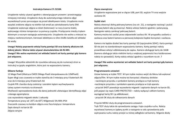 Instrukcja Kamera LTL 5210A Urządzenie należy używać zgodnie z obowiązującym prawem i przestrzegając niniejszej instrukcji. Urządzenie służy do automatycznego robienia zdjęć wyzwolonych przez poruszające się przed obiektywem istoty. Urządzenie może wysyłać zrobione zdjęcia na telefon lub email po zainstalowaniu karty SIM. Urządzenie wykonuje zdjęcia w dzień (kolorowe) i w nocy (czarno białe), wykrywając różnice temperatur za pomocą czujnika. Przełączanie miedzy trybem dziennym a nocnym następuje automatycznie. Urządzenie nie wolno u mieszać na miejscu nasłonecznionym, kierować obiektywu w silne źródło światła ani wkładać do wody. Złącza zewnętrzne Urządzenie wyposażone jest w złącze USB, port SD, wyjście TV oraz wejście zasilania DC Szybki start Należy otworzyć dolną pokrywę kamery (rys str. 21), a następnie nacisnąć i puścić pokrywę baterii aby ją otworzyć. Należy włożyć baterie zgodnie z polaryzacją. Następnie należy zamknąć pokrywę baterii. Kamerę można też zasilać przez odpowiedni zasilacz 6V. W przypadku zasilania z zasilacza oraz baterii kamera w pierwszej kolejności będzie korzystać z zasilacza. Uwaga! Należy poprawnie włożyć kartę pamięci SD oraz baterię alkaiczne AA dobrej jakości. Można także używać akumulatorków AA Ni-MH. Uwaga!! Nie wolno wymieniać ani wkładać baterii ani karty pamięci gdy kamera jest włączona. Kamera nie będzie działać bez karty pamięci SD (opcjonalnie SDHC). Karta pamięci SD nie jest na standardowym wyposażeniu kamery. Kartę pamięci należy prawidłowo włożyć odblokowaną do zapisu. Kamera obsługuje karty do 16GB (kamera obsługuje także niektóre karty o większej pojemności lecz każdorazowo należy to sprawdzić). Kartę należy włożyć zgodnie z rysunkiem na str. 7 Uwaga! Wszystkie odnośniki do rysunków odnoszą się do numeracji stron w instrukcji w języku angielskim, która jest na wyposażeniu kamery. Uwaga!! Nie wolno wymieniać ani wkładać baterii ani karty pamięci gdy kamera jest włączona. Główne funkcje 12 Mega Pixeli (Matryca CMOS 5Mega Pixeli interpolowana do 12MPixeli) Super długi czas czuwania w trybie stand by do 3 miesięcy przy 4 bateriach AA oraz do 6 miesięcy przy 8 bateriach AA Czujnik PIR z bardzo dużą czułością i szerokim kątem wychwytywania Łatwy system montażu na drzewach Możliwość wprowadzenia kodu dla danej jednostki ułatwiające identyfikację zdjęć z danego egzemplarza czas wyzwolenia migawki około 1 sekundy Temperatura pracy od -20oC do 60oC Wilgotność 5%-90% IP54 Znaczanik czasowy na każdym zdjęciu oraz faza księżyca i temperatura Zapis danych na karcie SD Zdjęcia seryjne Programowanie ustawień Ustaw kamerę w trybie TEST. W tym trybie możesz wejść do Menu lub wykonać zdjęcie/film. W tym trybie można też korzystać z klawiszy skrótów: - naciśnięcie przycisku z symbolem kamery przełącza w tryb kamery -naciśnięcie przycisku z symbolem aparatu przełącza w tryb aparatu - przycisk SHOT powoduje wyzwolenie migawki i zapisanie danych na karcie SD, jeśli pojawi się napis CARD PROTECTED – należy wyłączyć całkiem kamerę wyciągnąć kartę SD i ją odblokować. - przycisk OK służy do odtwarzania danych Przycisk MENU służy do programowania ustawień. Tryb TEST służy także do sprawdzania zasięgu i kąta czujnika ruchu. Należy wycelować kamerę w żądany punkt a następnie w celu sprawdzenia pola wykrywania ruchu należy przejść w różnej odległości od kamery. Miganie diody niebieskiej oznacza wykrycie ruchu przez czujnik boczny, natomiast miganie diody czerwonej oznacza wykrycie ruchu przez czujnik główny. Ten sposób pozwala na zdefiniowanie najlepszego ustawienia kamery na pole które chcemy monitorować. Kamerę zaleca się ustawiać około 1-2 metrów nad ziemią. Nie wolno ustawiać kamery blisko silnego źródła światłą i ciepła. Nie wolno celować kamery w silne źródło światła. Tryb ON Służy do robienia zdjęć z zaprogramowanymi ustawieniami. Kamera po przełączeniu w tryb ON miga czerwoną diodą przez około 10sek a następnie jest gotowa do działania. Kamera gdy nie wykrywa ruchu przechodzi automatycznie w tryb stand by aby oszczędzać energię. Kamera po wykryciu ruchu potrzebuje około 1sek aby być gotowym do robienia zdjęć. W związku z tym w przypadku wykrycia obiektu, który się porusza bardzo szybko równolegle do kamery to może nie zostać zarejestrowany. Aby to opóźnienie wyeliminować kamera ma 1 czujnik główny oraz 2 pomocnicze o pokryciu do 1200, które aktywują kamerę ze stanu stand by aby po wykryciu przez czujnik główny zdjęcie mogło być zrobione niemal natychmiast. Jednakże aby uniknąć sytuacji kiedy obiekt uruchamia czujnik dodatkowy ale nie uruchamia czujnika głównego, kamera posiada zabezpieczenie aby w sytuacji gdy uruchamiany jest kilkakrotnie jedynie czujnik dodatkowy zostaje on dezaktywowany aż do momentu kiedy obiekt uruchomi czujnik główny. W takiej sytuacji czujnik główny włączy kamerę po 1 sekundzie. Ustawienia zaawansowane Kamera jest ustawiona optymalnie, ale można ustawić ją wg. własnych potrzeb. Aby to zrobić wejdź do trybu TEST. Następnie naciśnij przycisk MENU. Między ustawieniami przechodzi się za pomocą przycisków nawigacji góra/dół. Ustawienia wybiera się za pomocą przycisków lewo/prawo. Aby zatwierdzić ustawienie musi się nacisnąć OK po wybraniu żądanego ustawienia. Możliwe ustawienia MODE – tylko aparat (robi tylko zdjęcia), tylko kamera (robi tylko nagrania) lub aparat a następnie kamera. FORMAT – formatuje kartę. Powinno się sformatować każdą nowo używaną kartę SD. UWAGA !!! Formatowanie usuwa WSZYSTKIE dane z karty SD PHOTO SIZE – format zapisu zdjęć. Im większy tym lepsza jakość ale więcej zajmuje miejsca na karcie SD VIDEO SIZE – analogicznie do PHOTO SIZE ale dla filmów SET CLOCK – ustawienie daty i c