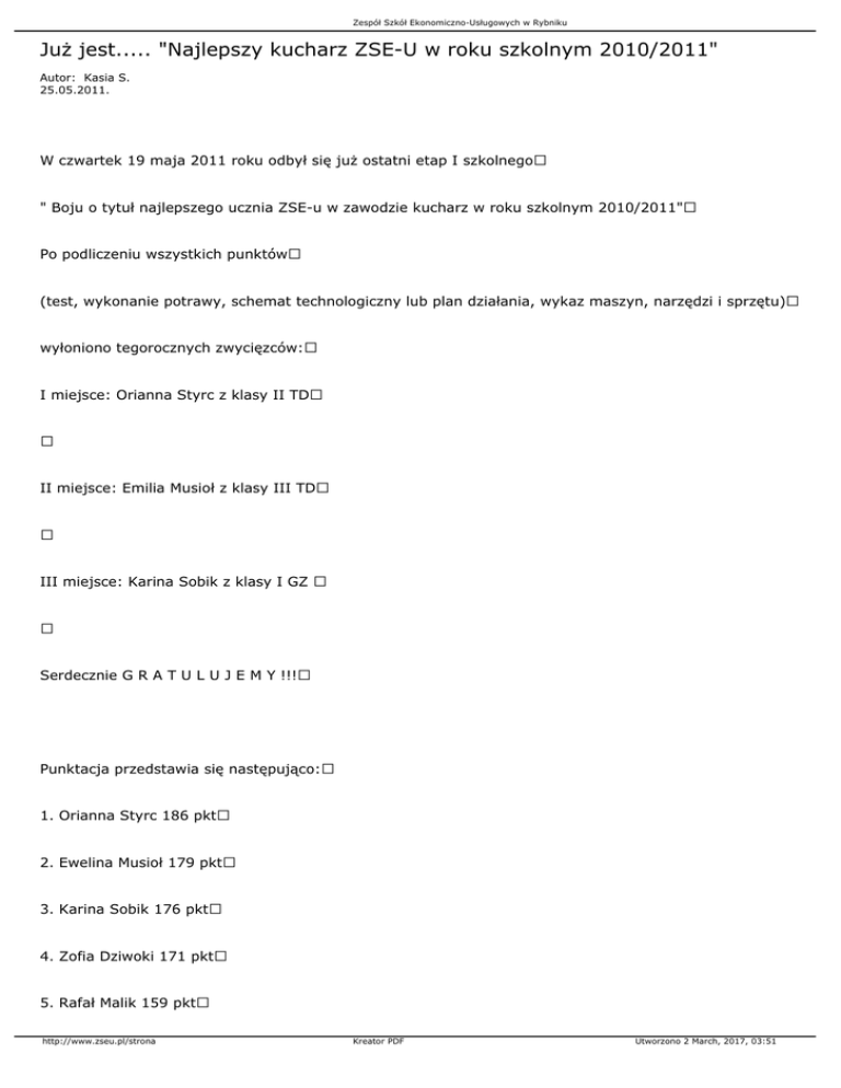 Zespół Szkół Ekonomiczno-Usługowych w Rybniku Już jest..... "Najlepszy kucharz ZSE-U w roku szkolnym 2010/2011" Autor: Kasia S. 25.05.2011. W czwartek 19 maja 2011 roku odbył się już ostatni etap I szkolnego " Boju o tytuł najlepszego ucznia ZSE-u w zawodzie kucharz w roku szkolnym 2010/2011" Po podliczeniu wszystkich punktów (test, wykonanie potrawy, schemat technologiczny lub plan działania, wykaz maszyn, narzędzi i sprzętu) wyłoniono tegorocznych zwycięzców: I miejsce: Orianna Styrc z klasy II TD II miejsce: Emilia Musioł z klasy III TD III miejsce: Karina Sobik z klasy I GZ Serdecznie G R A T U L U J E M Y !!! Punktacja przedstawia się następująco: 1. Orianna Styrc 186 pkt 2. Ewelina Musioł 179 pkt 3. Karina Sobik 176 pkt 4. Zofia Dziwoki 171 pkt 5. Rafał Malik 159 pkt http://www.zseu.pl/strona Kreator PDF Utworzono 2 March, 2017, 03:51 Zespół Szkół Ekonomiczno-Usługowych w Rybniku 6. Monika Zieleźny 156 pky 7. Mateusz Zawadzki 142 pkt 8. Mateusz Tkocz 140 pkt 9. Sonia Stypuła 35 pkt 10. Mateusz Grzenia 29 pkt 11. Tomasz Pocha 29 pkt 12. Tomasz Syrek 29 pkt A oto krótka fotorelacja z części praktycznej: Uczestnicy podczas wykonywania potraw Gotowe potrawy Ocena jury http://www.zseu.pl/strona Kreator PDF Utworzono 2 March, 2017, 03:51