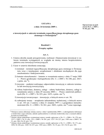 ©Kancelaria Sejmu s. 1/1 USTAWA Opracowano na podstawie Dz.U. z 2009 r. Nr 84, poz. 700. z dnia 24 kwietnia 2009 r. o inwestycjach w zakresie terminalu regazyfikacyjnego skroplonego gazu ziemnego w Świnoujściu1) Rozdział 1 Przepisy ogólne Art. 1. 1. Ustawa określa zasady przygotowania, realizacji i finansowania inwestycji w zakresie terminalu wymaganych ze względu na istotny interes bezpieczeństwa państwa oraz inwestycji towarzyszących. 2. Użyte w ustawie określenia oznaczają: 1) terminal – terminal regazyfikacyjny skroplonego gazu ziemnego w Świnoujściu wraz z instalacjami, urządzeniami i obiektami niezbędnymi dla jego uruchomienia i funkcjonowania; 2) kataster nieruchomości – kataster w rozumieniu ustawy z dnia 17 maja 1989 r. – Prawo geodezyjne i kartograficzne (Dz. U. z 2005 r. Nr 240, poz. 2027, z późn. zm.2)); 3) inwestor – podmiot realizujący odpowiednio inwestycję w zakresie terminalu lub inwestycję towarzyszącą; 4) roboty budowlane, dostawy, usługi – roboty budowlane, dostawy, usługi w rozumieniu ustawy z dnia 29 stycznia 2004 r. – Prawo zamówień publicznych (Dz. U. z 2007 r. Nr 223, poz. 1655, z późn. zm.3)); 5) inwestycje towarzyszące – inwestycje, o których mowa w art. 38; 6) uzbrojenie terenu – urządzenia infrastruktury technicznej, o których mowa w art. 143 ust. 2 ustawy z dnia 21 sierpnia 1997 r. o gospodarce nieruchomościami (Dz. U. z 2004 r. Nr 261, poz. 2603, z późn. zm.4)) oraz ropociągi. 1) Niniejsza ustawa dokonuje zmiany ustawy z dnia 3 października 2008 r. o udostępnianiu informacji o środowisku i jego ochronie, udziale społeczeństwa w ochronie środowiska oraz o ocenach oddziaływania na środowisko. 2) Zmiany tekstu jednolitego wymienionej ustawy zostały ogłoszone w Dz. U. z 2006 r. Nr 170, poz. 1217, z 2007 r. Nr 21, poz. 125, z 2008 r. Nr 201, poz. 1237 i Nr 227, poz. 1505 oraz z 2009 r. Nr 31, poz. 206 i Nr 42, poz. 334. 3) Zmiany tekstu jednolitego wymienionej ustawy zostały ogłoszone w Dz. U. z 2008 r. Nr 171, poz. 1058, Nr 220, poz. 1420 i Nr 227, poz. 1505 oraz z 2009 r. Nr 19, poz. 101 i Nr 65, poz. 545. 2009-06-09 ©Kancelaria Sejmu s. 2/2 Art. 2. 1. Inwestycje w zakresie terminalu realizują: Urząd Morski w Szczecinie, Zarząd Morskich Portów Szczecin i Świnoujście spółka akcyjna z siedzibą w Szczecinie, Operator Gazociągów Przesyłowych GAZ-SYSTEM spółka akcyjna z siedzibą w Warszawie oraz Polskie LNG spółka z ograniczoną odpowiedzialnością z siedzibą w Świnoujściu. 2. Inwestycjami w zakresie terminalu są następujące zadania inwestycyjne, realizowane przez: 1) Urząd Morski w Szczecinie: a) budowa infrastruktury zapewniającej dostęp do portu zewnętrznego, w tym falochronu, toru wodnego, obrotnicy oraz oznakowania nawigacyjnego związanego z wymienioną infrastrukturą, b) poszerzenie istniejącego toru wodnego do Świnoujścia, c) przebudowa istniejącego falochronu w Świnoujściu; 2) Zarząd Morskich Portów Szczecin i Świnoujście spółka akcyjna z siedzibą w Szczecinie: budowa infrastruktury portowej, w tym stanowiska statkowego wyposażonego w urządzenia cumownicze, odbojowe i nawigacyjne, a także infrastruktury umożliwiającej zamontowanie instalacji do przesyłu gazu i poboru wody z morza; 3) Operatora Gazociągów Przesyłowych GAZ-SYSTEM spółka akcyjna z siedzibą w Warszawie: budowa gazociągu Świnoujście – Szczecin, łączącego terminal z systemem przesyłowym, wraz z infrastrukturą niezbędną do jego obsługi na terenie województwa zachodniopomorskiego; 4) Polskie LNG spółka z ograniczoną odpowiedzialnością z siedzibą w Świnoujściu: budowa terminalu. 3. Operator Gazociągów Przesyłowych GAZ-SYSTEM spółka akcyjna z siedzibą w Warszawie koordynuje przebieg realizacji inwestycji w zakresie terminalu, w szczególności: 1) opracowuje harmonogram przygotowania i realizacji inwestycji w zakresie terminalu; 2) monitoruje wykonywanie zadań zgodnie z harmonogramem przez podmioty, o których mowa w ust. 1; 3) koordynuje obieg dokumentów i informacji między podmiotami, o których mowa w ust. 1; 4) monitoruje realizację inwestycji w zakresie terminalu i sporządza raporty oraz rekomenduje działania usprawniające proces realizacji inwestycji w zakresie terminalu. 4. Operator Gazociągów Przesyłowych GAZ-SYSTEM spółka akcyjna z siedzibą w Warszawie opracowuje harmonogram, o którym mowa w ust. 3 pkt 1, po za4) Zmiany tekstu jednolitego wymienionej ustawy zostały ogłoszone w Dz. U. z 2004 r. Nr 281, poz. 2782, z 2005 r. Nr 130, poz. 1087, Nr 169, poz. 1420 i Nr 175, poz. 1459, z 2006 r. Nr 64, poz. 456, Nr 104, poz. 708 i Nr 220, poz. 1600 i 1601, z 2007 r. Nr 69, poz. 468 i Nr 173, poz. 1218, z 2008 r. Nr 59, poz. 369 i Nr 220, poz. 1412 oraz z 2009 r. Nr 19, poz. 100 i Nr 42, poz. 335 i 340. 2009-06-09 ©Kancelaria Sejmu s. 3/3 sięgnięciu opinii pozostałych podmiotów, o których mowa w ust. 1. Harmonogram staje się wiążący dla podmiotów, o których mowa w ust. 1, po zatwierdzeniu przez ministra właściwego do spraw Skarbu Państwa. 5. Operator Gazociągów Przesyłowych GAZ-SYSTEM spółka akcyjna z siedzibą w Warszawie może, na podstawie umowy, powierzyć niezależnemu podmiotowi posiadającemu niezbędną wiedzę i doświadczenie wykonywanie określonych zadań z zakresu koordynacji. Umowę o powierzeniu zadań z zakresu koordynacji Operator Gazociągów Przesyłowych GAZ-SYSTEM spółka akcyjna z siedzibą w Warszawie zawiera po zasięgnięciu opinii pozostałych podmiotów, o których mowa w ust. 1. 6. Podmioty, o których mowa w ust. 1, są zobowiązane do przekazywania Operatorowi Gazociągów Przesyłowych GAZ-SYSTEM spółka akcyjna z siedzibą w Warszawie albo upoważnionemu podmiotowi, któremu zostały powierzone zadania z zakresu koordynacji, żądanych przez niego informacji dotyczących realizacji inwestycji w zakresie terminalu. 7. Operator Gazociągów Przesyłowych GAZ-SYSTEM spółka akcyjna z 