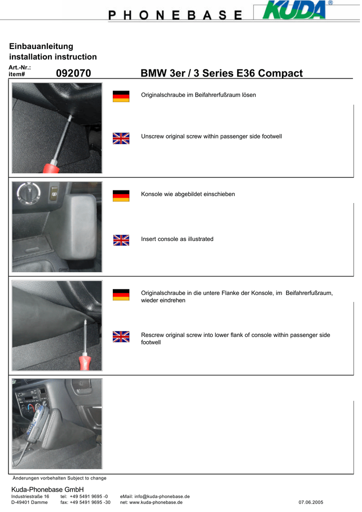 Einbauanleitung installation instruction Art.-Nr.: item# 092070 BMW 3er / 3 Series E36 Compact Originalschraube im Beifahrerfußraum lösen Unscrew original screw within passenger side footwell Konsole wie abgebildet einschieben Insert console as illustrated Originalschraube in die untere Flanke der Konsole, im Beifahrerfußraum, wieder eindrehen Rescrew original screw into lower flank of console within passenger side footwell Änderungen vorbehalten Subject to change Kuda-Phonebase GmbH Industriestraße 16 D-49401 Damme tel: +49 5491 9695 -0 fax: +49 5491 9695 -30 eMail: [email protected] net: www.kuda-phonebase.de 07.06.2005 instrucciones de instalación Instructions d´ installation art: 092070 BMW 3er / 3 Series E36 Compact Desserrez la vis originale dans le plancher de passager Destornille el tornillo original en el espacio de pies del acompañante Inserez la console comme illustré Meta la consola como mostrado Desserez de nouveau la vis originale à l´intérieure de la boîte à gants dans le flanc inférieur de la console Atornille el tornillo original en el flanco inferior de la consola en el espacio de pies del acompañante Nous nous réservons la possibilité de modification Salvo posibles modificaciones Kuda-Phonebase GmbH Industriestraße 16 D-49401 Damme tel: +49 5491 9695 -0 fax: +49 5491 9695 -30 eMail: [email protected] net: www.kuda-phonebase.de 07.06.2005 installatie instructie instrukcja montazu . art: 092070 BMW 3er / 3 Series E36 Compact Originele schroef in de voetenruimte van de passagier losdraaien Odkrecic oryginalna srube przy skrzyni biegów od strony kierowcy Konsole zoals afgebeeld inschuiven Wsunosc konsole, jak przedstawiono na zdjeciu. Originele schroef in de onderste flank van de konsole indraaien W bok uchwytu i tunelu przy skrzyni biegów wkrecic ponownie oryginalna srube Nous nous réservons la possibilité de modification Salvo posibles modificaciones FormenArtikel Kuda-Phonebase GmbH Industriestraße 16 D-49401 Damme 09207X tel: +49 5491 9695 -0 fax: +49 5491 9695 -30 eMail: [email protected] net: www.kuda-phonebase.de 07.06.2005