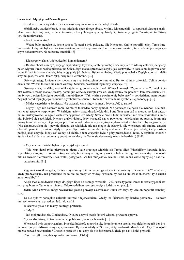 Hanna Krall, Zdążyć przed Panem Bogiem 1 Przed wieczorem wysłali trzech z opuszczonymi automatami i białą kokardą. Wołali, żeby zawiesić broń, to nas odeślą do specjalnego obozu. Myśmy ich ostrzelali – w raportach Stroopa znala złem potem tę scenę: oni, parlamentariusze, z białą chorągwią, a my, bandyci, otwieramy ogień. Zresztą nie trafiliśmy ich, ale to nieważne. – Jak to – nieważne? – Ważne było przecież to, że się strzela. To trzeba było pokazać. Nie Niemcom. Oni to potrafili lepiej. Temu inne mu światu, który nie był niemieckim światem, musieliśmy pokazać. Ludzie zawsze uważali, że strzelanie jest najwięk szym bohaterstwem. No to żeśmy strzelali. [7] – Dlaczego właśnie Anielewicz był komendantem? – Bardzo chciał nim być, więc go wybraliśmy. Był w tej ambicji trochę dziecinny, ale to zdolny chłopak, oczytany, pełen wigoru. Przed wojną mieszkał na Solcu. Jego matka sprzedawała ryby, jak zostawały, to kazała mu kupować czerwoną farbę i farbować skrzela, żeby wyglądały jak świeże. Był stale głodny. Kiedy przyjechał z Zagłębia do nas i dali śmy mu jeść, zasłaniał talerz ręką, żeby mu nie zabrano. […] Dziewiętnastego kwietnia nie spotkaliśmy się. Zobaczyłem go nazajutrz. Był to już inny człowiek. Celina powie działa mi: “Wiesz, to stało się z nim wczoraj. Siedział, powtarzał: zginiemy wszyscy...” […] Ósmego maja, na Miłej, zastrzelił najpierw ją, potem siebie. Jurek Wilner krzyknął: “Zgińmy razem”, Lutek Rot blat zastrzelił swoją matkę i siostrę, potem już wszyscy zaczęli strzelać, kiedy żeśmy się przedarli tam, znaleźliśmy kil ku żywych, osiemdziesięciu popełniło samobójstwo. “Tak właśnie powinno się było stać” – powiedziano nam potem. “Zginął naród, zginęli jego żołnierze. Symboliczna śmierć”. Tobie też pewnie takie symbole się podobają? […] – Miałeś czterdziestu żołnierzy. Nie przyszło wam nigdy na myśl, żeby zrobić to samo? – Nigdy. Tego nie należało robić. Mimo że to bardzo dobry symbol. Nie poświęca się życia dla symboli. Nie mia łem w tej sprawie wątpliwości. W każdym razie – przez dwadzieścia dni. Potrafiłem sam dać w mordę, jak ktoś zaczy nał mi histeryzować. W ogóle wiele rzeczy potrafiłem wtedy. Stracić pięciu ludzi w walce i nie czuć wyrzutów sumie nia. Położyć się spać, kiedy Niemcy drążyli dziury, żeby wysadzić nas w powietrze - wiedziałem po prostu, że my nie mamy tu nic do roboty. Dopiero jak poszli na obiad o dwunastej – myśmy szybko zrobili co trzeba, żeby się przedrzeć. (Nie denerwowałem się - pewnie dlatego, że właściwie nic nie mogło się zdarzyć. Nic większego niż śmierć, zawsze chodziło przecież o śmierć, nigdy o życie. Być może tam wcale nie było dramatu. Dramat jest wtedy, kiedy możesz podjąć jakąś decyzję, kiedy coś zależy od ciebie, a tam wszystko było z góry przesądzone. Teraz, w szpitalu, chodzi o życie – i za każdym razem muszę podejmować decyzję. Teraz się denerwuję znacznie bardziej.) [8-11] – Czy zza muru widać było coś po aryjskiej stronie? – Tak. Mur sięgał tylko pierwszego piętra. Już z drugiego widziało się Tamtą ulicę. Widzieliśmy karuzelę, ludzi, słyszeliśmy muzykę i strasznie żeśmy się bali, że ta muzyka zagłuszy nas i ci ludzie niczego nie zauważą, że w ogóle nikt na świecie nie zauważy - nas, walki, poległych... Że ten mur jest tak wielki – i nic, żadna wieść nigdy się o nas nie przedostanie. [11] Zygmunt wrócił do getta, napisaliśmy o wszystkim w naszej gazetce – i nie uwierzyli. “Oszaleliście?” – mówili, kiedy próbowaliśmy ich przekonać, że to nie do pracy ich wiozą. “Posłano by nas na śmierć z chlebem? Tyle chleba zmarnowaliby?!” Akcja trwała od dwudziestego drugiego lipca do ósmego września 1942, sześć tygodni. Przez te sześć tygodni sta łem przy bramie. Tu, w tym miejscu. Odprowadziłem czterysta tysięcy ludzi na ten plac.[...] Jeden tylko człowiek mógł powiedzieć głośno prawdę: Czerniaków. Jemu uwierzyliby. Ale on popełnił samobójstwo. To nie było w porządku: należało umrzeć z fajerwerkiem. Wtedy ten fajerwerk był bardzo potrzebny – należało umrzeć, wezwawszy przedtem ludzi do walki. Właściwie tylko o to mamy do niego pretensję. – “My”? – Ja i moi przyjaciele. Ci nieżyjący. O to, że uczynił swoją śmierć własną, prywatną sprawą. My wiedzieliśmy, że trzeba umierać publicznie, na oczach świata.[...] Większość była za powstaniem. Przecież ludzkość umówiła się, że umieranie z bronią jest piękniejsze niż bez bro ni. Więc podporządkowaliśmy się tej umowie. Było nas wtedy w ŻOB-ie już tylko dwustu dwudziestu. Czy to w ogóle można nazwać powstaniem? Chodziło przecież o to, żeby się nie dać zarżnąć, kiedy po nas z kolei przyszli. Chodziło tylko o wybór sposobu umierania. [13-15] Hanna Krall, Zdążyć przed Panem Bogiem 2 Bowiem okazało się, że on nie mówił tak, jak należy mówić. “A jak należy mówić?” – zapytał. Należy mówić z nienawiścią, patosem, krzycząc – nie ma innych sposobów wyrażenia tego wszystkiego niż krzyk. Więc on się od razu nie nadawał do mówienia, bo nie umiał krzyczeć. Nie nadawał się też na bohatera, bo nie było w nim patosu. Cóż to za prawdziwy pech. Ten jedyny, który przeżył, nie nadaje się na bohatera. [20-21] Pokazywali dziś w telewizji Krystynę Krahelską. Też miała jasne włosy. Pozowała Nitschowej do pomnika Syreny, pisała wiersze, śpiewała dumki i zginęła w warszawskim powstaniu wśród słoneczników. […] Był więc ciepły, sierpniowy dzień. Ona upięła sobie z tyłu te długie jasne włosy. Napisała “Hej, chłopcy, bagnet na broń”, opatrzyła rannego, a teraz biegnie w słońcu. Cóż to za piękne życie i piękna śmierć. Prawdziwie estetyczna 