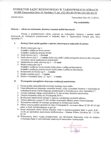 DYREKTOR SĄDU REJONOWEGO W TARNOWSKICH GORACH D10391176114 Tamowskie Góry 03.11.2014 r. Wg rozdzielnika Dotycry : ofeńa na wykonanie, dostawę i montaż mebli biurowych proszę o przedstawienie oferty cenowej na wykonanie, dostawę i montaz mebli biurowych do wybranych pomieszczeń w budynku sądu w Tamowskich Górach przy ulicy Opolskiej l7: I. Rodzaj i ilośćmebli zgodnie z opisem, stanowiącym załącznik do pisma: 1. ) J4. 5. 6. 7. 8. Biurko tradycyjne typ 1. 2 sztuki z szafką po lewej stronie 2 sztuhi z szafką po prawej stronie Szafa aktowa typ 2. - l0 sztuk Szafa aktowa typ 2. - 1 sztuka (tylko trzy półki i jedna przegroda pionowa aby wewnątrz o siem zanlłiętych ptzestrzeń) Nadstawka do szafy aktowej Ęp3. - 13 sztuk Biurko tradycyjne typ 4. 4 sztuki z szaką po lewej stronie (tylko jedno z półką na klawiaturę) 4 sztuki z szafką po prawej shonie (tylko jedno z półką na klawiaturę) Kontenerek do biurka typ 5. - 1 sztuka Szafka socjalna typ 6. - 1 szluka Biurko w ksżałcielitery,,L" tlp 7. - 1 sztuka o trzymać Wymagania szczególowe doĘczące realizacji zamówienia; 1, ,) 3. 4. 5. 6. 7. 8. 9. 10. Proszę podać cenę jednostkową brutto kżdego typu mebli. cena j ednostkowa obejmuje wszystkie koszty, wraz z kosźami dostawy i wniesienia do wskazanych prze z Zamańającego pomieszczeń w budyŃu przy ulicy Opolskiej 17. Termin realizacji całego zamówienia to 21 dni od daty złożeniazamówienia, Termin związania ofertą do 30 listopada 2014 r. Rozliczenie zamówienia nasĘpi w oparciu o podpisany protokół odbioru, Termin płatnościwynosi 21 dni od daty ohzyrnania faktury ptzez Zamańającego. Wykonawca udziela 24 miesiące gwarancji na dostarczone meble. ofertę cenową należy ptzesłń do dnia 12 listopada br. na numer faksu 32 381-83-35 lub adres e-mail: [email protected] |u7d ńożeniem ofeĄ można dokonać wizji w pomieszczeniach Sądu w godz. 8.30 14.30, po uprzednim umówieniu telefoniczrrym - Marian Wiktor Dyrektor iel. : 32 381 83 39. Wykonawca, który wygla. poĘpowanie, ma obowiązek dokonania wizji na miejscu w budynku Sądu w celu dobrania właściwychmaterialów i kolorysĘki. - Sąlu f.e ":r.: r:ł-: ,/n;;. - ,. c f ł51,:. ń"."ł\Ęt, SĄP HĘJQhJOWY ']7 Ul, opol3ka 42_600 TAiłNo\!§KlE GoRY tel. {032) 38l -B3 39 Opis mebli biurowych dla Sądu Rejonowego w Tamowskich Górach 1. Biurko tradycyjne z półĘ na klawiaturę komputerową - wymiary szer.140 x głęb.60 x wys.75 cm, > blat biurka wystaje o trzy centymetry poza nogi bocne i płytę przednią czołową, > płyta przednia czołowa nie sięga do podłogi , zaczyna się 3 0 cm od podłogi, > z Prawej lub lewej strony szaIka (szerokośó 40 cm) z dwiema półkami zamykana na zamek ,,patentoWy", > pod blatem umieszczona półka na klawiaturę o wymiarach 70x40 cm, zamocowana na metalowych szynach,/prowadnicach, > centralnie w blacie wykonany otw& wtaz z zaślepkąna przewody komputerowe, > elementy z płlty meblowej z laminatem olchowym, uchwYy metalowe, blaĘ biurek o grubości min. 25 mm 2. §zafa aktowa - wymiary wys.180 x szer.90 x głęb.45 cm. na cokole o wysokości 8 cm > > > > dwoje otwieranych drzwi , zarrtykane na zamek ,,patentowy", wewnątrz pięó półek o rozstawie co 26 cm, elementy z płyty meblowej z |aminatem bukowym, uchw}ty metalowe. Nadstawka do szaĘ aktowej - wymiary wys.60 x szer.90 x głęb.45 cm. > dwoj e otwieranych drrvłi, zanrrykane na zamek ,,patentowy", 3. > > 4. wewnątrz centralnie umieszczona j edna półka, elementy z płyty meblowej z laminatem bukowvm, uchwyty metalowe. Biurko tradycyjne z półką na klawiaturę komputerową - wymiary szer.lż} x głęb.60 > > > > > > 5. x wys.75 cm. blat biurka wystaje o trzy centymetry poza nogi boczrre i pĄtę przednią czołową, płyta przednia czołowa nie sięga do podłogi , zaczyna się 3 0 cm od podłogi, z ptawej lub lewej strony szafka (szerokośó 40 cm) z dwiema półkami zamykana na zamek ,,patentowy", pod blatem umieszczana półka na klawiaturę o wymiarach 70x40 cm, zamocowana na metalowych szynach,/prowadnicach, cenhalnie w blacie wykonany otwór wtaz z zńlepką na przewody komputerowe, elementy z płyty meblowej z laminatem bukowym, uchwyty metalowe, blaĘ biurek o grubości min. 25 mm Kontenerek do biurka - wymiary szer.40 x głęb.50 x wys.60 cm, > przosuwany na cźelech metalowych kółkach, > składa się ztrzech szlflad, zamykane na zamek ,,patentowy", > szuflał zamocowarre na metalowych szynaclr/prowadnicach, > elementy z płyty meblowej z laminatem bukorwm, uchwyty 6. > > > > metalowe. §zalka socjalna - wymiary szer.75 x głęb.42 x wys.86 cm na cokole o wysokości 8 cm dwoje otwieranych drzwi, zamykane na zamek,patentowy", wewnątrz jedna centralnie umieszczona półką elementy z płyty meblowej z laminatem debowvm, uchwly metalowe. 7. Biurko w kształcie litery ,,L'' - wymiary szer.2l} x g}ęb.l60 x wys.75 cm. blat biurka wystaje o trzy centymeĘ poza nogi boczre i płytę przednią czołową, jest rłykonany z jednej płyty > > > > > > p§ta przednia czołowa nie sięga do podłogi , zaczyna się 30 cm od podłogi, z prawej strony szafka (szerokośó 40 cm) z dwiema półkami zamykana na zamek ,,patentowy", z lewej strony trzy szuflady (szerokość40 cm) zamykule na zamek ,,patentowy'', w blacie wykonane dwa otwory wtaz z zaślepką na przewody komputerowe, oraz jeden w bocznej ściance(bok dhższy 160 cm), elementy z płyty meblowej z laminatem debowym, uchwyty metalowe, blat biurka o grubości min. 30 mm. Sądu a--a"a,,ia'!a'aj3 , RĘJONOWY SAD ' 17 42,60o rll Ooolqka iABŃoWSKlE GoRY tei. (o32) 38l-B3 39 Dotyczy: zapytani€ olertowe Dl039ll76l14 Szkic biurka w ksźałcielitery ,,L" - typ 7 . Ągr,^ 2 /,O cyn