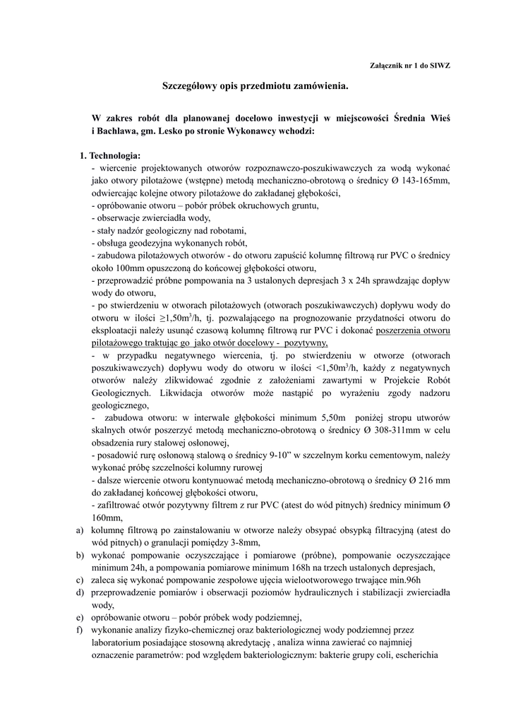 Załącznik nr 1 do SIWZ Szczegółowy opis przedmiotu zamówienia. W zakres robót dla planowanej docelowo inwestycji w miejscowości Średnia Wieś i Bachlawa, gm. Lesko po stronie Wykonawcy wchodzi: 1. Technologia: - wiercenie projektowanych otworów rozpoznawczo-poszukiwawczych za wodą wykonać jako otwory pilotażowe (wstępne) metodą mechaniczno-obrotową o średnicy Ø 143-165mm, odwiercając kolejne otwory pilotażowe do zakładanej głębokości, - opróbowanie otworu – pobór próbek okruchowych gruntu, - obserwacje zwierciadła wody, - stały nadzór geologiczny nad robotami, - obsługa geodezyjna wykonanych robót, - zabudowa pilotażowych otworów - do otworu zapuścić kolumnę filtrową rur PVC o średnicy około 100mm opuszczoną do końcowej głębokości otworu, - przeprowadzić próbne pompowania na 3 ustalonych depresjach 3 x 24h sprawdzając dopływ wody do otworu, - po stwierdzeniu w otworach pilotażowych (otworach poszukiwawczych) dopływu wody do otworu w ilości ≥1,50m3/h, tj. pozwalającego na prognozowanie przydatności otworu do eksploatacji należy usunąć czasową kolumnę filtrową rur PVC i dokonać poszerzenia otworu pilotażowego traktując go jako otwór docelowy - pozytywny, - w przypadku negatywnego wiercenia, tj. po stwierdzeniu w otworze (otworach poszukiwawczych) dopływu wody do otworu w ilości <1,50m3/h, każdy z negatywnych otworów należy zlikwidować zgodnie z założeniami zawartymi w Projekcie Robót Geologicznych. Likwidacja otworów może nastąpić po wyrażeniu zgody nadzoru geologicznego, - zabudowa otworu: w interwale głębokości minimum 5,50m poniżej stropu utworów skalnych otwór poszerzyć metodą mechaniczno-obrotową o średnicy Ø 308-311mm w celu obsadzenia rury stalowej osłonowej, - posadowić rurę osłonową stalową o średnicy 9-10” w szczelnym korku cementowym, należy wykonać próbę szczelności kolumny rurowej - dalsze wiercenie otworu kontynuować metodą mechaniczno-obrotową o średnicy Ø 216 mm do zakładanej końcowej głębokości otworu, - zafiltrować otwór pozytywny filtrem z rur PVC (atest do wód pitnych) średnicy minimum Ø 160mm, a) kolumnę filtrową po zainstalowaniu w otworze należy obsypać obsypką filtracyjną (atest do wód pitnych) o granulacji pomiędzy 3-8mm, b) wykonać pompowanie oczyszczające i pomiarowe (próbne), pompowanie oczyszczające minimum 24h, a pompowania pomiarowe minimum 168h na trzech ustalonych depresjach, c) zaleca się wykonać pompowanie zespołowe ujęcia wielootworowego trwające min.96h d) przeprowadzenie pomiarów i obserwacji poziomów hydraulicznych i stabilizacji zwierciadła wody, e) opróbowanie otworu – pobór próbek wody podziemnej, f) wykonanie analizy fizyko-chemicznej oraz bakteriologicznej wody podziemnej przez laboratorium posiadające stosowną akredytację , analiza winna zawierać co najmniej oznaczenie parametrów: pod względem bakteriologicznym: bakterie grupy coli, escherichia g) h) i) j) coli, enterokoki kałowe, Clostridium perfringens, ogólna liczba mikroorganizmów w 22°C po 72h, pod względem fizykochemicznym: mętność, barwa, zapach, odczyn pH, przewodność, twardość, azotany, azotyny, jon amonowy, żelazo, mangan, chlorki, siarczany w zakresie zgodnym z Projektem Robót Geologicznych: niwelacja otworu w dowiązaniu do państwowej sieci geodezyjnej (w tym również ewentualnych otworów negatywnych), wykonanie obudowy powierzchniowej studni za pomocą kopca ziemnego ze schodami. Minimalna wysokość kopca powinna być 0,5mb wyżej niż maksymalny poziom wód zalewowych wody 500-letniej. Obudowę należy wykonać ze szczelnie spoinowanych kręgów betonowych nastudziennych o średnicy zewnętrznej Ø 2000mm wyposażonych w stopnie złazowe i pokrywę betonową ze szczelnym włazem stalowy zamykanym, właz umieszczony centralnie nad rurą wierconej studni. Dno studni wybetonować. wyposażenie kolumny filtrowej w części powierzchniowej obudowy w głowicę studzienną wykonaną z tworzywa sztucznego np. PVC-U z pokrywą, uzbrojenie otworu studziennego: - pompa głębinowa – zastosowana pompa głębinowa winna spełniać warunki w dostosowaniu do stwierdzonych parametrów hydrogeologicznych ujęcia oraz jego przeznaczenia (wydajność pompy, wznios, średnica), ponadto zastosować należy pompę wyposażoną w zespół tłoczny (wirniki) wykonane ze stali nierdzewnej. Pompa powinna posiadać silnik trójfazowy dostosowany do parametrów studni, - kabel zasilający w igielicie, - zawory, cybanty, złączki – odpowiednio dostosowane - manometr, - wodomierz, - rura PE o odpowiedniej średnicy , - urządzenie zabezpieczająco-sterujące UZS z fundamentem i gniazdem, - linka nierdzewna chromoniklowa do zamocowania pompy o średnicy minimum 8 mm. - sonda suchobiegu, - trójnik i kranik do poboru wody surowej. 2. Roboty towarzyszące. 1. Ze względu na lokalizację planowanego ujęcia wody w okolicach linii brzegowej rzeki San i związanym z tym realnym zagrożeniem zalewania wodami powodziowymi planowanego ujęcia wody konieczne może być wykonanie szeregu robót towarzyszących: a) Wykonanie szczelnej bariery iniekcyjnej metodą otworową, konieczność wykonania tych robót należy udokumentować i uzyskać akceptację Zamawiającego. b) Odwiercenie min. 4 sztuk otworów pełnordzeniowych w obrębie bezpośredniego sąsiedztwa obudowy każdego ujęcia (studni) – średnia głębokość otworów – minimum 5,5 m poniżej poziomu stropu utworów skalnych c) Wykonanie iniekcji strefowej niskociśnieniowej w w/w otworach materiałem żelowym posiadającym atest higieniczny dopuszczający produkt do kontaktu z wodami pitnymi. 2. W celu likwidacji niekorzystnych zjawisk filtracji wody zalewowej przez podłoże do obudowy ujęcia studni należy wykonać zawieszoną przesłonę iniekcyjną w postaci otworów iniekcyjnych zlokalizowanych w pierścieniu wkoło obudowy. Rozstaw otworów co ok. 0,9m, średnica wiercenia 93-112