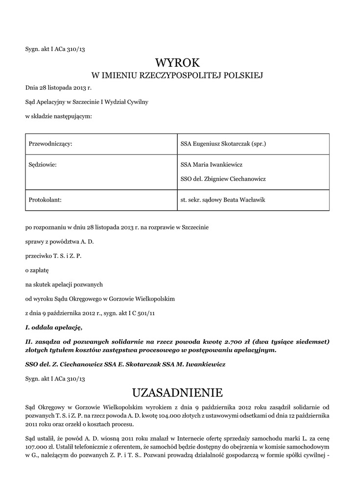 Sygn. akt I ACa 310/13 WYROK W IMIENIU RZECZYPOSPOLITEJ POLSKIEJ Dnia 28 listopada 2013 r. Sąd Apelacyjny w Szczecinie I Wydział Cywilny w składzie następującym: Przewodniczący: SSA Eugeniusz Skotarczak (spr.) Sędziowie: SSA Maria Iwankiewicz SSO del. Zbigniew Ciechanowicz Protokolant: st. sekr. sądowy Beata Wacławik po rozpoznaniu w dniu 28 listopada 2013 r. na rozprawie w Szczecinie sprawy z powództwa A. D. przeciwko T. S. i Z. P. o zapłatę na skutek apelacji pozwanych od wyroku Sądu Okręgowego w Gorzowie Wielkopolskim z dnia 9 października 2012 r., sygn. akt I C 501/11 I. oddala apelację, II. zasądza od pozwanych solidarnie na rzecz powoda kwotę 2.700 zł (dwa tysiące siedemset) złotych tytułem kosztów zastępstwa procesowego w postępowaniu apelacyjnym. SSO del. Z. Ciechanowicz SSA E. Skotarczak SSA M. Iwankiewicz Sygn. akt I ACa 310/13 UZASADNIENIE Sąd Okręgowy w Gorzowie Wielkopolskim wyrokiem z dnia 9 października 2012 roku zasądził solidarnie od pozwanych T. S. i Z. P. na rzecz powoda A. D. kwotę 104.000 złotych z ustawowymi odsetkami od dnia 12 października 2011 roku oraz orzekł o kosztach procesu. Sąd ustalił, że powód A. D. wiosną 2011 roku znalazł w Internecie ofertę sprzedaży samochodu marki L. za cenę 107.000 zł. Ustalił telefonicznie z oferentem, że samochód będzie dostępny do obejrzenia w komisie samochodowym w G., należącym do pozwanych Z. P. i T. S.. Pozwani prowadzą działalność gospodarczą w formie spółki cywilnej - komis samochodowy o nazwie Przedsiębiorstwo (...) S.C. z siedzibą ul. (...) w G. Samochód miał być zakupiony na potrzeby prywatne powoda i jego rodziny, aby korzystać z niego podczas wyjazdów rodzinnych czy w celu dowożenia żony powoda na rehabilitację. Dotychczasowy samochód powoda uległ zniszczeniu podczas wypadku i niezbędny stał się zakup nowego pojazdu. Oferent podał powodowi adres komisu. Powód wraz z żoną M. D. w dniu 01.04.2011 r. pojechali do G. do komisu pozwanych, aby obejrzeć samochód. W czasie oględzin powód zauważył mankamenty pojazdu tj. nieoryginalne koła oraz braki w lakierze, w związku z czym zaproponował obniżenie początkowo oferowanej ceny sprzedaży. Ostatecznie ustalono, iż cena ulegnie obniżeniu o 3.000 zł od uprzednio oferowanej. W trakcie wizyty w komisie samochód okazywała powodowi i jego żonie osoba, która przedstawiła się jako upoważniona przez właściciela pojazdu. Po jeździe próbnej samochodem powód podjął decyzję o zakupie pojazdu i jeszcze tego samego dnia tj. 01.04.2011 r. wpłacił zadatek w kwocie 30.000 złotych tj. w tym samym dniu wybrał pieniądze z konta bankowego i wpłacił w komisie. W dniu 1 kwietnia 2011 r. powód zawarł z pozwanymi umowę kupna pojazdu i na poczet ceny wpłacił zadatek w kwocie 30.000 złotych. Jak wskazano w treści umowy część ceny w kwocie 14 tys. zł zostanie przelana na konto bankowe komisu, zaś pozostała część ceny w kwocie 60.000 zł - zostanie uiszczona po uzyskaniu przez powoda kredytu bankowego. Na okoliczność dokonania umowy sprzedaży pomiędzy stronami została w tym samym dniu tj. 01.04.2011 r. wystawiona przez pozwanych w ramach prowadzonej przez nich działalności gospodarczej – faktura Vat marża nr (...). Jako kupującego wskazano w fakturze powoda A. D., zamieszkałego w K. przy ul. (...). Powód zakupił pojazd do użytku osobistego. Na fakturze wskazano przedmiot sprzedaży: samochód osobowy marki L. (...) nr rej. (...), rok produkcji 2008 r., nr nadwozia (...), pojemność silnika 3311 cm( 3), kwotę brutto pojazdu 104.000 zł oraz wysokość dokonanej wpłaty tj. 44.000 zł. Pozostałą cenę pojazdu powód zobowiązał się uregulować po uzyskaniu kredytu bankowego. Na fakturze wskazano również, iż pojazd został dostarczony przez komitenta W. W. zamieszkałego w G. W dniu 04.04.2011 r. powód zawarł z bankiem umowę kredytu na zakup samochodu L. (...), będącego przedmiotem wskazanej umowy sprzedaży i w dniu 5 kwietnia 2011 r. przelał pozwanym kwotę, stanowiącą pozostałą do zapłaty część ceny sprzedaży samochodu tj. 60.000 zł. Płatności dokonał na konto bankowe komisu, prowadzonego przez pozwanych. Po dokonaniu płatności zadzwonił do komisu z pytaniem, czy pozwani otrzymali pieniądze, w międzyczasie powód (dysponując tablicami rejestracyjnymi samochodu) zarejestrował samochód w miejscu swojego zamieszkania i przyjechał do G. po jego odbiór. W dniu 18 lipca 2011 r. funkcjonariusze CBŚ dokonali przeszukania pomieszczeń mieszkalnych i gospodarczych, należących do powoda. W trakcie przeszukania funkcjonariusze zatrzymali pojazd należący do powoda - samochód osobowy marki L. (...) nr rej (...), kartę pojazdu oraz dwa komplety kluczy wraz z pilotem. W dniu 25 lipca 2011 r. Prokurator Okręgowy w G. wydał w sprawie V Ds. 22/11 postanowienie o zatwierdzeniu przeszukania, które miało miejsce w dniu 18.07.2011 r. w związku z podejrzeniem, iż zatrzymany pojazd pochodzi z przestępstwa. W dniu 29 sierpnia 2011 r. Centralne Biuro Śledcze Komenda Główna Policji w W. wydało postanowienie w przedmiocie dowodów rzeczowych, uznając za dowód rzeczowy w sprawie m.in. samochód osobowy marki L. model (...) (Hybryda) z przymocowanymi tablicami rejestracyjnymi o wyróżniku (...), kolor szary metalik, posiadający fałszywy numer nadwozia (...) (podczas gdy pierwotny numer VIN to (...)). Ustalono, iż wskazany samochód, będący przedmiotem umowy sprzedaży zawartej pomiędzy powodem a pozwanymi, został uzyskany w wyniku działania grupy przestępczej zajmującej się kradzieżami samochodów na terenie Niemiec i orzeczono jego zwrot właścicielowi - obywatelowi Niemiec. W dniu 20 września 2011 r. uchylono decyzję Prezydenta Miasta K. o zarejestrowaniu na rzecz powoda pojazdu marki L. (...), unieważniając tablice rejestracyjne, dowód rejestracyjny oraz kartę pojazdu, z uwagi na fakt, iż przeniesienie prawa własno