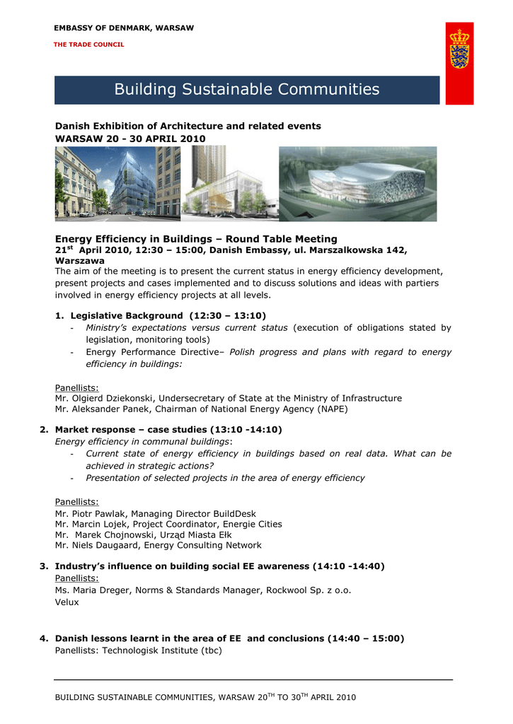 EMBASSY OF DENMARK, WARSAW THE TRADE COUNCIL Building Sustainable Communities Danish Exhibition of Architecture and related events WARSAW 20 - 30 APRIL 2010 Energy Efficiency in Buildings – Round Table Meeting 21st April 2010, 12:30 – 15:00, Danish Embassy, ul. Marszalkowska 142, Warszawa The aim of the meeting is to present the current status in energy efficiency development, present projects and cases implemented and to discuss solutions and ideas with partiers involved in energy efficiency projects at all levels. 1. Legislative Background (12:30 – 13:10) - Ministry’s expectations versus current status (execution of obligations stated by legislation, monitoring tools) - Energy Performance Directive– Polish progress and plans with regard to energy efficiency in buildings: Panellists: Mr. Olgierd Dziekonski, Undersecretary of State at the Ministry of Infrastructure Mr. Aleksander Panek, Chairman of National Energy Agency (NAPE) 2. Market response – case studies (13:10 -14:10) Energy efficiency in communal buildings: - Current state of energy efficiency in buildings based on real data. What can be achieved in strategic actions? - Presentation of selected projects in the area of energy efficiency Panellists: Mr. Piotr Pawlak, Managing Director BuildDesk Mr. Marcin Lojek, Project Coordinator, Energie Cities Mr. Marek Chojnowski, Urząd Miasta Ełk Mr. Niels Daugaard, Energy Consulting Network 3. Industry’s influence on building social EE awareness (14:10 -14:40) Panellists: Ms. Maria Dreger, Norms & Standards Manager, Rockwool Sp. z o.o. Velux 4. Danish lessons learnt in the area of EE and conclusions (14:40 – 15:00) Panellists: Technologisk Institute (tbc) BUILDING SUSTAINABLE COMMUNITIES, WARSAW 20TH TO 30TH APRIL 2010 EMBASSY OF DENMARK, WARSAW THE TRADE COUNCIL Participants: - Ministry of Infrastructure - Undersecretary of State, Mr. Olgierd Dziekonski - Energy Consulting Network, Mr. Nils Daugaard – project ‘Clear Support’ supported by EU’s Energy Europe Programme - NAPE National Energy Agency – Chairman, Mr. Aleksander Panek - Build Desk, Managing Director, Mr. Piotr Pawlak - Association of Municipalities - Energy Cities, Marcin Lojek, coordinator of the project Energy Certificates for municipal buildings, financed NFOSIGW - Association of Architects, Chairman, Mr. Jerzy Grochulski - Polish Chamber of Construction Enginers - Mr. Jerzy Kosowski - Polish Association of Developers – Chairman, Mr. Jarosław Szanajca - Building Research Institute - Chairman Mr. Marek Kapron - Polish Association of Facility Management - Chairman Mr.Bogdan Zagorski - Society of Polish Town Planners – Chaiman, Mr. Tadeusz Markowski - Rockwool Polska Sp . z o.o. ,Maria Dreger - Velux Polska Sp. z o.o. Journalists: - Doradca Energetyczny, Elzbieta Socha - Architektura – Murator () - Rzeczpospolita – Magdalena Kozmana - Energia i Budynek – Miroslaw Jankowski Honorary Patronage Partners Main Business Partner Business Partners Media Partners BUILDING SUSTAINABLE COMMUNITIES, WARSAW 20TH TO 30TH APRIL 2010