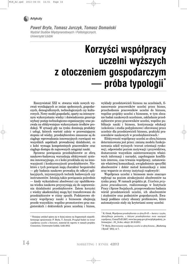 MiR_A2.qxd 2013-04-03 14:51 Page 14 Artykuły Paweł Bryła, Tomasz Jurczyk, Tomasz Domański Wydział Studiów Międzynarodowych i Politologicznych, Uniwersytet Łódzki Korzyści współpracy uczelni wyższych z otoczeniem gospodarczym * — próba typologii Rzeczywistość XXI w. stwarza wiele nowych wyzwań wynikających ze zmian społecznych, gospodarczych, demograficznych, technologicznych czy kulturowych. Nowy model gospodarki, oparty na intensywnym wykorzystaniu wiedzy i doświadczenia generuje szybszy postęp technologiczno-organizacyjny oraz pozwala na efektywniejsze wykorzystanie środków produkcji. W sytuacji gdy na rynku dominują produkty i usługi, których wartość zależy w przeważającym stopniu od wiedzy, przedsiębiorstwa zmuszone są do ciągłego wprowadzania innowacyjnych rozwiązań we wszystkich aspektach prowadzonej działalności, co z kolei wymaga kompetentnych pracowników oraz ciągłego dostępu do najnowszych osiągnięć nauki. Sprawne powiązania przedsiębiorstw ze sferą naukowo-badawczą warunkują efektywność systemu innowacyjnego, co z kolei przekłada się na innowacyjność i konkurencyjność przedsiębiorstw. Niektóre z tych powiązań mają charakter bezpośredni — gdy badania naukowe prowadzą do odkryć aplikacyjnych, inżynieryjnych technik badawczych czy instrumentów. Istnieją także powiązania pośrednie — kiedy wykształceni absolwenci czy opublikowana wiedza naukowa przyczyniają się do usprawnienia działalności przedsiębiorstw. Zatem korzyści z wiedzy akademickiej mogą być transferowane do przedsiębiorstw w różny sposób. Podstawowe obszary współpracy nauki z biznesem obejmują przede wszystkim: wspólne promotorstwo prac magisterskich i doktorskich przez uczelnię i biznes, wykłady przedstawicieli biznesu na uczelniach, finansowanie pracowników uczelni przez biznes, przechodzenie pracowników uczelni do biznesu, wspólne projekty uczelni z biznesem, w tym zlecanie badań naukowych uczelniom, zakładanie przedsiębiorstw przez pracowników uczelni, wspólne publikacje nauki i biznesu, kontynuację edukacji (szkolenia i studia podyplomowe) oferowanej przez uczelnie dla przedstawicieli biznesu, praktyki pracowników naukowych w przedsiębiorstwach.1 Efektywność współpracy uczelni ze sferą biznesu determinowana jest przez: zmianę modelu funkcjonowania szkół wyższych (wzrost orientacji rynkowej), odpowiedni poziom motywacji i przywództwa, dostarczenie wszystkim zainteresowanym właściwych informacji i narzędzi, zapobieganie konfliktom interesu, czas trwania współpracy, ustanowienie właściwej komunikacji, uwzględnienie specyfiki absolwentów i dobór metod komunikacji z nimi oraz wsparcie ze strony instytucji rządowych2. Współpraca uczelni z biznesem może znacząco wpłynąć na poziom atrakcyjności absolwentów na rynku pracy. W ramach projektu pt. Uczelnia przyjazna pracodawcom, realizowanego w Instytucie Pracy i Spraw Socjalnych, przeprowadzono badania wśród przedstawicieli uczelni, ich absolwentów i studentów oraz podmiotów gospodarczych. Ewaluacji poddano cztery obszary problemowe, które automatycznie stały się kryteriami oceny uczelni: 1 K. Górak, Współpraca przedsiębiorstw ze sferą B+R — bariery i ryzyko, * Niniejszy artykuł opiera się w dużej mierze na fragmentach niepublikowanego opracowania: P. Bryła, T. Jurczyk, Przegląd badań na temat współpracy uczelni z biznesem, materiał do raportu w ramach projektu Connection, Uniwersytet Łódzki, Łódź 2012. identyfikacja partnerów, z którymi przedsiębiorstwo może nawiązać współpracę, ConsulTriX 2007, www.ksu.parp.gov.pl/res/pl/pk/pakiety_informacyjne/.../01_14.doc, odczyt: 28.10.2011. 2 P. Bryła, Determinanty współpracy uczelni ze sferą biznesu, „Marketing i Rynek” 2012, nr 7. 14 MARKETING I RYNEK 4/2013 MiR_A2.qxd 2013-04-03 15:16 Page 15 Artykuły Tablica 1. Klasyfikacja korzyści wynikających ze współpracy uczelni z otoczeniem gospodarczym według kategorii beneficjentów Kategorie beneficjentów Instytucje akademickie Korzyści ze współpracy uczelni z biznesem z z z z Studenci z z z z Absolwenci z z z z Przedsiębiorstwa z z z z z z z zwiększenie rozpoznawalności uczelni wśród pracodawców i kandydatów poprawa jakości kształcenia i badań korzyści finansowe wypełnienie zobowiązań prawnych zwiększenie potencjalnych szans na zatrudnienie po studiach pozyskanie wynagrodzenia od firm za wykonane prace zaliczenie praktyk zawodowych budowa sieci kontaktów w środowisku biznesu satysfakcja osobista korzyści materialne rozwój kariery obserwacja kandydatów do pracy zmniejszenie kosztów i ryzyka działalności podnoszenie jakości kapitału ludzkiego wykorzystanie uczelni jako źródła idei promowanie wizerunku firmy jako atrakcyjnego partnera stworzenie sieci kontaktów ze środowiskiem akademickim rozwój nowych produktów i usług pomoc praktykantów w rozwiązywaniu problemów firmy Ź r ó d ł o: opracowanie własne. z stopień dostosowania absolwentów uczelni do wymogów rynku pracy, z współpracę pomiędzy uczelniami a przedsiębiorcami, z możliwości rozwoju kariery zawodowej po ukończeniu studiów na danej uczelni, z luki kompetencyjne absolwentów. Badanie przeprowadzono przy użyciu techniki CAWI (Computer Assisted Web Interview), polegającej na wypełnieniu ankiety znajdującej się na stronie WWW projektu3. Wyniki tego badania potwierdziły, że podczas naboru pracowników przedsiębiorcy zwracają uwagę głównie na kompetencje rzeczywiście posiadane przez absolwentów uczelni. Najczęściej wskazywaną przez pracodawców umiejętnością deficytową była zdolność łączenia teorii z praktyką. Znaczna skala deficytu występuje również w przypadku umiejętności organizacji pracy, obsługi klienta, rozwiązywania problemów czy znajomości języków obcych. Efektywna współpraca obu stron powinna przynieść korzyści wszystkim zaangażowanym partnerom. 