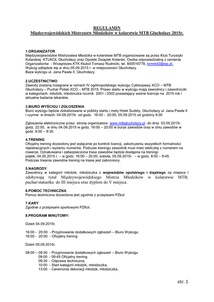 REGULAMIN Międzywojewódzkich Mistrzostw Młodzików w kolarstwie MTB Głuchołazy 2015r. 1.ORGANIZATOR Międzywojewódzkie Mistrzostwa Młodzika w kolarstwie MTB organizowane są przez Klub Turystyki Kolarskiej KTUKOL Głuchołazy oraz Opolski Związek Kolarski. Osoba odpowiedzialną z ramienia Organizatorów - Wiceprezes KTK Ktukol Tomasz Rudnicki, tel. 600516778, [email protected], Wyścig odbędzie się w dniu 05.09.2015 r. w miejscowości Głuchołazy. Baza wyścigu ul. Jana Pawła II, Głuchołazy. 2.UCZESTNICTWO Zawody zostaną rozegrane w ramach IV ogólnopolskiego wyścigu Cykloopawy XCO – MTB Głuchołazy – Puchar Polski XCO – MTB 2015. Prawo startu w wyścigu mają zawodnicy i zawodniczki w kategoriach: młodzik, młodziczka rocznik 2001 i 2002 posiadający ważne licencje na 2015 rok i aktualne badania lekarskie. 3.BIURO WYŚCIGU I ZGŁOSZENIA Biuro wyścigu będzie zlokalizowane w pobliży startu i mety Hotel Sudety, Głuchołazy ul. Jana Pawła II i czynne w dniach: 04-09.2015r. od godz. 16:00 - 20:00, 05.09.2015 od godziny 8.00 Zgłoszenia elektroniczne przez stronę organizatora www.mtbglucholazy.pl do dnia 03.09.2015r. godz. 22:00, w dniu 04.09.2015 w godz. 16:00 – 20:00 w burze zawodów oraz w dniu zawodów w godz. 8:00 – 9:30. 4.TRENING Oficjalny trening dozwolony jest wyłącznie po kontroli licencji, zakończeniu wszystkich formalności rejestracyjnych i wydaniu numerów. Podczas treningu zawodnik musi mieć tabliczkę z numerem na rowerze. Oznakowana i zabezpieczona trasa zawodów będzie dostępna na treningi: piątek, 04.05.2015 r. – w godz. 16:00 – 20.00, sobota, 05.09.2015r. – w godz. 8:00 – 9:45. Podczas trwania zawodów trening na trasie jest zabroniony. 5.NAGRODY Zawodnicy w kategorii młodzik, młodziczka z województw opolskiego i śląskiego za miejsce I zdobywają tytuł Międzywojewódzkiego Mistrza Młodzików puchar/statuetka do III miejsca oraz dyplom do V miejsca. w kolarstwie MTB, 6.POMOC TECHNICZNA Pomoc techniczna dozwolona jest zgodnie z przepisami PZkol 7.KARY Zgodnie z przepisami sportowymi PZKol. 8.PROGRAM MINUTOWY: Dzień 04.09.2015r. 16:00 - 20:00 - Przyjmowanie dodatkowych zgłoszeń – Biuro Wyścigu 16:00 - 20:00 - Oficjalny trening Dzień 05.09.2015r. 08:00 – 09:30 08:00 09:30 10:00 13:00 - Przyjmowanie dodatkowych zgłoszeń – Biuro Wyścigu - 09:45 Oficjalny trening - Odprawa techniczna, - Start kategorii młodzik, młodziczka, - Ceremonia dekoracji młodzik, młodziczka, str. 1 9.TRASA Baza wyścigu Głuchołazy ul. Jana Pawła II – Hotel Sudety. Trasa położona na zboczach Góry Parkowej. Start i meta 10 m od bazy wyścigu. Wyścigi rozegrane zostaną na trasie okrężnej w terenie leśnym o zróżnicowanym podłożu i wysokości.. Długość rundy 1500 m. Wyścigi rozegrane zostaną w klasyfikacji indywidualnej, norma czasu 0h30min – 0h45min 10.ZASADY BEZPIECZEŃSTWA Zawodnicy i osoby towarzyszące musza posiadać ubezpieczenie od OC i NW 11.KONTROLA ANTYDOPINGOWA Podczas wyścigu obowiązują przepisy antydopingowe UCI/PZKol. Badania antydopingowe będą przeprowadzane w budynku Hotelu Sudety w Głuchołazach , ul. Jana Pawła II nr 25, 10m od linii start/meta 12.WYKAZ SZPITALI W POBLIŻU TRASY Szpital - Samodzielny Publiczny Zakład Opieki Zdrowotnej ZOZ, ul. M.C. Skłodowskiej 16, 48-340 GŁUCHOŁAZY, tel.+48 (77) 439 19 50..51, (77) 451 12 55 13.POSTANOWIENIA KOŃCOWE : Wyścig rozegrany zostanie zgodnie z przepisami PZKOL i niniejszym regulaminem, Koszty organizacyjne pokrywa organizator. Koszty uczestnictwa pokrywają zainteresowane kluby. Organizator zapewnia na mecie wyścigu gorący posiłek dla zawodników oraz pkt. mycia rowerów. Organizator nie ponosi odpowiedzialności za wypadki na trasie wyścigu oraz za rzeczy zaginione lub skradzione, We wszystkich sprawach nie objętych regulaminem będzie decydował Sędzia Główny w porozumieniu z Organizatorem. Wszelkie dodatkowe informacje/komunikaty umieszczone zostaną na stronie: www.mtbglucholazy.pl oraz w dniu zawodów na tablicy obok biura zawodów – zawodnicy i opiekunowie mają obowiązek się z nimi zapoznać. Regulamin zatwierdzony przez OZKol w dniu 23.07.2015r. str. 2
