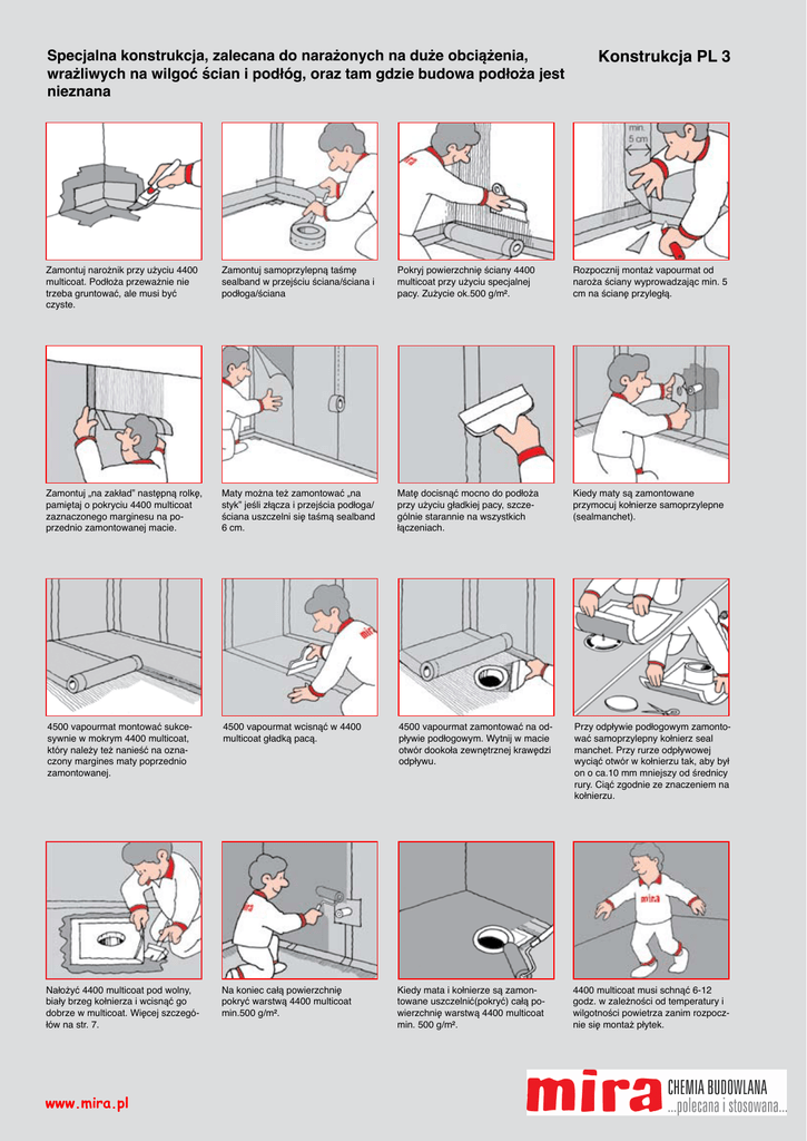 Specjalna konstrukcja, zalecana do narażonych na duże obciążenia, wrażliwych na wilgoć ścian i podłóg, oraz tam gdzie budowa podłoża jest nieznana Konstrukcja PL 3 Zamontuj narożnik przy użyciu 4400 multicoat. Podłoża przeważnie nie trzeba gruntować, ale musi być czyste. Zamontuj samoprzylepną taśmę sealband w przejściu ściana/ściana i podłoga/ściana Pokryj powierzchnię ściany 4400 multicoat przy użyciu specjalnej pacy. Zużycie ok.500 g/m². Rozpocznij montaż vapourmat od naroża ściany wyprowadzając min. 5 cm na ścianę przyległą. Zamontuj „na zakład” następną rolkę, pamiętaj o pokryciu 4400 multicoat zaznaczonego marginesu na poprzednio zamontowanej macie. Maty można też zamontować „na styk” jeśli złącza i przejścia podłoga/ ściana uszczelni się taśmą sealband 6 cm. Matę docisnąć mocno do podłoża przy użyciu gładkiej pacy, szczególnie starannie na wszystkich łączeniach. Kiedy maty są zamontowane przymocuj kołnierze samoprzylepne (sealmanchet). 4500 vapourmat montować sukcesywnie w mokrym 4400 multicoat, który należy też nanieść na oznaczony margines maty poprzednio zamontowanej. 4500 vapourmat wcisnąć w 4400 multicoat gładką pacą. 4500 vapourmat zamontować na odpływie podłogowym. Wytnij w macie otwór dookoła zewnętrznej krawędzi odpływu. Przy odpływie podłogowym zamontować samoprzylepny kołnierz seal manchet. Przy rurze odpływowej wyciąć otwór w kołnierzu tak, aby był on o ca.10 mm mniejszy od średnicy rury. Ciąć zgodnie ze znaczeniem na kołnierzu. Nałożyć 4400 multicoat pod wolny, biały brzeg kołnierza i wcisnąć go dobrze w multicoat. Więcej szczegółów na str. 7. Na koniec całą powierzchnię pokryć warstwą 4400 multicoat min.500 g/m². Kiedy mata i kołnierze są zamontowane uszczelnić(pokryć) całą powierzchnię warstwą 4400 multicoat min. 500 g/m². 4400 multicoat musi schnąć 6-12 godz. w zależności od temperatury i wilgotności powietrza zanim rozpocznie się montaż płytek. www.mira.pl