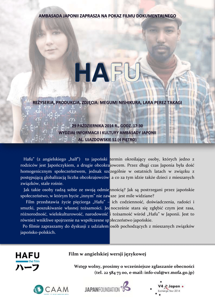 Hafu” (z angielskiego „half”) to japoński termin określający osoby, których jedno z rodziców jest Japończykiem, a drugie obcokrajowcem. Przez długi czas Japonia była dość homogenicznym społeczeństwem, jednak szczególnie w ostatnich latach w związku z postępującą globalizacją liczba obcokrajowców, a co za tym idzie także dzieci z mieszanych związków, stale rośnie. Jak takie osoby radzą sobie ze swoją odmiennością? Jak są postrzegani przez japońskie społeczeństwo, w którym bycie „innym” nie zawsze jest mile widziane? Film przedstawia życie pięciorga „Hafu” – ich codzienność, doświadczenia, radości i smutki, poszukiwanie własnej tożsamości. Jednocześnie stara się zgłębić czym jest rasa, różnorodność, wielokulturowość, narodowość i tożsamość wśród „Hafu” w Japonii. Jest to również wnikliwe spojrzenie na współczesne społeczeństwo japońskie. Po filmie zapraszamy do dyskusji z udziałem osób pochodzących z mieszanych związków japońsko-polskich. Film w angielskiej wersji językowej Wstęp wolny, prosimy o wcześniejsze zgłaszanie obecności (tel. 22 584 73 00, e-mail: [email protected])
