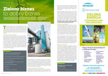 Jedną z najszybszych metod wejścia na drogę odpowiedzialnego biznesu jest przestawienie firmy na użytkowanie „zielonej energii”. Zmiana ta nie wymaga żadnych inwestycji, a pozwala zyskać wizerunek firmy dbającej o ekologię i społecznie odpowiedzialnej. Zielony biznes to dobry biznes Od biznesu wymaga się dziś innowacyjności, kreatywności i społecznej odpowiedzialności. Trudno sprostać tym wyzwaniom, nie mając na uwadze ochrony środowiska. Przy okazji wprowadzenia na rynek nowości, jaką są gwarancje pochodzenia energii, warto bliżej poznać to zagadnienie. T Do płynących z użytkowania „zielonej energii” korzyści dla środowiska nie trzeba już dziś nikogo przekonywać, choć ciągle warto przypominać o zaletach. Przede wszystkim podczas produkcji energii ze źródeł odnawialnych do atmosfery emitowana jest znacznie mniejsza ilość zanieczyszczeń niż podczas produkcji energii z węgla. Zanieczyszczenia powstałe podczas produkcji energii wpływają przecież na zmiany klimatyczne, które dotyczą nas wszystkich. Najmniejszy wpływ na środowisko ma produkcja prądu w elektrowniach wodnych, wiatrowych oraz słonecznych (fotowoltaika). Polacy wykazują coraz większą dbałość o środowisko, co pokazały niedawne badania TNS Polska. Jedna piąta naszych rodaków odpowiedzialnością za zanieczyszczenie środowiska obarcza właśnie firmy korzystające z energii wytwarzanej z węgla. Obecnie gwarancje pochodzenia można kupić jedynie na energię wyprodukowaną w kraju. „Wierzymy, że to się niedługo zmieni i będzie można nabywać gwarancje na energię wyprodukowaną również w Europie. Nasza firma ma moce wytwórcze w wielu krajach i dzięki temu będziemy mogli zaproponować naszym klientom gwarancje pochodzenia także z elektrowni wodnych i słonecznych” – dodaje dyrektor Działu Marketingu i Sprzedaży GDF SUEZ Energia Polska SA. PRZEWAGI GWARANCJI Czy wiesz, że... Co określa gwarancja pochodzenia energii? • źródło, w którym wyprodukowano energię, Zielony Blok • rodzaj energii (elektryczna/służąca do ogrzewania/chłodzenia), • rodzaj i moc instalacji, w której wyprodukowano energię, • datę wydania, Badania pokazały również, że diametralnie zmienia się nasze nastawienie do kwestii związanych z ochroną środowiska. Polacy chętnie wprowadzają w życie rozwiązania ekologiczne, np. segregację śmieci, użytkowanie ekotoreb czy oszczędzanie energii elektrycznej (np. poprzez stosowanie energooszczędnych żarówek). Wśród badanych 21% zadeklarowało, że byłoby w stanie ponieść większe wydatki, jeżeli kupowane produkty bądź usługi byłyby ekologiczne. Aż 80% konsumentów wskazało, że wybiera oferty firm, które troszczą się o ekologię. • kraj wydający, ZYSKUJE ŚRODOWISKO, ZYSKUJE FIRMA • datę oddania instalacji do eksploatacji, • niepowtarzalny numer identyfikacyjny. 82 | Polski Przemysł – wrzesień 2015 RÉFÉRENCES COULEUR 24, rue Salomon de Rothschild - 92288 Suresnes - FRANCE Tél. : +33 (0)1 57 32 87 00 / Fax : +33 (0)1 57 32 87 87 Web : www.carrenoir.com Zone de protection 1 C100% ENGIE PL_gdfsuez_jest_teraz_engie_CMYK 18/05/2015 RÉFÉRENCES COULEUR Zone de protection 2 Zone de protection 3 24, rue Salomon de Rothschild - 92288 Suresnes - FRANCE Tél. : +33 (0)1 57 32 87 00 / Fax : +33 (0)1 57 32 87 87 Web : www.carrenoir.com C100% M0% Y0% K0% Od niedawna „zieloną energię” można kupować razem z gwarancjami pochodzenia. Dzięki nim możemy wybrać energię, a właściwie technologię produkcji energii, np. farmy wiatrowe. „Gwarancje pochodzenia są zaświadczeniem, że dana ilość energii została wyprodukowana ze źródeł odnawialnych, bez szkód dla środowiska. Dzięki gwarancjom firmy mogą komunikować w swoim otoczeniu, że korzystają z «zielonej energii», i budować przyjazny wizerunek. Dzięki temu wspierają naturę, zwiększają zaufanie klientów, a w dłuższej perspektywie generują wyższe zyski” – tłumaczy Przemysław Chryc. STAWIAJ NA „ZIELONĄ ENERGIĘ” • czy jednostka produkująca korzystała z krajowego systemu wsparcia (rodzaj wsparcia), ENGIE ENGIE_logotype_CMYK 10/04/2015 ENERGIA Z GWARANCJAMI emat tzw. „zielonej energii” coraz częściej pojawia się w rozmaitych dyskusjach. Dzięki rosnącej świadomości coraz więcej klientów zwraca uwagę na to, w jakich warunkach wytwarzane są dla nich produkty oraz jak świadczone są potrzebne im usługi. Dzięki korzystaniu z „zielonej energii” możemy w prosty sposób pokazać, że nasze przedsiębiorstwo troszczy się o wspólne dobro, jakim jest środowisko, a dzięki temu budować wizerunek firmy społecznie odpowiedzialnej. • miejsce wytworzenia energii, Wybierając ekologiczną energię, przyczyniamy się do zmniejszenia zanieczyszczenia środowiska. Korzystanie z „zielonej energii” może też zmniejszyć wysokość firmowych rachunków za energię. Aby stać się ekofirmą, wystarczy zmienić sprzedawcę na tego, który oferuje prąd uzyskiwany z OZE w atrakcyjnej cenie. „Obecnie ceny energii z odnawialnych źródeł są porównywalne z energią produkowaną metodami konwencjonalnymi. Nieporównywalne są jednak korzyści, które OZE przynoszą środowisku naturalnemu. Dlatego przedsiębiorcy powinni skorzystać z tej szansy” – opowiada Przemysław Chryc, dyrektor Działu Marketingu i Sprzedaży GDF SUEZ Energia Polska SA. reklama artykuł sponsorowany Zbudowanie w świadomości konsumentów wizerunku firmy lub przedsiębiorstwa społecznie odpowiedzialnego jest trudne do zrealizowania. Wymaga konsekwencji, przemyślanych działań, środków finansowych i czasu. Warto zaznaczyć, że gwarancje pochodzenia są wydawane i kontrolowane przez państwo. Ich udzielaniem i monitorowaniem zajmuje się Urząd Regulacji Energetyki. Gwarancje są też wpisane w rejestr, który prowadzi Towarowa Giełda Energii SA. „Dzięki monitoringowi państwowych instytucji klient 