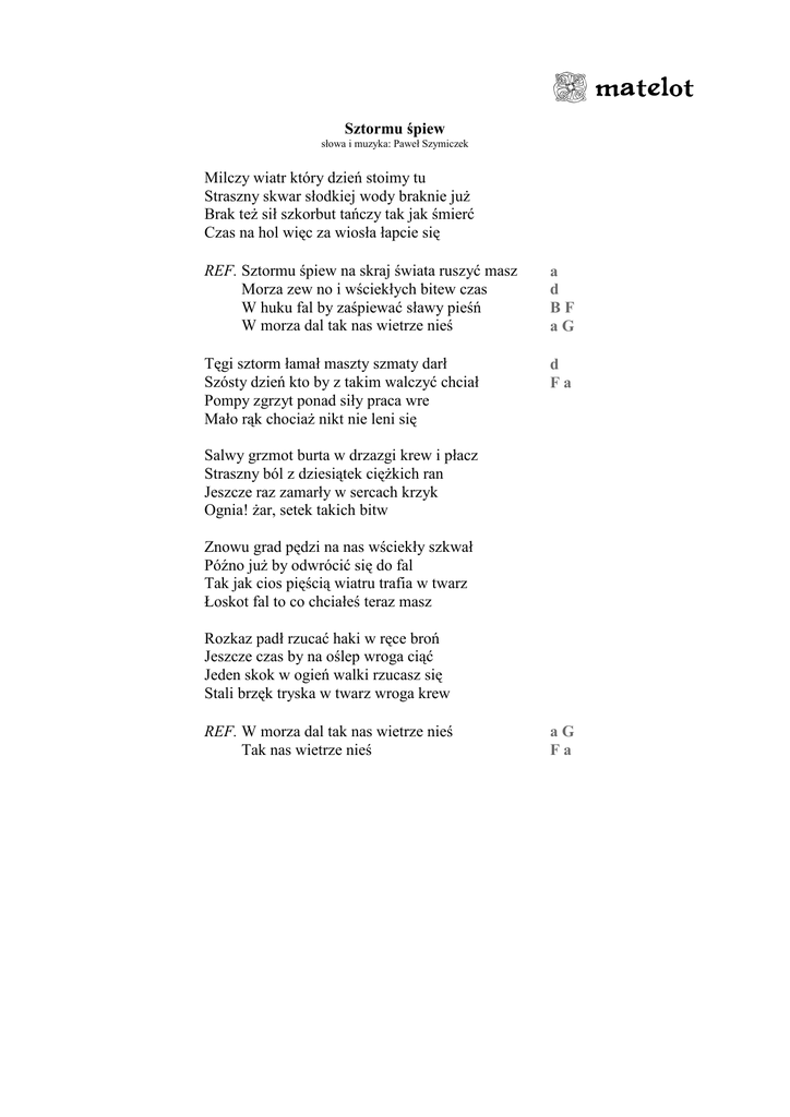 + matelot Sztormu śpiew słowa i muzyka: Paweł Szymiczek Milczy wiatr który dzień stoimy tu Straszny skwar słodkiej wody braknie już Brak też sił szkorbut tańczy tak jak śmierć Czas na hol więc za wiosła łapcie się REF. Sztormu śpiew na skraj świata ruszyć masz Morza zew no i wściekłych bitew czas W huku fal by zaśpiewać sławy pieśń W morza dal tak nas wietrze nieś a d BF aG Tęgi sztorm łamał maszty szmaty darł Szósty dzień kto by z takim walczyć chciał Pompy zgrzyt ponad siły praca wre Mało rąk chociaż nikt nie leni się d Fa Salwy grzmot burta w drzazgi krew i płacz Straszny ból z dziesiątek ciężkich ran Jeszcze raz zamarły w sercach krzyk Ognia! żar, setek takich bitw Znowu grad pędzi na nas wściekły szkwał Późno już by odwrócić się do fal Tak jak cios pięścią wiatru trafia w twarz Łoskot fal to co chciałeś teraz masz Rozkaz padł rzucać haki w ręce broń Jeszcze czas by na oślep wroga ciąć Jeden skok w ogień walki rzucasz się Stali brzęk tryska w twarz wroga krew REF. W morza dal tak nas wietrze nieś Tak nas wietrze nieś aG Fa
