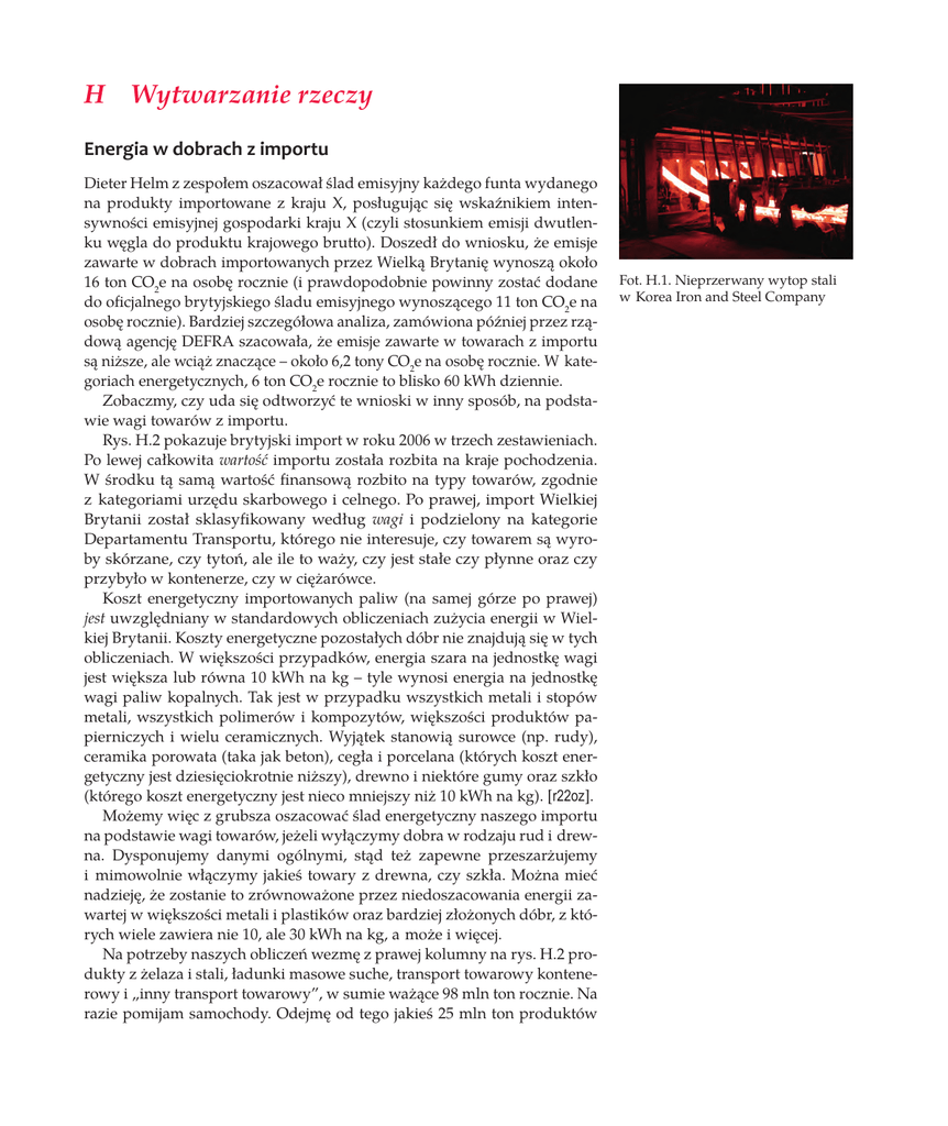 H Wytwarzanie rzeczy Energia w dobrach z importu Dieter Helm z zespołem oszacował ślad emisyjny każdego funta wydanego na produkty importowane z kraju X, posługując się wskaźnikiem intensywności emisyjnej gospodarki kraju X (czyli stosunkiem emisji dwutlenku węgla do produktu krajowego brutto). Doszedł do wniosku, że emisje zawarte w dobrach importowanych przez Wielką Brytanię wynoszą około 16 ton CO2e na osobę rocznie (i prawdopodobnie powinny zostać dodane do oficjalnego brytyjskiego śladu emisyjnego wynoszącego 11 ton CO2e na osobę rocznie). Bardziej szczegółowa analiza, zamówiona później przez rządową agencję DEFRA szacowała, że emisje zawarte w towarach z importu są niższe, ale wciąż znaczące – około 6,2 tony CO2e na osobę rocznie. W kategoriach energetycznych, 6 ton CO2e rocznie to blisko 60 kWh dziennie. Zobaczmy, czy uda się odtworzyć te wnioski w inny sposób, na podstawie wagi towarów z importu. Rys. H.2 pokazuje brytyjski import w roku 2006 w trzech zestawieniach. Po lewej całkowita wartość importu została rozbita na kraje pochodzenia. W środku tą samą wartość finansową rozbito na typy towarów, zgodnie z kategoriami urzędu skarbowego i celnego. Po prawej, import Wielkiej Brytanii został sklasyfikowany według wagi i podzielony na kategorie Departamentu Transportu, którego nie interesuje, czy towarem są wyroby skórzane, czy tytoń, ale ile to waży, czy jest stałe czy płynne oraz czy przybyło w kontenerze, czy w ciężarówce. Koszt energetyczny importowanych paliw (na samej górze po prawej) jest uwzględniany w standardowych obliczeniach zużycia energii w Wielkiej Brytanii. Koszty energetyczne pozostałych dóbr nie znajdują się w tych obliczeniach. W większości przypadków, energia szara na jednostkę wagi jest większa lub równa 10 kWh na kg – tyle wynosi energia na jednostkę wagi paliw kopalnych. Tak jest w przypadku wszystkich metali i stopów metali, wszystkich polimerów i kompozytów, większości produktów papierniczych i wielu ceramicznych. Wyjątek stanowią surowce (np. rudy), ceramika porowata (taka jak beton), cegła i porcelana (których koszt energetyczny jest dziesięciokrotnie niższy), drewno i niektóre gumy oraz szkło (którego koszt energetyczny jest nieco mniejszy niż 10 kWh na kg). [r22oz]. Możemy więc z grubsza oszacować ślad energetyczny naszego importu na podstawie wagi towarów, jeżeli wyłączymy dobra w rodzaju rud i drewna. Dysponujemy danymi ogólnymi, stąd też zapewne przeszarżujemy i mimowolnie włączymy jakieś towary z drewna, czy szkła. Można mieć nadzieję, że zostanie to zrównoważone przez niedoszacowania energii zawartej w większości metali i plastików oraz bardziej złożonych dóbr, z których wiele zawiera nie 10, ale 30 kWh na kg, a może i więcej. Na potrzeby naszych obliczeń wezmę z prawej kolumny na rys. H.2 produkty z żelaza i stali, ładunki masowe suche, transport towarowy kontenerowy i „inny transport towarowy”, w sumie ważące 98 mln ton rocznie. Na razie pomijam samochody. Odejmę od tego jakieś 25 mln ton produktów Fot. H.1. Nieprzerwany wytop stali w Korea Iron and Steel Company 337 H – Wytwarzanie rzeczy Masa importu w milionach ton (Mt) Wartość importu Wartość importu Paliwa: 131 (nie w skali) Paliwa: 30 mld £ Rudy: 5,5 mld £ Produkty rolnicze: 27 mld £ Drewno: 3 mld £ UE: 161 mld £ Metale: 20 mld £ Rudy: 18 Produkty rolnicze: 9 Produkty leśne: 8 Wyroby chemiczne (w tym plastik): 42 mld £ Papier, książki: 8 mld £ Żelazo, wyroby stalowe: 6 Ciekłe produkty masowe: 7 Suche produkty masowe: 11 Tekstylia, skóra: 20 mld £ Norwegia: 15 mld £ Maszyny: 21 mld £ Kontenery: 31 Rosja: 6 mld £ Szwajcaria: 4,5 mld £ USA: 26 mld £ Kanada: 5 mld £ Sprzęt elektryczny: 60 mld £ Chiny: 16 mld £ Japonia: 8 mld £ Hong Kong: 7,5 mld £ Singapur: 4 mld £ Turcja: 4 mld £ RPA: 4 mld £ inne kraje Meble, inne przedmioty: 15 mld £ Inne ładunki: 50 Pojazdy: 48 mld £ Pojazdy: 3,2 Suma: 300 miliardów £ Suma: 300 miliardów £ Suma: 273 Mt Rys. H.2. Import dóbr w Wielkiej Brytanii, rok 2006 338 O zrównoważonej energii – bez pary w gwizdek żywnościowych, które zapewne schowały się w kategorii „inny transport towarowy” (w roku 2006 sprowadziliśmy 34 mln ton żywności). Zostaje nam 73 mln ton. Konwertujemy owe 73 mln ton na energię, przy użyciu wskaźnika przeliczeniowego zasugerowanego powyżej i dzielimy to przez 60 mln ludzi. Wychodzi nam, że brytyjski import zawiera energię szarą w wysokości 33 kWh na osobę dziennie. Co do samochodów, stać nas na bardziej precyzyjne obliczenia, bo i wiemy nieco więcej: w roku 2006 sprowadziliśmy 2,4 mln pojazdów. Przy założeniu, że energia szara na samochód wynosi 76 000 kWh (patrz: str. 98), samochody z importu zawierają energię rzędu 8 kWh na osobę dziennie. Wyłączyłem z rachunków „ładunki masowe płynne”, bo nie do końca wiem, co to jest. Jeżeli są to płynne chemikalia, to energia w nich zawarta może być znaczna. Wychodzi nam, że całkowita energia zawarta w imporcie wynosi 41 kWh na osobę dziennie – co zgadza się zasadzie mniej więcej z obliczeniami Dietera Helma i spółki. Podejrzewam, że 41 kWh na osobę dziennie jest wartością niedoszacowaną, bo założona przez nas intensywność emisyjna (10 kWh na kg) jest niższa niż intensywność większości produktów przemysłowych, takich jak maszyny, czy urządzenia elektryczne. Bez znajomości wagi wszystkich kategorii importu, to najlepsze obliczenie, na jakie mnie stać. Analiza cyklu życiowego budynków Tabele H.4 i H.5 podają zapotrzebowanie na energię w procesie produkcji materiałów i konstrukcji budowlanych. Uwzględnia ono energię spożytkowaną na przetransportowanie surowców do fabryki, ale nie liczy energii zużytej w transporcie wyrobów na plac budowy. W tabeli H.6 korzystamy z tych liczb do obliczenia energii w procesie budowy domu z trzema sypi