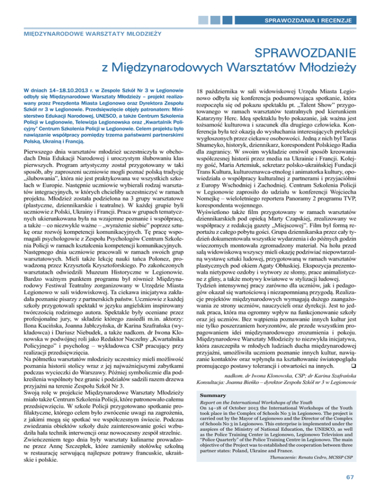 sprawozdania i recenzje Międzynarodowe Warsztaty Młodzieży Sprawozdanie z Międzynarodowych Warsztatów Młodzieży W dniach 14–18.10.2013 r. w Zespole Szkół Nr 3 w Legionowie odbyły się Międzynarodowe Warsztaty Młodzieży – projekt realizowany przez Prezydenta Miasta Legionowo oraz Dyrektora Zespołu Szkół nr 3 w Legionowie. Przedsięwzięcie objęły patronatem: Ministerstwo Edukacji Narodowej, UNESCO, a także Centrum Szkolenia Policji w Legionowie, Telewizja Legionowska oraz „Kwartalnik Policyjny” Centrum Szkolenia Policji w Legionowie. Celem projektu było nawiązanie współpracy pomiędzy trzema państwami partnerskimi Polską, Ukrainą i Francją. Pierwszego dnia warsztatów młodzież uczestniczyła w obchodach Dnia Edukacji Narodowej i uroczystym ślubowaniu klas pierwszych. Program artystyczny został przygotowany w taki sposób, aby zaproszeni uczniowie mogli poznać polską tradycję „ślubowania”, która nie jest praktykowana we wszystkich szkołach w Europie. Następnie uczniowie wybierali rodzaj warsztatów integracyjnych, w których chcieliby uczestniczyć w ramach projektu. Młodzież została podzielona na 3 grupy warsztatowe (plastyczne, dziennikarskie i teatralne). W każdej grupie byli uczniowie z Polski, Ukrainy i Francji. Praca w grupach tematycznych ukierunkowana była na wzajemne poznanie i współpracę, a także – co niezwykle ważne – „wyrażenie siebie” poprzez sztukę oraz rozwój kompetencji komunikacyjnych. Tę pracę wspomagali psychologowie z Zespołu Psychologów Centrum Szkolenia Policji w ramach kształcenia kompetencji komunikacyjnych. Następnego dnia uczniowie pracowali w ramach swoich grup warsztatowych. Mieli także lekcję nauki tańca Polonez, prowadzoną przez Krzysztofa Krysztoforskiego. Po zakończonych warsztatach odwiedzili Muzeum Historyczne w Legionowie. Bardzo ważnym punktem programu był również Międzynarodowy Festiwal Teatralny zorganizowany w Urzędzie Miasta Legionowo w sali widowiskowej. Ta ciekawa inicjatywa zakładała poznanie pisarzy z partnerskich państw. Uczniowie z każdej szkoły przygotowali spektakl w języku angielskim inspirowany twórczością rodzimego autora. Spektakle były oceniane przez profesjonalne jury, w składzie którego zasiedli m.in. aktorzy: Ilona Kucińska, Joanna Jabłczyńska, dr Karina Szafrańska (wykładowca) i Dariusz Niebudek, a także nadkom. dr Iwona Klonowska w podwójnej roli jako Redaktor Naczelny „Kwartalnika Policyjnego” i psycholog – wykładowca CSP pracujący przy realizacji przedsięwzięcia. Na półmetku warsztatów młodzieży uczestnicy mieli możliwość poznania historii stolicy wraz z jej najważniejszymi zabytkami podczas wycieczki do Warszawy. Później symbolicznie dla podkreślenia wspólnoty bez granic i podziałów sadzili razem drzewa przyjaźni na terenie Zespołu Szkół Nr 3. Swoją rolę w projekcie Międzynarodowe Warsztaty Młodzieży miało także Centrum Szkolenia Policji, które patronowało całemu przedsięwzięciu. W szkole Policji przygotowano spotkanie profilaktyczne, którego celem było zwrócenie uwagi na zagrożenia, z jakimi mogą się spotkać we współczesnym świecie. Podczas zwiedzania obiektów szkoły duże zainteresowanie gości wzbudziła hala technik interwencji oraz nowoczesny zespół strzelnic. Zwieńczeniem tego dnia były warsztaty kulinarne prowadzone przez Annę Szczepłek, które zamieniły stołówkę szkolną w restaurację serwującą najlepsze potrawy francuskie, ukraińskie i polskie. 18 października w sali widowiskowej Urzędu Miasta Legionowo odbyła się konferencja podsumowująca spotkanie, która rozpoczęła się od pokazu spektaklu pt. „Talent Show” przygotowanego w ramach warsztatów teatralnych pod kierunkiem Katarzyny Herc. Ideą spektaklu było pokazanie, jak ważna jest tożsamość kulturowa i szacunek dla drugiego człowieka. Konferencja była też okazją do wysłuchania interesujących prelekcji wygłoszonych przez ciekawe osobowości. Jedną z nich był Taras Shumeyko, historyk, dziennikarz, korespondent Polskiego Radia dla zagranicy. W swoim wykładzie omówił sposób kreowania współczesnej historii przez media na Ukrainie i Francji. Kolejny gość, Maria Artemiuk, sekretarz polsko-ukraińskiej Fundacji Trans Kultura, kulturoznawca-etnolog i animatorka kultury, opowiedziała o współpracy kulturalnej z partnerami i przyjaciółmi z Europy Wschodniej i Zachodniej. Centrum Szkolenia Policji w Legionowie zaprosiło do udziału w konferencji Wojciecha Nomejkę – wieloletniego reportera Panoramy 2 programu TVP, korespondenta wojennego. Wyświetlono także film przygotowany w ramach warsztatów dziennikarskich pod opieką Marty Czapskiej, zrealizowany we współpracy z redakcją gazety „Miejscowej”. Film był formą reportażu z całego pobytu gości. Grupa dziennikarska przez cały tydzień dokumentowała wszystkie wydarzenia i do późnych godzin wieczornych montowała zgromadzony materiał. Na holu przed salą widowiskową wszyscy mieli okazję podziwiać niepowtarzalną wystawę sztuki ludowej, przygotowaną w ramach warsztatów plastycznych pod okiem Agaty Obłuskiej. Ekspozycja prezentowała nietypowe ozdoby i wytwory ze słomy, prace animalistyczne z gliny, a także motywy kwiatowe w stylizacji ludowej. Tydzień intensywnej pracy zarówno dla uczniów, jak i pedagogów okazał się wartościową i niezapomnianą przygodą. Realizacje projektów międzynarodowych wymagają dużego zaangażowania ze strony uczniów, nauczycieli oraz dyrekcji. Jest to jednak praca, która ma ogromny wpływ na funkcjonowanie szkoły oraz jej uczniów. Bez wątpienia poznawanie innych kultur jest nie tylko poszerzaniem horyzontów, ale przede wszystkim propagowaniem idei międzynarodowego zrozumienia i pokoju. Międzynarodowe Warsztaty Młodzieży to niezwykła inicjatywa, która zaszczepiła w młodych ludziach ducha międzynarodowej przyjaźni, umożliwiła uczniom poznanie in