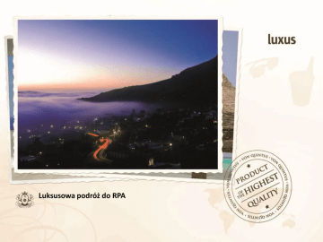 Luksusowa podróż do RPA RPA RPA uważany jest za „najmniej afrykaoskie” z paostw Afryki. Przez długie lata kraj ten zmagał się z niesprawiedliwością społeczną i rasizmem, dziś jednak znajduje się na dobrej drodze ku prawdziwej demokracji i stania się „krajem tęczy” – gdzie wszystkie kolory znajdują się ze sobą w idealnej harmonii. Warunki naturalne RPA zachwyci nas bogactwem swego krajobrazu. Jest to kraj wyżynny ze wspaniałymi Górami Smoczymi, w których znajduje źródło większośd tutejszych rzek, Górami Przylądkowymi, nadmorskimi urwiskami i niezwykłą kotliną Kalahari, na terenie której znajdują się prawdziwe cuda przyrody. W licznych parkach narodowych i rezerwatach przyrody południowej Afryki obserwowad możemy białe nosorożce, krokodyle i rekiny wielorybie. Większa częśd kraju znajduje się w strefie klimatu zwrotnikowego, ponieważ jednak w poszczególnych regionach występują różne jego odmiany: od wybitnie suchej na zachodzie do wilgotnej na wschodzie, warunki pogodowe (odnośnik do pogody) RPA są bardzo zróżnicowane. RPA - Krajobraz Aktywny wypoczynek Liczne wzniesienia, wspaniałe wybrzeża i piękne krajobrazy RPA sprzyjają różnym formom aktywnego spędzania czasu. Duża popularnością cieszy się tu kolarstwo górskie i wspinaczka, znużeni wysokościami bardzo szybko mogą się od nich oderwad skacząc na bungy lub udając się w szalony spływ rzeką czy wodospadem. Malownicze południowoafrykaoskie wybrzeża są z kolei prawdziwym rajem dla miłośników surfingu i nurkowania. Największe tego typu atrakcje zapewnią nam: Góry Smocze, wybrzeże Wild Coast, prowincja KwaZulu Natal i okolice rzeki Storms River. Luksusowa podróż do RPA DZIEŃ 1 – Lot Lot klasą business class lub economy (Lufthansa) Berlin – Frankfurt Frankfurt – Kapsztad DZIEŃ 2 Po lądowaniu na międzynarodowym lotnisku w Kapsztadzie zostaniecie Paostwo powitani przez polskojęzycznego przewodnika. Następnie zapraszamy na przejazd prywatną limuzyną do Paostwa hotelu. Po check-in pozostała częśd dnia jest do Paostwa dyspozycji. Po południu zapraszamy na powitalny obiad w ekskluzywnej restauracji w hotelu Ellerman House. Luksusowa podróż do RPA c.d. DZIEŃ 2 Na nocleg zapraszamy Paostwa do hotelu Ellerman House ***** Ten znakomity hotel położony jest przy wybrzeżu Oceanu Atlantyckiego. Pokoje z widokiem na ocean. Cena zawiera śniadanie, lokalne napoje, minibar, koktajle oraz pralnię DZIEŃ 3 DZIEŃ 4 Po śniadaniu udadzą się Paostwo z polskojęzycznym przewodnikiem w stronę kolejki linowej prowadzącej do Góry Stołowej - słynnego symbolu miasta. Z góry będziecie mogli podziwiad piękno miasta wraz z jego plażami, lasami i malowniczymi dzielnicami. Dzisiejszy dzieo zaczynamy bardzo wcześnie i udajemy się do oddalonego o 2 godziny drogi Gansbaai. Stamtąd popłyną Paostwo łodzią na otwarte morze, aby na żywo przeżyd niesamowitą atrakcję, zanurzenie w specjalnej klatce w trakcie którego będziecie mogli podziwiad osławione białe rekiny (Shark Cage Diving). Stamtąd pojedziecie Paostwo do Mount Nelson Hotel, gdzie przez 2 godziny będziecie mogli rozkoszowad się hotelowym SPA. „Vine secret vintage experience“ jest odmładzającą od stóp do głów kuracją. Polega ona na zastosowaniu peelingu z pestek winogron, wspaniale pachnących okładów układanych na całym ciele oraz odmładzającej kuracji twarzy. Dzisiejszy obiad będzie serwowany w rezerwacie natury Grootbos. Następnie pojedziecie Paostwo do miasta Hermanus, gdzie na pewno znajdziecie czas na krótki spacer po mieście, aby potem udad się wzdłuż spektakularnego wybrzeża Atlantyku do Kapsztadu i z powrotem do hotelu. Następnie na tarasie hotelu będzie czekad na Paostwa wspaniały obiad. Popołudniu poznają Paostwo Kapsztad z bliska podczas spaceru z przewodnikiem. Udacie się również w okolice portu, gdzie helikopter zabierze Paostwa na godzinny lot ponad miastem i całym półwyspem. Po krótkiej przerwie na odświeżenie w Ellerman House udamy się wieczorem do Camps Bay, gdzie w Paranga Restaurant lub innym miejscu przy lampce wina będziecie mogli nacieszyd oko zapierającym dech w piersiach widokiem na Atlantyk. Na nocleg zapraszamy do znanego już Paostwu Ellerman House. Luksusowa podróż do RPA Na dzisiejszą kolację zapraszamy do restauracji SALT Restaurant lub w Bantry Bay. Nocleg w Ellerman House. DZIEŃ 5 DZIEŃ 6 Po śniadaniu wyruszycie Paostwo na jeep safari 4x4 otwartym jeepem do winiarni Waterford. Tutaj będziecie mogli rozkoszowad się winem wśród winorośli i zapierającego dech w piersiach otoczenia. Po śniadaniu wykwaterowanie z hotelu i transfer prywatną limuzyną z polskojęzycznym przewodnikiem na międzynarodowe lotnisko w Kapsztadzie. Następnie udamy się do bardzo dobrej restauracji na degustację wina. Po południu kontynuujemy podróż i jedziemy do Franschhoek, gdzie podczas spaceru będzie można również podziwiad winne krzewy. Stąd mają Paostwo lot do Nelspruit. Wylot o godz. 10:00 (lot SA 8663) i lądowanie o 12:35. Z Nelspruit jeszcze 20-minutowy przelot czarterowy do pasa lądowego Royal Malewane Game Reserves, skąd samochodem zostaną Paostwo zawiezieni do miejsca zakwaterowania, czas przejazdu ok. 10 min. Po krótkim odpoczynku w hotelu udamy się do Gold of Africa Restaurant lub Podobnej restauracji, gdzie obiad będzie serwowany w niesamowitej atmosferze afrykaoskiego, autentycznego show. W hotelu zostaniecie Paostwo powitani herbatą. Po chwili odpoczynku zaprosimy Paostwa na przejażdżkę po okolicznych terenach, gdzie będziecie mogli podziwiad dzikie zwierzęta w ich naturalnym środowisku. Na nocleg zapraszamy do znanego już Paostwu Ellerman House. Kolacja zostanie podana w hotel. Dzisiejszej nocy zapraszamy Paostwa do hotelu Royal Malewane Game Reserve, pokoje luxus suite. W cenie pełne wyżywienie, lokalne napoje, wino, alkohol, 2 rozrywki związane z safari na dzieo, pralnia L