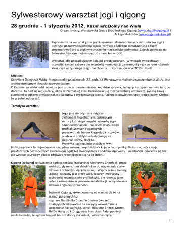 Sylwesterowy warsztat jogi i qigong 28 grudnia - 1 stycznia 2012, Kazimierz Dolny nad Wisłą Organizatorzy: Warszawska Grupa Shaolińskiego Qigong (www.shaolinqigong.pl ) & Joga Mokotów (www.jogamokotow.pl) Zapraszamy na warsztat gdzie pod kierunkiem doświadczonych instruktorów jogi i qigongu poznawać będziemy tajniki zdrowia i dobrego samopoczucia a także zregenerować siły w pięknym otoczeniu magicznego Kazimierza. Zajęcia potrwają do Sylwestra, którego można spędzić z nami lub wrócić. Warsztat i dla początkujących i dla już praktykujących. W wieczór sylwestrowy – oczywiści tańce i zabawa ale wcześniej – medytacja z ceremonią – jak co roku - palenia klesi, czyli wszystkiego czego nie chcemy już kontynuować w 2013 roku Miejsce: Kazimierz Dolny nad Wisłą to miasteczko położone ok. 2,5 godz. od Warszawy w malowniczym przełomie Wisły. Jest architektonicznym i krajobrazowym cudem. O Kazimierzu wielu ludzi mówi, że jest to zaczarowane miasteczko, które sprawia, że będąc tu zapominamy o tym, co doraźne. Tu nikt się nie spieszy, jakby zatrzymał się czas. Delektować się można herbatą u Dziwisza, pyszną kawą i ciastkami w cukierni słynącej także z kogutów z drożdżowego ciasta. Pachnące powietrze, urok krajobrazów. Można tu w pełni odpocząć. Tematyka warsztatu: Joga jest starożytnym indyjskim systemem filozoficznym, opisującym naturę ludzkiego umysłu i sposoby jego samodoskonalenia, ma wiele właściwości profilaktycznych i leczniczych przeciwdziała bólom kręgosłupa i stawów, w efekcie praktyki uelastyczniają sie mięśnie, stawy, ścięgna. Praktyka jogi reguluje przepływ krwi, limfy, poprawia funkcjonowanie narządów wewnętrznych i działa kojąco na psychikę. Na kursie, prócz zajęć praktycznych poświeconych ćwiczeniom będą też dwa wykłady z podstaw Ajurwedy – na których dowiemy się też jak według ajurwedy dbać o zdrowie i regenerować się na co dzień. Qigong (czikung) to ćwiczenia będące częścią Tradycyjnej Medycyny Chińskiej i przez wieki służyły mnichom shaolińskim do utrzymania ciał w zdrowiu i dobrej kondycji fizycznej. Współcześnie trening Qigong zalecany jest przez wielu lekarzy (medycyny zachodniej również) jako profilaktyka, ale również jako jeden z elementów w procesie rehabilitacji i odzyskiwania zdrowia i ogólnej sprawności. Techniki Qigong, które poznamy na warsztacie to na sesjach porannych to: - system Shaolin Ba Duan Jin ( osiem ćwiczeń), działających zdrowotnie na narządy wewnętrzne a szczególnie na: wątrobę, serce, śledzionę i nerki. Mistrz Shi De Hong od którego nasz instruktor Rafał pobierał nauki twierdzi, że system ten jest bardzo dobry dla kobiet, nawet w ciąży. 1 - na sesjach popołudniowych - Shaolin Luohan Zhuang Kung , oraz automasaż zdrowotny do systemu Xi Sui Jing w zależności od ćwiczenia działają na oczy, pamięć, wyregulowują pracę narządów wewnętrznych, usuwają zmęczenie, pomagają w nadciśnieniu, polepszają pracę mózgu poprzez lepsze jego dokrwienie, dotlenienie i doenergetyzowanie. I Joga i Qigong: relaksują, uspokajają, działają antydepresyjnie, wzmacniają odporność organizmu zarówno na choroby jak i na stres, rozwijają siłę woli, mądrość i wewnętrzny spokój. Pozwalają poznać samego siebie i stopniowo uwolnić sie od własnych ograniczeń. Prosimy o zabranie ze sobą wygodnego stroju do ćwiczeń zarówno na sali oraz pomocy do jogi (mata, pasek, koc, wałek itp. - dotyczy tylko osób z grupy zaawansowanej, które mają już własne pomoce, dla osób, które nie mają i dla początkujących cały sprzęt zapewniamy). Jogę ćwiczymy boso na sali, Qigong w miękkim obuwiu. Orientacyjny rozkład zajęć (może on ulec zmianie): 28.12.2012 piątek przyjazd zakwaterowanie ok. godz.10.30 11.00 – 12.30 -Qigong 29.12.2012 sobota 30.12.2012 niedziela 31.12.2012 poniedziałek 1 .01.2013 wtorek 9.00- 10.30 - Qigong 9.00- 10.30 - Qigong 9.00- 10.30 - Qigong 11.00-12.00 – qigong 10.45 – 12.15 - Joga 10.45 – 12.15 – joga+Ajurweda 10.45 – 12.15 – Joga+Ajurweda 12.00- 13.00 - Joga Zakończenie kursu, wykwaterowanie do g.14.00 12.30 – 13.30 – Joga czas wolny czas wolny czas wolny czas wolny 14.00 – 15.30 - qigong 17.00–18.30 qigong 20.30 – 22.00 - joga 17.00–18.30 qigong 20.30 – 22.00 - joga 17.00–18.30 qigong 20.30 – 22.00 - joga 20.00 – ceremonia palenia klesi, medytacja, kolacja i zabawa sylwestrowa Instruktorzy: Anna Wawrzycka-Atach - dyplomowana instruktorka jogi w stopniu Junior 2 Intermediate certyfikowana przez Polskie Stowarzyszenie Jogi Iyengara. Praktykuje jogę od ponad 15 lat. Doświadczenie zdobywała na kursach jogi u nauczycieli z Polski, Francji, Niemiec i USA oraz w Indiach w Instytucie Iyengara i w Jiva Ayurveda Clinic w Faridabad. Uczy jogi i ajurwedy. Prowadzi w Warszawie szkołę Joga Mokotów (www.jogamokotow.pl ). 2 Rafał Becker – instruktor Qigong, z wykształcenia filozof i manager kultury. Od dziecka zafascynowany kulturą filozofią Wschodu. Doświadczenie zdobywał od 15-tego roku życia m.in. u Sławomira Pawłowskiego, który swoją wiedze od 30 lat zdobywa bezpośrednio u mistrzów w Klasztorze Shaolin. W 2012 odwiedzili Klasztor Shaolin gdzie został przedstawiony Mistrzowi Shi De Hong z Klasztoru Shaolin, u którego miał zaszczyt uczyć się następujących systemów qigong: Shaolin Ba Duan Jin, Shaolin Yi Jin Jing, Shaolin Luohan Kung oraz automasaży z systemu Xi Sui Jing. Prowadzi stronę o qigong i regularne zajęcia w Warszawie (www.shaolinqigong.pl ) Opłaty za treningi i wieczór sylwestrowy: - 575 zł – treningi, czyli wszystkie zajęcia prowadzone przez instruktorów. - 350 zł - Wieczór Sylwestrowy z kolacją sylwestrową, medytacją i ceremonią palenia klesi (w tej opłacie, pakiecie jest już: dodatkowy nocleg) poranne zajęcia jogi i qigong 1 stycznia – już bez żadnych dodatkowych dopłat. Opcje zakwaterowania