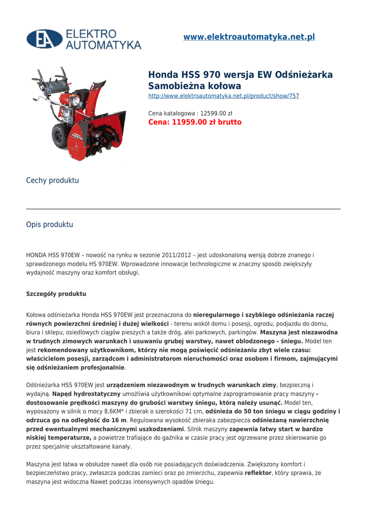 Honda HSS 970 wersja EW Odśnieżarka Samobieżna kołowa