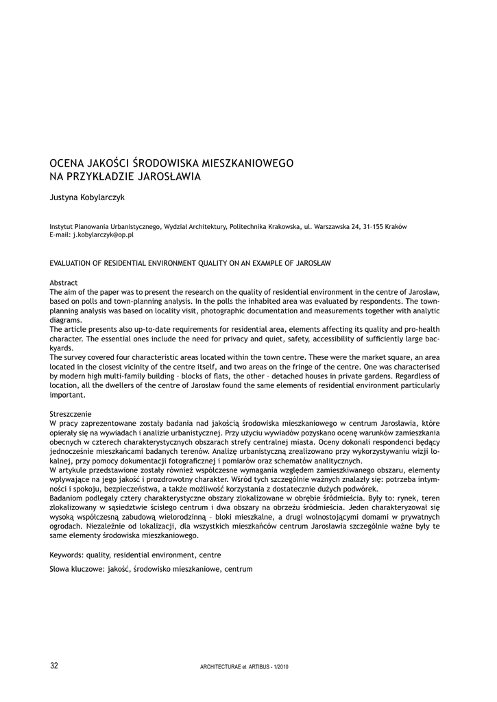 Ocena jakości środowiska mieszkaniowego na przykładzie Jarosławia Justyna Kobylarczyk Instytut Planowania Urbanistycznego, Wydział Architektury, Politechnika Krakowska, ul. Warszawska 24, 31–155 Kraków E–mail: [email protected] EVALUATION OF RESIDENTIAL ENVIRONMENT QUALITY ON AN EXAMPLE OF JAROSŁAW Abstract The aim of the paper was to present the research on the quality of residential environment in the centre of Jarosław, based on polls and town-planning analysis. In the polls the inhabited area was evaluated by respondents. The townplanning analysis was based on locality visit, photographic documentation and measurements together with analytic diagrams. The article presents also up-to-date requirements for residential area, elements affecting its quality and pro-health character. The essential ones include the need for privacy and quiet, safety, accessibility of sufficiently large backyards. The survey covered four characteristic areas located within the town centre. These were the market square, an area located in the closest vicinity of the centre itself, and two areas on the fringe of the centre. One was characterised by modern high multi-family building – blocks of flats, the other – detached houses in private gardens. Regardless of location, all the dwellers of the centre of Jarosław found the same elements of residential environment particularly important. Streszczenie W pracy zaprezentowane zostały badania nad jakością środowiska mieszkaniowego w centrum Jarosławia, które opierały się na wywiadach i analizie urbanistycznej. Przy użyciu wywiadów pozyskano ocenę warunków zamieszkania obecnych w czterech charakterystycznych obszarach strefy centralnej miasta. Oceny dokonali respondenci będący jednocześnie mieszkańcami badanych terenów. Analizę urbanistyczną zrealizowano przy wykorzystywaniu wizji lokalnej, przy pomocy dokumentacji fotograficznej i pomiarów oraz schematów analitycznych. W artykule przedstawione zostały również współczesne wymagania względem zamieszkiwanego obszaru, elementy wpływające na jego jakość i prozdrowotny charakter. Wśród tych szczególnie ważnych znalazły się: potrzeba intymności i spokoju, bezpieczeństwa, a także możliwość korzystania z dostatecznie dużych podwórek. Badaniom podlegały cztery charakterystyczne obszary zlokalizowane w obrębie śródmieścia. Były to: rynek, teren zlokalizowany w sąsiedztwie ścisłego centrum i dwa obszary na obrzeżu śródmieścia. Jeden charakteryzował się wysoką współczesną zabudową wielorodzinną – bloki mieszkalne, a drugi wolnostojącymi domami w prywatnych ogrodach. Niezależnie od lokalizacji, dla wszystkich mieszkańców centrum Jarosławia szczególnie ważne były te same elementy środowiska mieszkaniowego. Keywords: quality, residential environment, centre Słowa kluczowe: jakość, środowisko mieszkaniowe, centrum 32 ARCHITECTURAE et ARTIBUS - 1/2010 OCENA JAKOŚCI ŚRODOWISKA MIESZKANIOWEGO NA PRZYKŁADZIE JAROSŁAWIA Wprowadzenie Temat jakości środowiska mieszkaniowego jest bardzo szeroki, obejmuje wiele dyscyplin naukowych, przede wszystkim: architekturę, psychologię, socjologię i urbanistykę. Środowisko mieszkaniowe, w którym żyje człowiek, powinno spełniać jego potrzeby i wymagania. „Jakość środowiska mieszkaniowego jest drugim najbardziej ważnym wyznacznikiem jakości życia, zaraz po szczęściu rodzinnym, a obecność elementów przyrodniczych oraz zgodna z oczekiwaniami struktura przestrzenna może w wyraźny sposób pomóc w podniesieniu tej jakości, służąc poprawie stanu zdrowia i samopoczucia mieszkańców”1. Z pojęciem jakości środowiska wiąże się zagadnienie komfortu. Problemem jest wyznaczenie jego parametrów i sposób oceny. Badania nad jakością środowiska mieszkaniowego dotyczą między innymi psychologii środowiskowej. Tematyka podejmowana jest przez liczne polskie uczelnie, w tym między innymi przez Wydział Architektury Politechniki Warszawskiej, Szczecińskiej, Śląskiej i Krakowskiej. Ważne miejsce w zakresie psychologii środowiskowej zajmuje także działalność architektów i urbanistów z Poznania, a przede wszystkim twórczość naukowa A. Bańki. Interesujące badania na temat środowiska mieszkaniowego prowadzą także między innymi The European Network for Housing Research oraz The Research Committee on Housing and the Built Environment, promujący badania interdyscyplinarne w ramach Międzynarodowego Towarzystwa Socjologicznego. 1.Współczesne wymagania względem środowiska mieszkaniowego Współczesne wymagania względem środowiska mieszkaniowego odnoszą się do oceny elementów i czynników wpływających na rozwiązania funkcjonalne, przestrzenne i estetyczne otoczenia. Powinno ono zapewniać komfort, a więc wygodę życiową nacechowaną celowością i pięknem. Samo wyobrażenie komfortu nie jest stałe, zmienia się wraz z przekształceniami cywilizacyjnymi. Pewne cechy pozostają niezmienne, pewne nabierają wagi lub ją tracą, pojawiają się nowe wymagania, którym musi sprostać miejsce zamieszkania ocenione i uznane za wysokiej jakości środowisko mieszkaniowe – środowisko, którego głównym celem jest zaspokajanie potrzeb i preferencji człowieka, również tych dotyczących jego zdrowia. „Na charakter i jakość mieszkania składa się wiele czynników, z których za najważniejsze można uznać: – otoczenie dalsze: środowisko społeczne i przestrzenne, w którym przyjdzie nam żyć – miejscowość, osiedle czy centrum miasta; jego ludzi, krajobraz, klimat, konfigurację terenu, sposób komunikowania, a więc wszystkie cechy naturalne i sztuczne, funkcjonalne i estetyczne, – otoczenie bliższe: zabudowę i zadrzewienie, bezpośrednie sąsiedztwo…”2. Współczesne wymogi komfortu zamieszkania dotyczą nie tylko nowych realizacji, ale także zwracają uwagę na konieczność poprawy warunków zastanych. Wiele elementów może kszta