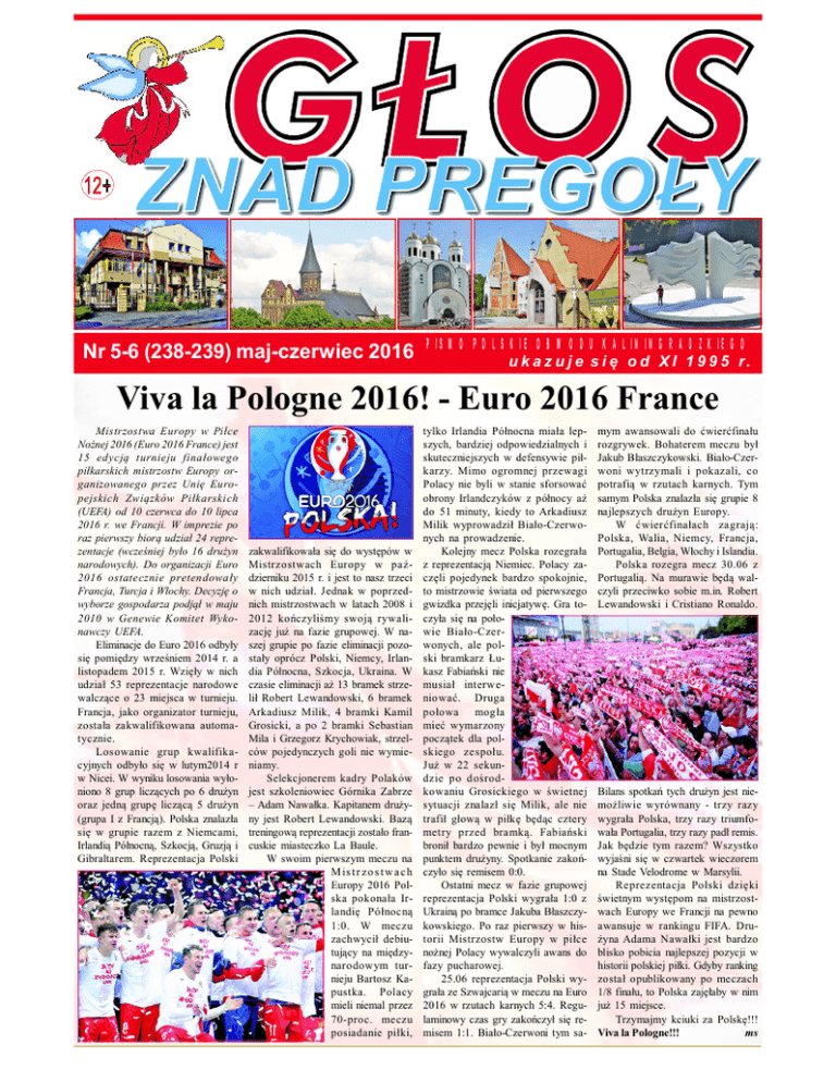 Nr 5-6 (238-239) maj-czerwiec 2016 PISMO POLSKIE OBWODU KALININGRADZKIEGO u k a z u j e s i o d X I 1 9 9 5 r. Viva la Pologne 2016! - Euro 2016 France Mistrzostwa Europy w Pi ce No nej 2016 (Euro 2016 France) jest 15 edycj turnieju fina owego pi karskich mistrzostw Europy organizowanego przez Uni Europejskich Zwi zków Pi karskich (UEFA) od 10 czerwca do 10 lipca 2016 r. we Francji. W imprezie po raz pierwszy bior udzia 24 reprezentacje (wcze niej by o 16 dru yn narodowych). Do organizacji Euro 2016 ostatecznie pretendowa y Francja, Turcja i W ochy. Decyzj o wyborze gospodarza podj w maju 2010 w Genewie Komitet Wykonawczy UEFA. Eliminacje do Euro 2016 odby y si pomi dzy wrze niem 2014 r. a listopadem 2015 r. Wzi y w nich udzia 53 reprezentacje narodowe walcz ce o 23 miejsca w turnieju. Francja, jako organizator turnieju, zosta a zakwalifikowana automatycznie. Losowanie grup kwalifikacyjnych odby o si w lutym2014 r w Nicei. W wyniku losowania wy oniono 8 grup licz cych po 6 dru yn oraz jedn grup licz 5 dru yn (grupa I z Francj ). Polska znalaz a si w grupie razem z Niemcami, Irlandi Pó nocn , Szkocj , Gruzj i Gibraltarem. Reprezentacja Polski zakwalifikowa a si do wyst pów w Mistrzostwach Europy w pa dzierniku 2015 r. i jest to nasz trzeci w nich udzia . Jednak w poprzednich mistrzostwach w latach 2008 i 2012 ko czyli my swoj rywalizacj ju na fazie grupowej. W naszej grupie po fazie eliminacji pozosta y oprócz Polski, Niemcy, Irlandia Pó nocna, Szkocja, Ukraina. W czasie eliminacji a 13 bramek strzeli Robert Lewandowski, 6 bramek Arkadiusz Milik, 4 bramki Kamil Grosicki, a po 2 bramki Sebastian Mila i Grzegorz Krychowiak, strzelców pojedynczych goli nie wymieniamy. Selekcjonerem kadry Polaków jest szkoleniowiec Górnika Zabrze – Adam Nawa ka. Kapitanem dru yny jest Robert Lewandowski. Baz treningow reprezentacji zosta o francuskie miasteczko La Baule. W swoim pierwszym meczu na M is t r z o s t w a c h Europy 2016 Polska pokona a Irlandi Pó nocn 1:0. W meczu zachwyci debiutuj cy na mi dzynarodowym turnieju Bartosz Kapustka. Polacy mieli niemal przez 70-proc. meczu posiadanie pi ki, tylko Irlandia Pó nocna mia a lepszych, bardziej odpowiedzialnych i skuteczniejszych w defensywie pi karzy. Mimo ogromnej przewagi Polacy nie byli w stanie sforsowa obrony Irlandczyków z pó nocy a do 51 minuty, kiedy to Arkadiusz Milik wyprowadzi Bia o-Czerwonych na prowadzenie. Kolejny mecz Polska rozegra a z reprezentacj Niemiec. Polacy zacz li pojedynek bardzo spokojnie, to mistrzowie wiata od pierwszego gwizdka przej li inicjatyw . Gra toczy a si na po owie Bia o-Czerwonych, ale polski bramkarz ukasz Fabia ski nie musia interweniowa . Druga po owa mog a mie wymarzony pocz tek dla polskiego zespo u. Ju w 22 sekundzie po do rodkowaniu Grosickiego w wietnej sytuacji znalaz si Milik, ale nie trafi g ow w pi b c cztery metry przed bramk . Fabia ski broni bardzo pewnie i by mocnym punktem dru yny. Spotkanie zako czy o si remisem 0:0. Ostatni mecz w fazie grupowej reprezentacja Polski wygra a 1:0 z Ukrain po bramce Jakuba B aszczykowskiego. Po raz pierwszy w historii Mistrzostw Europy w pi ce no nej Polacy wywalczyli awans do fazy pucharowej. 25.06 reprezentacja Polski wygra a ze Szwajcari w meczu na Euro 2016 w rzutach karnych 5:4. Regulaminowy czas gry zako czy si remisem 1:1. Bia o-Czerwoni tym sa- mym awansowali do wier fina u rozgrywek. Bohaterem meczu by Jakub B aszczykowski. Bia o-Czerwoni wytrzymali i pokazali, co potrafi w rzutach karnych. Tym samym Polska znalaz a si grupie 8 najlepszych dru yn Europy. W wier fina ach zagraj : Polska, Walia, Niemcy, Francja, Portugalia, Belgia, W ochy i Islandia. Polska rozegra mecz 30.06 z Portugali . Na murawie b walczyli przeciwko sobie m.in. Robert Lewandowski i Cristiano Ronaldo. Bilans spotka tych dru yn jest niemo liwie wyrównany - trzy razy wygra a Polska, trzy razy triumfowa a Portugalia, trzy razy pad remis. Jak b dzie tym razem? Wszystko wyja ni si w czwartek wieczorem na Stade Velodrome w Marsylii. Reprezentacja Polski dzi ki wietnym wyst pom na mistrzostwach Europy we Francji na pewno awansuje w rankingu FIFA. Druyna Adama Nawa ki jest bardzo blisko pobicia najlepszej pozycji w historii polskiej pi ki. Gdyby ranking zosta opublikowany po meczach 1/8 fina u, to Polska zaj aby w nim ju 15 miejsce. Trzymajmy kciuki za Polsk !!! Viva la Pologne!!! ms St r. 2 Nr 5-6 (238-239) maj-czerwiec 2016 Jubileusz 25-lecia odrodzenia struktur Ko cio a Rzymskokatolickiego w Rosji Dwadzie cia pi lat temu – w kwietniu 1991 roku – Papie Jan Pawe II oficjalnie przywróci struktury Ko cio a Rzymskokatolickiego w Rosji. Dwadzie cia pi lat dla ludzkiego ycia to okres bezspornie ogromny, bo w przeci gu takiego czasu dorastaj dzieci, pojawiaj si wnuki, a w przypadku niektórych zamyka si ca e ycie, jednak w perspektywie Bo ej i wiecznej jest to mgnienie, ale mgnienie Boej aski, której moc niezale na jest od czasu. W dniach 22-24 kwietnia 2016 r. w Parafii w. Wojciecha-Adalberta w Kaliningradzie odby y si jubileuszowe uroczysto ci 25-lecia odrodzenia struktur Ko cio a Rzymskokatolickiego w Rosji po czone z obchodami Uroczysto ci w. Wojciecha Adalberta – patrona parafii. Trzydniowe uroczysto ci rozpocz y si w pi tek 22 kwietnia otwarciem wystawy zdj , po wi conej yciu Parafii w ci gu minionych 25-lat na tle ycia Ko cio a w Rosji. Wystawa poczona by a z prezentacj Nowa ksi ka Ojca Jerzego Bp Marian B Pa skiego w Sowiecku. Trzydniowe uroczysto ci ukoronowa a dnia 24 kwietnia niedzielna Msza wi ta, której g ównym celebransem by pierwszy Arcybiskup Archidiecezji Matki Bo ej w Moskwie, obecnie Arcybiskup Mi skoMohylewski Czcigodny Solenizant – Ojciec Jerzy ksi ki Proboszcza Ks. Praata Jerzego Steckiewicza „Wojciech Adalbert w Prusach i Kaliningradzie”. Pierwszy dzie obchodów zako czy si uroczyst Msz wi , której przewodniczy emerytowany Biskup Msza Pi tkowa inauguracja Jubileuszu w. pod przewodnictwem Ks. Abpa Tadeusza Kondrusiewicza Pomocniczy Diecezji Szczeci
