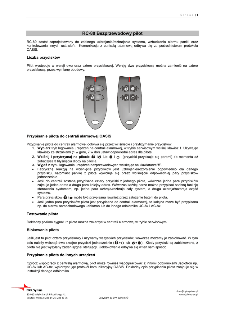 S t r o n a |1 RC-80 Bezprzewodowy pilot RC-80 został zaprojektowany do zdalnego uzbrajania/rozbrajania systemu, wzbudzania alarmu paniki oraz kontrolowania innych ustawień. Komunikacja z centralą alarmową odbywa się za pośrednictwem protokołu OASIS. Liczba przycisków Pilot występuje w wersji dwu oraz cztero przyciskowej. Wersję dwu przyciskową można zamienić na cztero przyciskową, przez wymianę obudowy. Przypisanie pilota do centrali alarmowej OASIS Przypisanie pilota do centrali alarmowej odbywa się przez wciśniecie i przytrzymanie przycisków: 1. Wybierz tryb logowania urządzeń na centrali alarmowej, w trybie serwisowym wciśnij klawisz 1. Używając klawiszy ze strzałkami (1 w górę, 7 w dół) ustaw odpowiedni adres dla pilota. 2. Wciśnij i przytrzymaj na pilocie i lub i (przyciski przypisuje się parami) do momentu aż zobaczysz 3 błyśnięcia diody na pilocie. 3. Wyjdź z trybu logowania urządzeń bezprzewodowych wciskając na klawiaturze“#”. Fabryczną reakcją na wciśnięcie przycisków jest uzbrojenie/rozbrojenie odpowiednio dla danego przycisku, natomiast panikę z pilota wywołuje się przez wciśnięcie odpowiedniej pary przycisków jednocześnie. Jeśli do centrali zostaną przypisane cztery przyciski z jednego pilota, wówczas jedna para przycisków zajmuje jeden adres a druga para kolejny adres. Wówczas każdej parze można przypisać osobną funkcję sterowania systemem, np. jedna para uzbraja/rozbraja cały system, a druga uzbraja/rozbraja część systemu. Para przycisków i może być przypisana również przez założenie baterii do pilota. Jeśli jedna para przycisków pilota jest przypisana do centrali alarmowej, to kolejna może być przypisana np. do alarmu samochodowego Jablotron lub do innego odbiornika UC-8x i AC-8x. Testowanie pilota Dokładny poziom sygnału z pilota można zmierzyć w centrali alarmowej w trybie serwisowym. Blokowanie pilota Jeśli jest to pilot cztero przyciskowy i używamy wszystkich przycisków, wówczas możemy je zablokować. W tym celu należy wcisnąć dwa skrajne przyciski jednocześnie ( + lub + ). Kiedy przyciski są zablokowane, z pilota nie jest wysyłany żaden sygnał sterujący. Odblokowanie odbywa się w ten sam sposób. Przypisanie pilota do innych urządzeń Oprócz współpracy z centralą alarmową, pilot może również współpracować z innymi odbiornikami Jablotron np. UC-8x lub AC-8x, wykorzystując protokół komunikacyjny OASIS. Dokładny opis przypisania pilota znajduje się w instrukcji danego odbiornika. 32-020 Wieliczka Ul. Piłsudskiego 41 tel./fax: +48 (12) 288 14 26; 288 23 75 [email protected] www.jablotron.pl Copyright by DPK System © S t r o n a |2 Wymiana baterii Jeżeli zasięg pracy pilota ulegnie zmniejszeniu, lub nie będzie reakcji na wciśnięcie przycisków, należy wymienić baterię. Należy odkręcić śrubkę w tylnej obudowie, otworzyć wyjąć starą i założyć nową baterie. Zużyte baterie powinny być złomowane zgodnie z aktualnym prawem danego kraju. Kasowanie pilota z systemu Aby usunąć pilota z systemu należy wybrać: tryb dodawania urządzeń ( w trybie serwisowym wciśnij 1), a następnie adres zajmowany przez pilota i przytrzymując 2 na klawiaturze usunąć wybraną pozycję (pilot cztero przyciskowy zajmuje dwa adresy, po jednym dla pary przycisków). Parametry techniczne Zasilanie: Żywotność baterii: Częstotliwość: Zasięg pracy Środowisko działania zgodne z EN 50131-1 Temperatura pracy Może pracować zgodnie z: Zgodny z: bateria alkaliczna typu L1016 (6.0 V) około 3 lata (5 aktywacji dziennie) 868 MHz, protokół Oasis około.30 metrów (otwarta przestrzeń) II. wewnętrzne -10 to +40 °C ERC REC 70-03 ETSI EN 300220, EN 55022, EN 50134-2 EN 50130-4,EN 60950-1 JABLOTRON Ltd. deklaruje, iż urządzenie spełnia wszystkie wymogi Dyrektywy 1999/5/EC. Kopia deklaracji zgodności znajduje się na stronie internetowej www.jablotron.pl Uwaga: Pomimo, że produkt nie zawiera żadnych niebezpiecznych materiałów, prosimy po użyciu o zwrot produktu do producenta lub dystrybutora. 32-020 Wieliczka Ul. Piłsudskiego 41 tel./fax: +48 (12) 288 14 26; 288 23 75 [email protected] www.jablotron.pl Copyright by DPK System ©