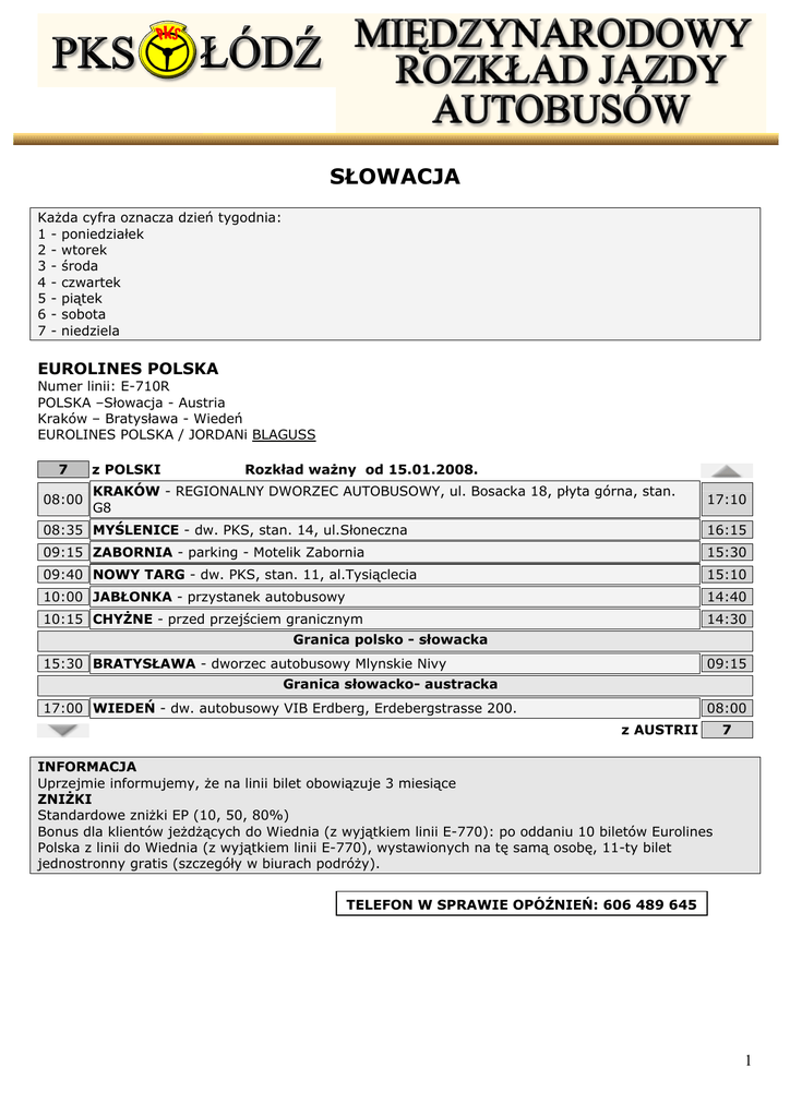SŁOWACJA Każda cyfra oznacza dzień tygodnia: 1 - poniedziałek 2 - wtorek 3 - środa 4 - czwartek 5 - piątek 6 - sobota 7 - niedziela EUROLINES POLSKA Numer linii: E-710R POLSKA –Słowacja - Austria Kraków – Bratysława - Wiedeń EUROLINES POLSKA / JORDANi BLAGUSS 7 08:00 z POLSKI Rozkład ważny od 15.01.2008. KRAKÓW - REGIONALNY DWORZEC AUTOBUSOWY, ul. Bosacka 18, płyta górna, stan. G8 17:10 08:35 MYŚLENICE - dw. PKS, stan. 14, ul.Słoneczna 16:15 09:15 ZABORNIA - parking - Motelik Zabornia 15:30 09:40 NOWY TARG - dw. PKS, stan. 11, al.Tysiąclecia 15:10 10:00 JABŁONKA - przystanek autobusowy 14:40 10:15 CHYŻNE - przed przejściem granicznym 14:30 Granica polsko - słowacka 15:30 BRATYSŁAWA - dworzec autobusowy Mlynskie Nivy 09:15 Granica słowacko- austracka 17:00 WIEDEŃ - dw. autobusowy VIB Erdberg, Erdebergstrasse 200. 08:00 z AUSTRII 7 INFORMACJA Uprzejmie informujemy, że na linii bilet obowiązuje 3 miesiące ZNIŻKI Standardowe zniżki EP (10, 50, 80%) Bonus dla klientów jeżdżących do Wiednia (z wyjątkiem linii E-770): po oddaniu 10 biletów Eurolines Polska z linii do Wiednia (z wyjątkiem linii E-770), wystawionych na tę samą osobę, 11-ty bilet jednostronny gratis (szczegóły w biurach podróży). TELEFON W SPRAWIE OPÓŹNIEŃ: 606 489 645 1 EUROLINES POLSKA Numer linii: E-710W POLSKA –Słowacja - Austria Kraków – Bratysława - Wiedeń EUROLINES POLSKA / JORDAN i BLAGUSS 1234567 z POLSKI Rozkład ważny od 01.03.2008 r. 20:00 KRAKÓW - REGIONALNY DWORZEC AUTOBUSOWY, ul. Bosacka 18, płyta górna, stan. G8 +05:10 20:35 MYŚLENICE - dw. PKS, stan. 14, ul.Słoneczna +04:15 21:15 ZABORNIA - parking - Motelik Zabornia +03:30 21:40 NOWY TARG - dw. PKS, stan. 11, al.Tysiąclecia +03:10 22:00 JABŁONKA - przystanek autobusowy +02:40 22:15 CHYŻNE - przed przejściem granicznym +02:30 Granica polsko - słowacka +04:00 BRATYSŁAWA - dworzec autobusowy Mlynskie Nivy 22:15 Granica słowacko- austracka +05:00 WIEDEŃ - dw. autobusowy VIB Erdberg, Erdebergstrasse 200. Zobacz opis przystanku. 21:00 z AUSTRII 1234567 INFORMACJA Uprzejmie informujemy, że na linii bilet obowiązuje 3 miesiące KURSY ANULOWANE z POLSKI: 24, 25, 31.12.2007 z AUSTRII: 24, 25, 31.12.2007 ZNIŻKI Standardowe zniżki EP (10, 50, 80%) Bonus dla klientów jeżdżących do Wiednia (z wyjątkiem linii E-770): po oddaniu 10 biletów Eurolines Polska z linii do Wiednia (z wyjątkiem linii E-770), wystawionych na tę samą osobę, 11-ty bilet jednostronny gratis (szczegóły w biurach podróży EUROLINES POLSKA Numer linii: E-740 POLSKA –Słowacja - Austria Tarnów – Bratysława - Wiedeń EUROLINES POLSKA / JORDAN i BLAGUSS 1234567 z POLSKI Rozkład ważny od 15.01.2008 r. 18:15 TARNÓW - dw. PKS, stan. 10, ul.Dworcowa +07:00 18:50 BRZESKO - dw. PKS, stan. przelotowe, pl.Żwirki i Wigury +06:05 20:00 NOWY SĄCZ - dw. PKS, stan. 8, ul.Gen. Dąbrowskiego +04:50 20:30 LIMANOWA - dw. PKS, stan. 1, ul.Targowa +04:20 20:55 MSZANA DOLNA - przystanek przy dw. PKP +03:55 22:10 CHYŻNE - przed przejściem granicznym +02:30 Granica polsko - słowacka +04:00 BRATYSŁAWA - dworzec autobusowy Mlynskie Nivy 22:15 Granica słowacko- austracka +05:15 WIEDEŃ - dw. autobusowy VIB Erdberg, Erdebergstrasse 200. Zobacz opis przystanku. 21:00 z AUSTRII 1234567 2 INFORMACJA Uprzejmie informujemy, że na linii bilet obowiązuje 3 miesiące. KURSY ANULOWANE z POLSKI: 24, 25, 31.12.2007 z AUSTRII: 24, 25, 31.12.2007 ZNIŻKI Standardowe zniżki EP (10, 50, 80%) Bonus dla klientów jeżdżących do Wiednia (z wyjątkiem linii E-770): po oddaniu 10 biletów Eurolines Polska z linii do Wiednia (z wyjątkiem linii E-770), wystawionych na tę samą osobę, 11-ty bilet jednostronny gratis (szczegóły w biurach podróży). EUROLINES POLSKA Numer linii: E-750 POLSKA –Słowacja - Austria Lublin – Bratysława - Wiedeń Linia obsługiwana przez: JORDAN oraz firmę partnerską: BLAGUSS, PKS RZESZÓW Rozkład ważny od 15.01.2008 1234567 z POLSKI 13:15 LUBLIN - * dw. PKS, stan. 7, al.Tysiąclecia 6 +11:20 14:15 KRAŚNIK - * dw. PKS, stan. 5, ul.Lubelska +10:25 14:55 JANÓW LUBELSKI - * dw. PKS, stan. 3, Rynek +09:50 16:50 RZESZÓW - dw. autobusowy +08:00 18:10 KROSNO - dw. autobusowy +06:40 18:40 JASŁO - dw. autobusowy +06:10 19:15 GORLICE - dw. autobusowy +05:35 20:00 NOWY SĄCZ - dw. autobusowy +04:50 22:10 CHYŻNE - przejście graniczne +02:30 Granica polsko - słowacka +04:00 BRATYSŁAWA - dworzec autobusowy Mlynskie Nivy 22:15 Granica słowacko- austracka +05:00 WIEDEŃ - dw. autobusowy VIB Erdberg, Erdebergstrasse 200. Zobacz opis przystanku. 21:00 z AUSTRII 1234567 TELEFON W SPRAWIE OPÓŹNIEŃ: 606 489 645 INFORMACJA Uprzejmie informujemy, że na linii bilet obowiązuje 3 miesiące. KURSY ANULOWANE z POLSKI: 24, 25, 31.12.2007 z AUSTRII: 24, 25, 31.12.2007 LINIA E-750 JEST SKOMUNIKOWANA Z LINIĄ E-715 SALZBURG/ZURICH * - Informacja! Uprzejmie informujemy, że w Rzeszowie przewidywana jest przesiadka dla pasażerów z miast: Lublin, Kraśnik, Janów Lubelski. ZNIŻKI Standardowe zniżki EP (10, 50, 80%) Bonus dla klientów jeżdżących do Wiednia (z wyjątkiem linii E-770): po oddaniu 10 biletów Eurolines Polska z linii do Wiednia (z wyjątkiem linii E-770), wystawionych na tę samą osobę, 11-ty bilet jednostronny gratis (szczegóły w biurach podróży). 3 ZASADY SPRZEDAŻY BILETÓW NA TRASIE: POLSKA – AUSTRIA EUROLINES POLSKA / JORDAN ZNIŻKI: 50% - dzieci do 12 lat. Bonus dla klientów jeżdżących na liniach do Wiednia, tzn.: po oddaniu 10-ciu biletów Eurolines Polska (Jordan) - 11-sty bilet gratis. UWAGA: Dzieci i młodzież do lat 16 mogą podróżować tylko pod opieką osoby dorosłej. Młodzież w wieku 16-18 lat może podróżować bez osoby dorosłej, lecz tylko za okazaniem poświadczonej notarialnie zgody obojga rodziców (lub opiekunów) na samodzielną podróż z adnotacją zawierającą telefon bądź adres kontaktowy osoby zapraszającej bądź na podstawie odpowiedniego "Upoważnienia na p