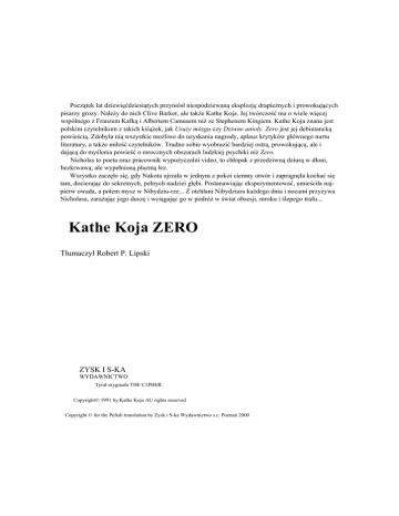 Początek lat dziewięćdziesiątych przyniósł niespodziewaną eksplozję drapieżnych i prowokujących pisarzy grozy. Należy do nich Clive Barker, ale także Kathe Koja. Jej twórczość ma o wiele więcej wspólnego z Franzem Kafką i Albertem Camusem niż ze Stephenem Kingiem. Kathe Koja znana jest polskim czytelnikom z takich książek, jak Urazy mózgu czy Dziwne anioły. Zero jest jej debiutancką powieścią. Zdobyła nią wszystkie możliwe do uzyskania nagrody, aplauz krytyków głównego nurtu literatury, a także miłość czytelników. Trudno sobie wyobrazić bardziej ostrą, prowokującą, ale i dającą do myślenia powieść o mrocznych obszarach ludzkiej psychiki niż Zero. Nicholas to poeta oraz pracownik wypożyczalni video, to chłopak z przedziwną dziurą w dłoni, bezkrwawą, ale wypełnioną plazmą łez. Wszystko zaczęło się, gdy Nakota ujrzała w jednym z pokoi ciemny otwór i zapragnęła kochać się tam, docierając do sekretnych, pełnych nadziei głębi. Postanawiając eksperymentować, umieściła najpierw owada, a potem mysz w Nibydziu-rze... Z otchłani Nibydziura każdego dnia i nocami przyzywa Nicholasa, zarażając jego duszę i wciągając go w podróż w świat obsesji, mroku i ślepego trafu... Kathe Koja ZERO Tłumaczył Robert P. Lipski ZYSK I S-KA WYDAWNICTWO Tytuł oryginału THE C1PHER Copyright© 1991 by Kathe Koja AU rights reserved Copyright © for the Polish translation by Zysk i S-ka Wydawnictwo s.c. Poznań 2000 Opracowanie graficzne serii i projekt okładki Lucyna Talejko-Kwiatkowska Fotografia na okładce Piotr Chojnacki Redaktor serii Tadeusz Zysk Redakcja Anna Poniedziałek Wydanie I ISBN 83-7150-581-7 Zysk i S-ka Wydawnictwo s.c. ul. Wielka 10,61-774 Poznań tel. (0-61) 853 27 51, 853 27 67, fax 852 63 26 Dział handlowy, ul. Zgoda 54. 60-122 Poznań tel. (0-61)864 14 03,864 14 04 e-mail: [email protected] nasza strona: www.zysk.com.pl DRUKARNIA GS Kraków, tel. (012) 65 65 902 Chciałabym podziękować Rickowi Liederowi, Russowi Galenowi i Jeanne Cavelos za ich pomoc Jednego pragnę być balsamem na ranę rozpuszczonym twoją śliną — Shikatsube No Magao Świadomość czy podświadomość w realnym świecie to bez znaczenia — Rick Lieder 1 Nakota dostrzegła to pierwsza: długie, chude nogi podkulone pod brzydką spódnicą, szerokie usta wykrzywione w dziwnym nie-uśmie-chu. Siedzi w moim paskudnym mieszkaniu na drugim piętrze, skulona na tanim, szpetnym sklepowym krześle, przez okno za jej plecami wpływają promienie słońca, nieśmiałe i szare jak brudne futro, ożywiają ją, przydając osobliwej, roziskrzonej aury. Wokół nas szczątki niedawnej dyskusji, pogniecione puszki po piwie i skradziona z knajpy popielniczka, z której wysypuje się góra petów. — Słyszałeś o czarnych dziurach? — zapylała. — Wiesz, tych w kosmosie? Wielkie, czarne odbyty — i wybuchnęła śmiechem, ukazując małe ząbki, ostre jak u lisa, ani białe, ani żółtawe, jak u większości ludzi, lecz sinawe, jakby zżerała je od środka jakaś bliżej nieokreślona zaraza. Nakota zgnije inaczej niż reszta ludzi; sama zresztą tak o sobie mówi. Zapaliła papierosa. Była jedyną z moich przyjaciółek, która wciąż paliła; robiła to nie w wyzywający ani przesadnie teatralny sposób, paliła podobnie jak oddychała, choć nie tak często. Czarne papierosy i oranżada. 1 To jak? Dotkniesz jej dzisiaj? 2 Nie. Kolejny dziwny nie-uśmiech. 3 Tchórz. 4 Wcale nie — odparłem. 5 Tchórz pospolity. Nie powiedziałem nic więcej. Wróciłem do kuchni. Wziąłem sobie mineralkę. Piwo było zbyt mocno schłodzone, picie go sprawiało ból. Kiedy wróciłem do salonu, a raczej tego, co mogło zań uchodzić — wielkie okna, nieduża przestrzeń, tapczan i nędzne krzesło — uśmiechnęła się do mnie, tym razem prawdziwie i szczerze. Czasami wydawało mi się, że byłem jedynym człowiekiem, który kiedykolwiek dostrzegał jej piękno, który kiedykolwiek je dostrzegł. Bóg mi świadkiem, nie było to łatwe, ale wychwytywałem każdy najdrobniejszy szczegół. — Przyjrzyjmy się jej —powiedziała. Nie próbowałem oponować. Cicho — nauczyliśmy się robić to w ciszy — w dół po schodach, na pierwszym podeście w prawo (pierwsze piętro) obok nowego graffiti głoszącego, że „LEESA TO KORWA" (naturalnie bez numeru telefonu, dzięki i za to, tandecia-rze) i mnóstwa innych blednących wraz z upływem czasu wymyślnych napisów, aż do końca korytarzyka, gdzie znajdowało się coś, co mogło pełnić funkcję składziku. Butelki detergentów, narzędzia, cała masa najróżniejszego szajsu, oto co widać po otwarciu drzwi, a nieco dalej to miejsce, ta przestrzeń. Powłoka kurzu wokół niej wydaje się bledsza i łatwiejsza do rozproszenia. Oto Nibydziura. — Cholera — rzekła Nakota, jak zawsze ze zdumieniem i prze jęciem. Uklękła bliżej niż ja kiedykolwiek, pochyliła się nisko i oparła na wyprostowanych rękach, wpatrując się w dziurę, patrząc w głąb niej. Wydawało się, że mogła tak klęczeć cały dzień mimo bolesnej pozycji, ona jednak w ogóle nie czuła bólu. tylko gapiła się i gapiła bez końca. Zająłem miejsce nieco z tyłu za nią, po lewej, pogrążony w pełnej uniesienia ciszy. Cóż tu mówić w obliczu niewypowiedzianego? Czerń, nie ciemność ani brak światła, ale żyjąca czerń. Stopa, może trochę więcej średnicy. Czysta czerń i wrażenie pulsowania, zwłaszcza gdy wpatrywałeś się w nią długo i zawzięcie, uczucie nie tyle czegoś żyjącego, ale żywego, ba. nawet nie czegoś, lecz raczej jakiegoś procesu. Królicza nora, jakaś dziwna, popierdolona kraina czarów. Znajdź teraz dziewczynkę imieniem Alicja, obwiąż ją sznurkiem i... Już o tym rozmawialiśmy i będziemy rozmawiać znowu, zapewne jeszcze dzisiejszego wieczoru. Nakota usiądzie w typowy dla siebie sposób, z wyprostowanymi plecami, niczym kapłanka, a ja zabiorę się do tworzenia