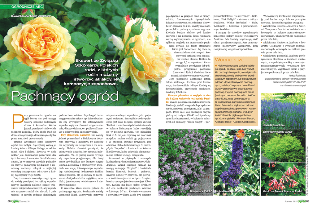 OGRODNICZE ABC Ekspert ze Związku Szkółkarzy Polskich radzi, z których roślin możemy stworzyć atrakcyjne kompozycje zapachowe. Pachnący ogród P rzy planowaniu ogrodu na ogół bierze się pod uwagę walory ozdobne sadzonych drzew i krzewów. Warto jednak pamiętać także o ich pięknym zapachu, który może stać się dodatkową atrakcją, docenianą nie tylko przez nas, ale i przez owady. Trudno wyobrazić sobie kolorowy ogród bez motyli. Najczęściej wabią je kwiaty koloru żółtego, białego, w odcieniach różu i fioletu. Zawarty w nich nektar jest doskonałym pokarmem dla tych barwnych owadów. Jeżeli chcemy zatem, by w naszym ogrodzie pojawiły się motyle, postarajmy się dla nich o słoneczny zaciszny zakątek – najlepiej osłonięty żywopłotem od strony, z której najczęściej wieje wiatr. Przy tworzeniu aromatycznego ogrodu należy pamiętać, że rośliny o pachnących kwiatach najlepiej sadzić właśnie w miejscach zacisznych, aby zapach nie rozprzestrzeniał się zbytnio i „nie uciekał” z ogrodu podczas silniejszych 88 Czerwiec 2011 podmuchów wiatru. Zapobiegać temu mogą rozmaite osłony, np. ściany budynku czy żywopłoty. Na intensywność zapachu wpływa również wilgotna ziemia, dlatego dobrze jest podlewać krzewy z odpowiednią częstotliwością. Przy planowaniu nasadzeń nie należy jednak przesadzać z ilościowym doborem krzewów i kwiatów, by zapachy nie wypierały się wzajemnie i nie mieszały. Należy również pamiętać, że odczuwanie zapachu jest sprawą indywidualną. To, co jednej osobie wydaje się zapachem przyjemnym, dla innej może być drażliwe czy duszące. Często jest tak, że rośliny o efektownych kwiatach nie mają intensywnego zapachu (np. rododendrony) i odwrotnie. Roślina ładnie pachnie, ale jej kwiaty są niepozorne. Jest jednak kilka wyjątków, m.in. lilaki, jaśminowce, wiciokrzewy i niektóre magnolie. Z krzewów, które można polecić do pachnącego ogrodu, koniecznie należy wymienić lilaki. Zachwycają zarówno niepowtarzalnym zapachem, jak i pięknymi kwiatami. Szczególnie godny polecenia jest lilak Meyera Syringa meyeri ‘Palibin’ o wiechowatych kwiatostanach w kolorze fioletowym, które rozwijają się w połowie czerwca. Ten niewielki lilak (1,5 m) jest odporny na warunki miejskie, można sadzić go pojedynczo i w grupach. Równie przydatna jest odmiana lilaka drobnolistnego S. microphylla ‘Superba’ o kwiatach w kolorze lilaróżowym, które pojawiają się ponownie na roślinie w ciągu całego lata. Krzewami o pięknych i wonnych kwiatach są również jaśminowce Philadelphus. Wśród licznych odmian na uwagę zasługuje ‘Virginal’ o kwiatach bardzo licznych, białych i pełnych. Kwitnie obficie w czerwcu, ale powtarza kwitnienie jeszcze w lipcu. Drugim, bardzo cennym jaśminowcem jest ‘Albatre’. Kwiaty ma białe, pełne, średnicy 4-5 cm, delikatnie pachnące, zebrane w kiście po 5-7 szt. Kwitnie w czerwcu i powtórnie w lipcu. Może być sadzony pojedynczo i w grupach oraz w niewysokich, formowanych żywopłotach. Równie atrakcyjna jest odmiana ‘Snowbelle’. Dorasta do 2 m, kwiaty ma białe, pełne, lekko pachnące, zebrane w grona. Kwitnie bardzo obficie pod koniec czerwca i na początku lipca. Odmianą wartą wykorzystania w ogrodach, nie tylko ze względu na intensywnie pachnące kwiaty, ale także atrakcyjne liście, jest ‘Innocence’. Jej liście są ciemnozielone z żółtawymi i kremowymi cętkami oraz smugami wzdłuż blaszki. Roślina ta osiąga 1,5 m wysokości. Kwiaty ma białe, pojedyncze lub półpełne, przyjemnie pachnące (czerwiec i lipiec). Ozdobne liście ma też jaśminowiec wonny ‘Aureus’. Jego jasnożółte ulistnienie latem lekko zielenieje. Kwitnie pod koniec maja, bardzo obficie i długo. Kwiaty są kremowobiałe, przyjemnie pachnące, średnicy 2,5-3 cm. Cennym gatunkiem ze względu na długie i późne kwitnienie jest budleja Dawida, zwana potocznie motylim krzewem. Można ją sadzić w ogrodach przydomowych, zarówno pojedynczo, jak i w grupach. Przez całe lato zachwyca swymi pięknymi, dużymi (30-40 cm) i pachnącymi kwiatostanami, w kolorach zależnych od odmiany: ‘Black Knight’ – pur- purowofioletowe, ‘Ile de France’ – fioletowe, ‘Pink Delight’ – różowe z żółtym środkiem, ‘White Profusion’ – białe, ‘Lochinch’ – fioletowe z pomarańczowym środkiem. Z pnączy do ogrodów zapachowych koniecznie należy polecić wiciokrzewy Lonicera. Ich kwiaty wydzielają dość silny i przyjemny zapach. Jest on szczególnie intensywny wieczorem, przy zwiększonej wilgotności powietrza. Wonne róże ● Niekwestionowaną ozdobą każdego ogrodu są róże Rosa. Nie wszystkie pachną intensywnie, ale większość charakteryzuje się delikatnym, orzeźwiającym zapachem. Do ciekawszych odmian, dość intensywnie pachnących, należą róże pnące ‘New Dawn’ (kwiaty jasnoróżowe) oraz ‘Lawinia’ (różowe). Pięknie pachną róże dzikie (kwitną w czerwcu). Ponadto niektóre gatunki, np. róża pomarszczona R. rugosa mają przyjemnie pachnące liście. Również u większości odmian współczesnych róż parkowych kwiaty są szlachetnego kształtu, w dużych kwiatostanach, pięknie pachnące, np. róże angielskie ‘Abraham Derby’, ‘Cottage Rose’, ‘Golden Celebration’. Wiciokrzewy kwitnienie rozpoczynają pod koniec maja lub na początku czerwca. Szczególnie godne uwagi są: • wiciokrzew Browna Lonicera x brownii ‘Dropmore Scarlet’ o kwiatach rurkowatych w kolorze pomarańczowoczerwonym, ukazujących się na roślinie przez całe lato, • wiciokrzew Heckrotta Lonicera x heckrottii ‘Goldflame’ o kwiatach różowoczerwonych, obecnych na roślinie prawie przez całe lato, • wiciokrzew pomorski Lonicera periclymenum ‘Serotina’ o kwiatach rurkowych, z wywiniętą warżką, z zewnątrz różowopurpurowych, wewnątrz kremowobiałych, wyjątkowo silnie i przyjemnie pachnących prze