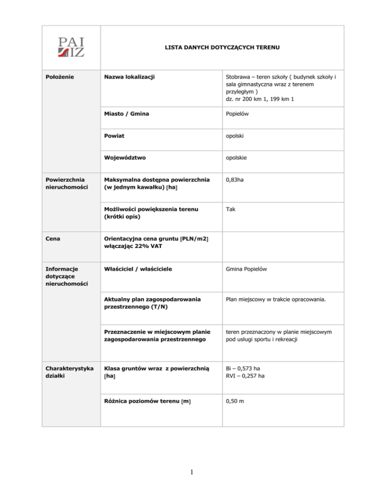 LISTA DANYCH DOTYCZĄCYCH TERENU Położenie Powierzchnia nieruchomości Nazwa lokalizacji Stobrawa – teren szkoły ( budynek szkoły i sala gimnastyczna wraz z terenem przyległym ) dz. nr 200 km 1, 199 km 1 Miasto / Gmina Popielów Powiat opolski Województwo opolskie Maksymalna dostępna powierzchnia (w jednym kawałku) ha 0,83ha Możliwości powiększenia terenu (krótki opis) Tak Cena Orientacyjna cena gruntu PLN/m2 włączając 22% VAT Informacje dotyczące nieruchomości Właściciel / właściciele Gmina Popielów Aktualny plan zagospodarowania przestrzennego (T/N) Plan miejscowy w trakcie opracowania. Przeznaczenie w miejscowym planie zagospodarowania przestrzennego teren przeznaczony w planie miejscowym pod usługi sportu i rekreacji Klasa gruntów wraz z powierzchnią ha Bi – 0,573 ha RVI – 0,257 ha Różnica poziomów terenu m 0,50 m Charakterystyka działki 1 Ograniczenia budowlane Obecne użytkowanie Obiekt szkoły obecnie nie użytkowany Zanieczyszczenia wód powierzchniowych i gruntowych (T/N) Nie Odpady znajdujące się na terenie (T/N) Nie Poziom wód gruntowych m 1,50 – 2,00 m Ryzyko wystąpienia zalań lub obsunięć terenu (T/N) Nie Przeszkody podziemne (T/N) Nie Przeszkody występujące na powierzchni terenu (T/N) Nie Istniejące ograniczenia ekologiczne (T/N) Nie Budynki i zabudowania na terenie (T/N) Nie Procent dopuszczalnej zabudowy 75 % Ograniczenia wysokości budynków m 10 m Strefa buforowa m Nie 2 Połączenia transportowe Istniejąca infrastruktura Inne, jeśli występują Nie Droga dojazdowa do terenu (rodzaj drogi i jej szerokość) Dojazd do działki bezpośrednio drogą gminną o nawierzchni asfaltowej o szerokości około 5,00 m, połączonej bezpośrednio z drogą wojewódzką 457 Brzeg – Dobrzeń Wielki - Namysłów Autostrada / droga krajowa km Nieruchomość oddalona od Autostrady A-4 o około 30 km. Kolej km Linia kolejowa PKP Opole Groszowice – Jelcz, Wrocław, Brochów; przebiega w odległości około 8 km Bocznica kolejowa km Bocznica kolejowa znajduje się w odległości około 8,00 km, w miejscowości Karłowice Najbliższe lotnisko międzynarodowe km Wrocław – Airport Copernicus – około 50 km Najbliższe miasto wojewódzkie km Opole Elektryczność na terenie (T/N) Tak Odległość przyłącza od granicy terenu 30 Napięcie SN Dostępna moc Na warunkach zakładu energetycznego ( EnergiaPro) Gaz na terenie (T/N) Nie Odległość przyłącza od granicy działki - Wartość kaloryczna - 3 Uwagi Średnica rury - Dostępna objętość - Woda na terenie (T/N) Tak Odległość przyłącza od granicy terenu 30 Dostępna objętość Na warunkach Międzygminnego Zakładu wodociągów I Kanalizacji „PROWOD” Kanalizacja na terenie (T/N) Nie Odległość przyłącza od granicy terenu - Dostępna objętość - Ograniczenie zrzutu ścieków - Odprowadzenie wód deszczowych na terenie (T/N) Na teren posesji Oczyszczalnia ścieków na terenie bądź w bezpośrednim sąsiedztwie - Telefony (T/N) Tak Odległość przyłącza od granicy terenu Około 30 m Liczba dostępnych linii analogowych Na warunkach operatora sieci Liczba dostępnych linii ISDN Na warunkach operatora sieci W projektowanym planie zagospodarowania przestrzennego wsi Stobrawa przedmiotowy teren przeznaczony jest pod usługi Teren graniczy ze Stobrawskim Parkiem Krajobrazowym oraz obszarem Natura 2000 Charakteryzuje się dobrymi połączeniami drogowymi z głównymi ciągami dróg powiatowych i wojewódzkich. Na działce istnieje należy wydzielić drogi wewnętrzne. 4 Osoba przygotowująca ofertę Mateusz Macioszek tel.: 0048 77 4275851, [email protected] Osoby do kontaktu Mateusz Macioszek, Anna Lis tel.: 0048 77 4275851, 0048 77 4275852 [email protected], [email protected] 5