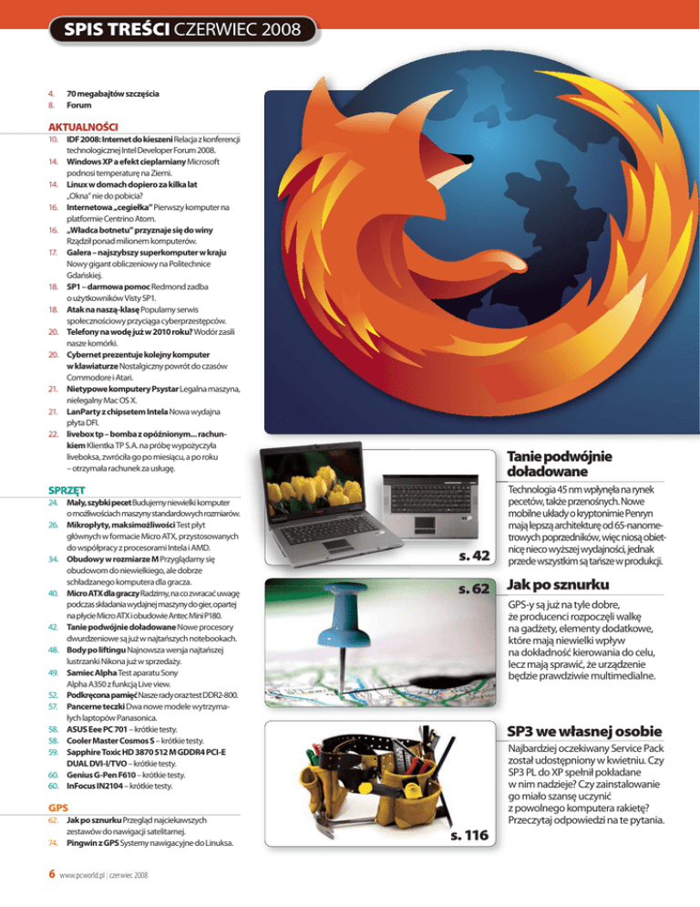 SPIS TREŚCI CZERWIEC 2008 4. 8. 70 megabajtów szczęścia Forum AKTUALNOŚCI 10. IDF 2008: Internet do kieszeni Relacja z konferencji technologicznej Intel Developer Forum 2008. 14. Windows XP a efekt cieplarniany Microsoft podnosi temperaturę na Ziemi. 14. Linux w domach dopiero za kilka lat „Okna” nie do pobicia? 16. Internetowa „cegiełka” Pierwszy komputer na platformie Centrino Atom. 16. „Władca botnetu” przyznaje się do winy Rządził ponad milionem komputerów. 17. Galera – najszybszy superkomputer w kraju Nowy gigant obliczeniowy na Politechnice Gdańskiej. 18. SP1 – darmowa pomoc Redmond zadba o użytkowników Visty SP1. 18. Atak na naszą-klasę Popularny serwis społecznościowy przyciąga cyberprzestępców. 20. Telefony na wodę już w 2010 roku? Wodór zasili nasze komórki. 20. Cybernet prezentuje kolejny komputer w klawiaturze Nostalgiczny powrót do czasów Commodore i Atari. 21. Nietypowe komputery Psystar Legalna maszyna, nielegalny Mac OS X. 21. LanParty z chipsetem Intela Nowa wydajna płyta DFI. 22. livebox tp – bomba z opóźnionym... rachunkiem Klientka TP S.A. na próbę wypożyczyła liveboksa, zwróciła go po miesiącu, a po roku – otrzymała rachunek za usługę. Tanie podwójnie doładowane s. 42 Technologia 45 nm wpłynęła na rynek pecetów, także przenośnych. Nowe mobilne układy o kryptonimie Penryn mają lepszą architekturę od 65-nanometrowych poprzedników, więc niosą obietnicę nieco wyższej wydajności, jednak przede wszystkim są tańsze w produkcji. s. 62 Jak po sznurku SPRZĘT 24. Mały, szybki pecet Budujemy niewielki komputer o możliwościach maszyny standardowych rozmiarów. 26. Mikropłyty, maksimożliwości Test płyt głównych w formacie Micro ATX, przystosowanych do współpracy z procesorami Intela i AMD. 34. Obudowy w rozmiarze M Przyglądamy się obudowom do niewielkiego, ale dobrze schładzanego komputera dla gracza. 40. Micro ATX dla graczy Radzimy, na co zwracać uwagę podczas składania wydajnej maszyny do gier, opartej na płycie Micro ATX i obudowie Antec Mini P180. 42. Tanie podwójnie doładowane Nowe procesory dwurdzeniowe są już w najtańszych notebookach. 48. Body po liftingu Najnowsza wersja najtańszej lustrzanki Nikona już w sprzedaży. 49. Samiec Alpha Test aparatu Sony Alpha A350 z funkcją Live view. 52. Podkręcona pamięć Nasze rady oraz test DDR2-800. 57. Pancerne teczki Dwa nowe modele wytrzymałych laptopów Panasonica. 58. ASUS Eee PC 701 – krótkie testy. 58. Cooler Master Cosmos S – krótkie testy. 59. Sapphire Toxic HD 3870 512 M GDDR4 PCI-E DUAL DVI-I/TVO – krótkie testy. 60. Genius G-Pen F610 – krótkie testy. 60. InFocus IN2104 – krótkie testy. GPS-y są już na tyle dobre, że producenci rozpoczęli walkę na gadżety, elementy dodatkowe, które mają niewielki wpływ na dokładność kierowania do celu, lecz mają sprawić, że urządzenie będzie prawdziwie multimedialne. SP3 we własnej osobie Najbardziej oczekiwany Service Pack został udostępniony w kwietniu. Czy SP3 PL do XP spełnił pokładane w nim nadzieje? Czy zainstalowanie go miało szansę uczynić z powolnego komputera rakietę? Przeczytaj odpowiedzi na te pytania. GPS 62. Jak po sznurku Przegląd najciekawszych zestawów do nawigacji satelitarnej. 74. Pingwin z GPS Systemy nawigacyjne do Linuksa. 6 www.pcworld.pl | czerwiec 2008 s. 116 VOIP s. 126 78. Kombajny dają głos Przegląd sieciowych kombajnów z bramką VoIP. 86. Tani telefon Jest wiele ofert telefonii internetowej – jak płacić mniej? 90. Rozmowy bez granic Tanie gadanie przez komunikator głosowy. TECHNOLOGIE Firefox 3 Stabilność, szybkość, bezpieczeństwo – oto trzy słowa najlepiej oddające wygląd i działanie Firefoksa 3.0. Najnowsza przeglądarka Mozilli powinna ugruntować mocną pozycję aplikacji w Polsce. s. 37 Aplus Blockbuster Storm Opłacalność 4,8 s. 28 ASUS P5E-VM HDMI 92. Sportowe komputery Pecety pomagają trenerom, sędziom, widzom. 100. Internet bezprawia Coraz częściej w wirtualnych światach przekraczane jest prawo. 103. Żywe slajdy Prosto z Japonii nowe lekarstwo przeciwko ziewaniu na nudnych prezentacjach. BEZPIECZEŃSTWO 106. Odporny na wirusy Jak działa większość obecnych wirusów? Jak się rozprzestrzeniają? 110. Pocztowe myszkowanie Wykryj szpiegów, którzy czytają twoją korespondencję. 112. Jak długo przetrwają twoje dane? Co zrobić, żeby nie utracić ważnych informacji. 115. Ochrona bezobsługowa Dlaczego ESET Smart Security jest prawdopodobnie najszybszym pakietem ochronnym? OPROGRAMOWANIE 116. SP3 we własnej osobie Poznaj Service Pack 3 do Windows XP. 122. Vista SP1 Co nowego zawiera pakiet aktualizacyjny? Czy warto go instalować? 125. SP1 w liczbach Oficjalne testy wydajności. 126. Firefox 3 – król przeglądarek Najnowsze dziecko Mozilla Foundation deklasuje konkurencję. 130. Efektowny fotoalbum Przygotowujemy pokaz zdjęć i nagrywamy go na płytę DVD. 133. Bez kasy, a nadal z klasą Oprogramowanie freeware oraz open source jest niezwykle cenione przez użytkowników. 136. Sprawdź, za co płacisz Oprogramowanie komercyjne, o którym już jest lub będzie głośno. 138. Otwarta przestrzeń biurowa OpenOffice.org – coraz lepszy dzięki dodatkowym wtyczkom. 140. Kopie zapasowe z automatu Mechanizm backupu w Windows Serverze potrafi klonować ustawienia systemów operacyjnych, aplikacje, pliki. 144. Wszechstronny ochroniarz Oceniamy Symantec Nortona 360 2.0. 145. Z redakcyjnej biblioteki Flash pomocnikiem webmastera, zdalna praca przez VPN, nowa jakość aplikacji internetowych dzięki technologii AJAX – polecane książki. Ocena końcowa 7,7 INTERNET 154. Głośno o przeglądarkach Wydarzenia w Internecie. 158. GoogleApps na talerzu Jak uruchomić własne aplikacje Google. s. 44 PROGRAMOWANIE 162. Teleportacja kwantowa Teoria teleportacji to grube tomiszcze. Sam algorytm zajmuje kartkę A5. 169. PCWK online poleca ICom PrestigeBook 6420 Wydajność 7,9 146. C