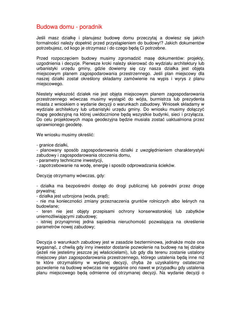 Budowa domu - poradnik Jeśli masz działkę i planujesz budowę domu przeczytaj a dowiesz się jakich formalności należy dopełnić przed przystąpieniem do budowy!? Jakich dokumentów potrzebujesz, od kogo je otrzymasz i do czego będą Ci potrzebne. Przed rozpoczęciem budowy musimy zgromadzić masę dokumentów: projekty, uzgodnienia i decyzje. Pierwsze kroki należy skierować do wydziału architektury lub urbanistyki urzędu gminy, gdzie dowiemy się czy nasza działka jest objęta miejscowym planem zagospodarowania przestrzennego. Jeśli plan miejscowy dla naszej działki został określony składamy zamówienie na wypis i wyrys z planu miejscowego. Niestety większość działek nie jest objęta miejscowym planem zagospodarowania przestrzennego wówczas musimy wystąpić do wójta, burmistrza lub prezydenta miasta z wnioskiem o wydanie decyzji o warunkach zabudowy. Wniosek składamy w wydziale architektury lub urbanistyki urzędu gminy. Do wniosku musimy dołączyć mapę geodezyjną na której uwidocznione będą wszystkie budynki, sieci i przyłącza. Do celu projektowych mapa geodezyjna będzie musiała zostać uaktualniona przez uprawnionego geodetę. We wniosku musimy określić: - granice działki, - planowany sposób zagospodarowania działki z uwzględnieniem charakterystyki zabudowy i zagospodarowania otoczenia domu, - parametry techniczne inwestycji, - zapotrzebowanie na wodę, energię i sposób odprowadzania ścieków. Decyzję otrzymamy wówczas, gdy: - działka ma bezpośredni dostęp do drogi publicznej lub pośredni przez drogę prywatną; - działka jest uzbrojona (woda, prąd); - nie ma konieczności zmiany przeznaczenia gruntów rolniczych albo leśnych na budowlane; - teren nie jest objęty przepisami ochrony konserwatorskiej lub zabytków uniemożliwiającymi zabudowę; - istniej przynajmniej jedna sąsiednia nieruchomość pozwalająca na określenie parametrów nowej zabudowy; Decyzja o warunkach zabudowy jest w zasadzie bezterminowa, jednakże może ona wygasnąć, z chwilą gdy inny inwestor dostanie pozwolenie na budowę na tej działce (jeżeli nie jesteśmy jeszcze jej właścicielami), lub gdy dla terenu zostanie ustalony miejscowy plan zagospodarowania przestrzennego, którego ustalenia będą inne niż te które otrzymaliśmy w wydanej decyzji, chyba że uzyskaliśmy ostateczne pozwolenie na budowę wówczas nie wygaśnie ono nawet w przypadku gdy ustalenia planu miejscowego będą odmienne od otrzymanej decyzji. Na wydanie decyzji o warunkach zabudowy urząd ma 2 miesiące, w praktyce jednak wydanie decyzji może się przeciągnąć do 4-6 miesięcy. Z decyzji dowiemy się: - czy planowana przez nas inwestycja jest dopuszczalna; - jaką wysokość może mieć budynek, jaką szerokość elewacja frontowa, jaki może być kąt nachylenia połaci dachu; - jaki procent działki może zająć powierzchnia zabudowy; - o sposobie zaopatrywania domu w wodę i energię oraz odprowadzania ścieków; - czy teren jest objęty szczegółowymi uregulowaniami wynikającymi z przepisów o ochronie środowiska, dziedzictwa kulturowego, ochronie gruntów rolnych i leśnych, przepisów przeciw pożarowych lub sanitarnych. Kolejnym etapem, znacznie przyjemniejszym, jest wybór projektu budowlanego, który będzie określał wygląd naszego przyszłego domu. Projekt będzie nam niezbędny do uzyskania pozwolenia na budowę. Każdy projekt powinien składać się z dwóch części: 1. architektoniczno-budowlanej - określa funkcję, formę i konstrukcję oraz proponowane rozwiązania techniczne i materiałowe; 2. projektu zagospodarowania działki - musi być sporządzony na aktualnej mapie geodezyjnej i zawierać określenie granic działki, obrys planowanych budynków, sieć przyłączy, układ komunikacyjny i układ zieleni. Jeśli chcemy aby nasz projekt był niepowtarzalny i/lub mamy specyficzne wymagania co do naszego domu możemy zdecydować się na projekt indywidualny. Koszt projektu indywidulanego wynosi zwykle w granicach 5-10% całej inwestycji czyli np. dla domu który ma kosztować 300 tyś zł, koszt projektu indywidualnego wyniesie do 30 tyś zł. Druga możliwość to wybór projektu gotowego, projekt taki jest powtarzalny, a możliwości dopasowania go do specyficznych potrzeb, bez zgody autora projektu, znacząco ograniczone. Zaletą jest tutaj jednak cena, która dla projektów gotowych jest stała i zwykle mieści się w przedziale 1500 - 2000 zł. Poza projektem budowlanym będą nam potrzebne techniczne warunki podłączenia do sieci. Otrzymamy je od miejscowych przedsiębiorstw zarządzających sieciami energetycznymi, gazowymi i gospodarki wodnej. Warunki takie będą określały: - miejsce przyłączenia, - zakres rozbudowy sieci, - parametry techniczne przyłączy, - koszt przyłączy Projekty przyłączy muszą spełniać warunki wyznaczone przez przedsiębiorstwa, trzeba zgłosić zamiar ich budowy, a następnie podpisać umowę z regionalnym zakładem zarządzającym sieciami. Przed rozpoczęciem prac budowlanych musimy jeszcze wystąpić z wnioskiem o pozwolenie na budowę. Wniosek składamy w starostwie powiatowym w wydziale architektury i budownictwa. Do wniosku musimy dołączyć: - projekt budowlany w czterech kopiach, - decyzję o warunkach zabudowy (jeśli była wymagana), - oświadczenie o posiadaniu tytułu prawnego do działki, - zaświadczenie o przynależności projektantów do regionalnych izb branżowych, - opinie, uzgodnienia i pozwolenia wymagane szczególnymi przepisami (np. gdy budujemu na terenie objętym ochroną przyrody) Decyzja o pozwoleniu na budowę wysyłana jest do inwestora oraz sąsiadów (jeśli ich działki znajdują się w obszarze oddziaływania projektowanego obiektu). Na wydanie pozwolenia powinniśmy czekać nie więcej niż 65 dni. Wydanie pozwolenia może zostać wstrzymane w przypadku niedostarczenia przez nas wszystkich niezbędnych dokumentów. Pozwolenie jest bezterminowe ale budowę należy rozpo