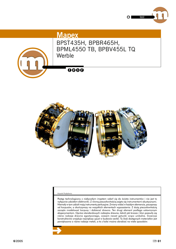test Mapex p BPST435H, BPBR465H, BPML4550 TB, BPBV455L TQ Werble t e s t Krzysztof Przybyłowicz Postęp technologiczny z niebywałym impetem wdarł się do świata instrumentów i nie jest to wyłącznie udziałem elektroniki. Z równą pieczołowitością zajęto się instrumentami akustycznymi. Niemały w tym udział mają instrumenty perkusyjne. Zmiany widać w każdym elemencie, począwszy od korpusów, a skończywszy na wszystkich elementach wyposażenia. Z dużą pieczołowitością zaczęto modelować korpusy i dobierać drewno. Ten drugi element podlega ustawicznym eksperymentom. Oprócz standardowych rodzajów drewna, takich jak brzoza i klon pojawiły się różne rodzaje drewna egzotycznego, czasem nawet gatunki wręcz unikalne. Inwencja konstruktorów znajduje największy upust w budowie werbli. Tu ilość dostępnych materiałów jest powiększona o różne rodzaje metali, a te z kolei można obrabiać na wiele sposobów. 6/2005 61 test Doskonałym przykładem takiej aktywności producentów są przysłane do testu cztery werble firmy Mapex z rodziny Black Panther. Są to werble pochodzące z różnych serii: dwa z serii Hammered (Hammered Steel – 14” × 3.5” z katalogowym oznaczeniem BPST435H, oraz Hammered Brass – 14” × 6.5” – w katalogu BPBR465H), jeden z serii Premium – 14” × 5,5” oznaczony BPML4550 TB i jeden z serii Deep Forest – 14” × 5.5” skatalogowany pod numerem BPBV455L TQ. Wszystkie werble mają po dziesięć śrub naciągu membran z małymi, owalnymi gniazdami, rozmieszczonymi osobno dla każdej śruby. Jedynie najpłytszy werbel ma gniazda wspólne. Obręcze są odlewane, mają grubość 3 mm. Każda śruba ma podkładkę z tworzywa sztucznego. Zespół elementów naciągu ma różne zabarwienia, które przypomnę opisując każdy z werbli osobno. Na wszystkich werblach są te same membrany: na górze REMO Weatherking Coated Ambassador z dodatkowym logo Black Panther, na dole tej 62 samej firmy, Ambassador Snare z wizerunkiem czarnej pantery. Mechanizm napinania sprężyn ma dwie śruby regulujące napięcie w głównym mechanizmie napinacza i po przeciwnej stronie. Łącznik sprężyn z mechanizmem jest paskiem tworzywa sztucznego. Dźwignie pracują ciężko, lecz pozwalają na bezszelestne włączenie i wyłączenie sprężyn. Powyższy opis nie dotyczy płaskiego werbla, w którym mechanizm jest znacznie mniejszy, o prostej konstrukcji. Dźwignia wyłącznika jest mała, z niewielkim skokiem, co przy energicznym ruchu trochę hałasuje. Właściwie słychać tylko napinanie sprężyn. Wyłączanie jest ciche. Do regulacji siły napięcia służy jedna śruba, umieszczona standardowo w mechanizmie napinacza. To wszystko, co może łączyć wszystkie werble, więc czas na pojedyncze prezentacje. 6/2005 test BPST435H Hammered Steel (14” × 3.5”) Korpus werbla wykonany jest z nierdzewnej stali, grubości 1 mm. Powierzchnia korpusu jest kuta, czego skutek widoczny jest w postaci głębokich wgnieceń wielkości odcisku kciuka. Wgłębienia są nieregularne, rozmieszczone obok siebie. Efektem tego procesu jest załamanie regularnych odbić fali rezonansowej, a tym samym mamy mniej dudnień i krótsze wybrzmienie. Poprawia się też zbiór alikwotów, czyli samo brzmienie. Werbel brzmi jasno i dźwięcznie. Ma mocne i soczyste brzmienie, co biorąc pod uwagę jego wielkość, jest cechą zasługującą na uznanie. Znajdziemy w nim dużo ciepłych, zmiękczających barwę alikwotów. Nie odbija się to na charakterze brzmienia, jakiego spodziewamy się uzyskać z tak płytkiego werbla. Jego brzmienie pozostaje dobitne i wyraziste, bez nieprzyjemnego kłucia w uszy. Werbel ma szybki i krótki rezonans, a dzięki sprawnym i natychmiast odpowiadającym sprężynom jest czytelny i klarowny. Pod mocnymi uderzeniami nie powstaje efekt zatykania się dźwięku. Werbel stroi się łatwo, ale mogą pojawić się kłopoty podczas dostrajania. Podczas sprawdzania wysokości dźwięku przy śrubach, pojawia się czasem lekko głuche brzmienie, sugerujące niższy dźwięk. Takie rzeczy zdarzają się w pracy z odlewanymi obręczami. Całe oprzyrządowanie werbla (obręcze, śruby, gniazda, napinacze sprężyn) są chromowane. BPBR465H Hammered Brass (14” × 6.5”) Korpus tego werbla ma trochę grubszą ściankę – 1.2 mm, wykonaną z brązu. Sposób wykonania korpusu jest identyczny z poprzednim. Brzmieniem jednak różni się znacznie. Ma dużo więcej niskich alikwotów, znacznie bogatsze brzmienie, bardziej mięsiste i mocne. Brzmienie odzwierciedla wielkość i masę werbla. Jednocześnie nie odczuwa się znacznego wpływu metalowego korpusu na barwę dźwięku. Mało w nim typowego, dzwoniącego zabarwienia, co wcale nie oznacza braku wysokich częstotliwości. Wer- REKLAMA 6/2005 63 test bel brzmi czysto i klarownie w szerokim zakresie stroju. Ma bardzo dobry atak, związany ze znakomitymi sprężynami. Pomimo dużej wielkości werbel jest szybki, czytelny, sprawny w drobnym i gęstym graniu. Ten sam model werbla pojawił się już w teście wraz zestawem Saturn Pro w kwietniu 2003 r. Testując obecny werbel wracałem myślami do tamtego egzemplarza. Wciąż miałem wrażenie, że poprzedni był trochę inny. Nie rozwijając dalej dramaturgii nudnych wywodów przyznam, że znalazłem różnicę jak i jej przyczynę. Poprzedni werbel miał krótsze wybrzmienie, a z obecnym trzeba pracować z minimalnym tłumieniem. Powodem tego stanu jest membrana. Niby to samo – REMO, a po zmianie membrany na nową, długie wybrzmienie przestało dręczyć. Werbel ma duże moż- 64 liwości zmiany stroju. Brzmi bardzo dobrze w szerokim zakresie wysokości. Strojenie nie nastręcza kłopotów. Wykończenie elementów wyposażenia tego werbla kłuje w oczy bogactwem. Wszystkie elementy – obręcze, śruby, gniazda, napinacze sprężyn, a nawet same sprężyny świecą złotem. Z informacji, jakie znalazłem w katalogach wynika, że obręcze pokryte