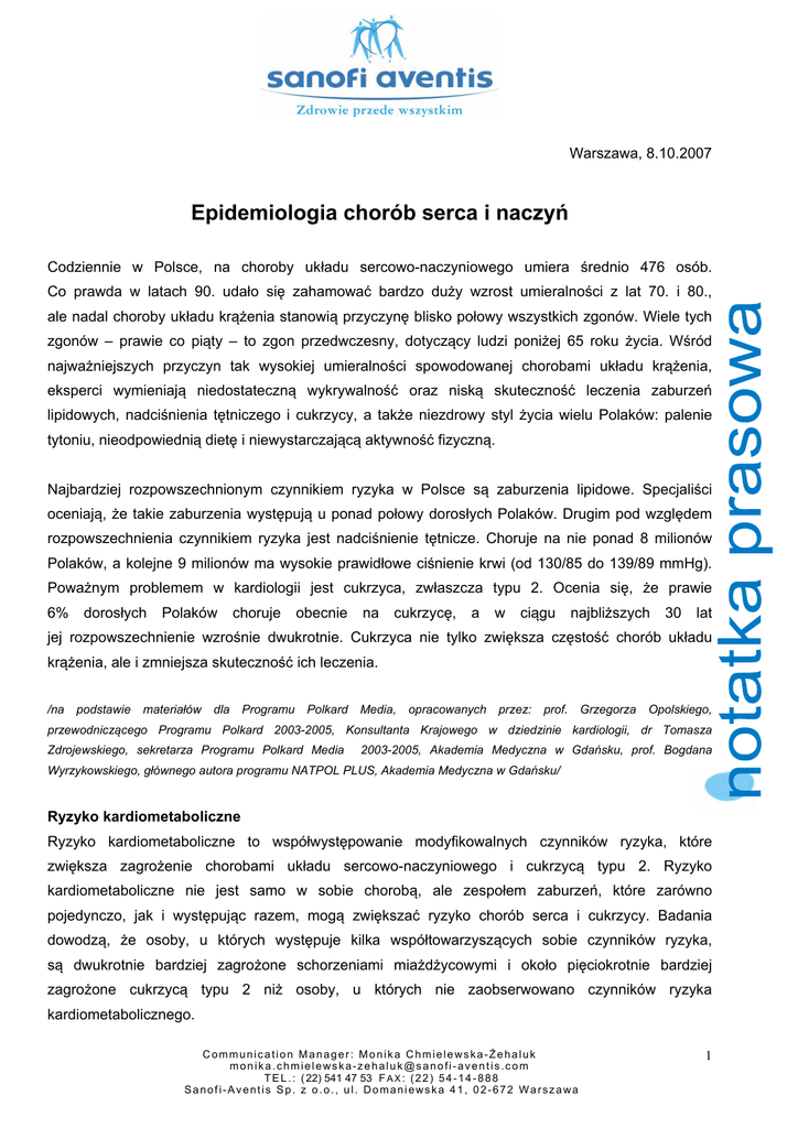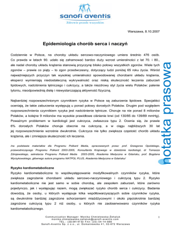 Warszawa, 8.10.2007 Epidemiologia chorób serca i naczyń Codziennie w Polsce, na choroby układu sercowo-naczyniowego umiera średnio 476 osób. Co prawda w latach 90. udało się zahamować bardzo duży wzrost umieralności z lat 70. i 80., ale nadal choroby układu krążenia stanowią przyczynę blisko połowy wszystkich zgonów. Wiele tych zgonów – prawie co piąty – to zgon przedwczesny, dotyczący ludzi poniżej 65 roku życia. Wśród najważniejszych przyczyn tak wysokiej umieralności spowodowanej chorobami układu krążenia, eksperci wymieniają niedostateczną wykrywalność oraz niską skuteczność leczenia zaburzeń lipidowych, nadciśnienia tętniczego i cukrzycy, a także niezdrowy styl życia wielu Polaków: palenie tytoniu, nieodpowiednią dietę i niewystarczającą aktywność fizyczną. Najbardziej rozpowszechnionym czynnikiem ryzyka w Polsce są zaburzenia lipidowe. Specjaliści oceniają, że takie zaburzenia występują u ponad połowy dorosłych Polaków. Drugim pod względem rozpowszechnienia czynnikiem ryzyka jest nadciśnienie tętnicze. Choruje na nie ponad 8 milionów Polaków, a kolejne 9 milionów ma wysokie prawidłowe ciśnienie krwi (od 130/85 do 139/89 mmHg). Poważnym problemem w kardiologii jest cukrzyca, zwłaszcza typu 2. Ocenia się, że prawie 6% dorosłych Polaków choruje obecnie na cukrzycę, a w ciągu najbliższych 30 lat jej rozpowszechnienie wzrośnie dwukrotnie. Cukrzyca nie tylko zwiększa częstość chorób układu krążenia, ale i zmniejsza skuteczność ich leczenia. /na podstawie materiałów dla Programu Polkard Media, opracowanych przez: prof. Grzegorza Opolskiego, przewodniczącego Programu Polkard 2003-2005, Konsultanta Krajowego w dziedzinie kardiologii, dr Tomasza Zdrojewskiego, sekretarza Programu Polkard Media 2003-2005, Akademia Medyczna w Gdańsku, prof. Bogdana Wyrzykowskiego, głównego autora programu NATPOL PLUS, Akademia Medyczna w Gdańsku/ Ryzyko kardiometaboliczne Ryzyko kardiometaboliczne to współwystępowanie modyfikowalnych czynników ryzyka, które zwiększa zagrożenie chorobami układu sercowo-naczyniowego i cukrzycą typu 2. Ryzyko kardiometaboliczne nie jest samo w sobie chorobą, ale zespołem zaburzeń, które zarówno pojedynczo, jak i występując razem, mogą zwiększać ryzyko chorób serca i cukrzycy. Badania dowodzą, że osoby, u których występuje kilka współtowarzyszących sobie czynników ryzyka, są dwukrotnie bardziej zagrożone schorzeniami miażdżycowymi i około pięciokrotnie bardziej zagrożone cukrzycą typu 2 niż osoby, u których nie zaobserwowano czynników ryzyka kardiometabolicznego. Communication Manager: Monika Chmielewska-Żehaluk [email protected] T E L . : ( 22) 541 47 53 F A X : ( 2 2 ) 5 4 - 1 4 - 8 8 8 Sanofi-Aventis Sp. z o.o., ul. Domaniewska 41, 02-672 Warszawa 1 Czynniki ryzyka kardiometabolicznego W ostatnich latach współwystępowanie czynników ryzyka kardiometabolicznego zaczęło skupiać szczególną uwagę lekarzy, gdyż zaobserwowano regułę, że jednym czynnikom ryzyka towarzyszą zazwyczaj inne. Dominującym czynnikiem jest otyłość brzuszna (łatwa do zdiagnozowania poprzez pomiar obwodu pasa). Otyłością brzuszną określa się zarówno podskórną tkankę tłuszczową, jak i otyłość wewnątrz-brzuszną (nadmiar tłuszczu trzewnego). Wewnątrz-brzuszna tkanka tłuszczowa jest aktywnym metabolicznie komponentem otyłości brzusznej i jako taka została uznana za czynnik składowy ryzyka kardiometabolicznego. Wśród czynników ryzyka kardiometabolicznego występują zarówno klasyczne czynniki ryzyka: wysoki poziom glukozy, nadciśnienie tętnicze, wysoki poziom cholesterolu LDL, jak i tzw. „nowo-zdefiniowane” czynniki ryzyka: otyłość brzuszna (trzewna), niski poziom cholesterolu HDL (dobry cholesterol), wysoki poziom triglicerydów, oporność na insulinę, stany zapalne. Otyłość brzuszna (czynnik nowo-zdefiniowany) Rozważając otyłość jako jeden z czynników ryzyka chorób układu krążenia, okazało się, że kluczową sprawą dla oceny stopnia ryzyka jest rozłożenie tłuszczu. Tradycyjnie otyłość zwykło się mierzyć za pomocą wskaźnika masy ciała (BMI), jednak ostatnie badania naukowe jasno wskazują, że otyłość brzuszna jest znacznie lepszym prognostykiem ewentualnego ataku serca niż waga ciała czy wskaźnik BMI. Otyłość trzewna, czyli nagromadzenie tkanki tłuszczowej w okolicy brzucha, jest związana z występowaniem innych czynników ryzyka kardiometabolicznego, takich jak: wysoki poziom triglicerydów i glukozy we krwi. Badania naukowe udowodniły, że tkanka tłuszczowa nie stanowi jedynie „magazynu” energetycznego organizmu, ale jest aktywnym organem endokrynnym, który wydziela do organizmu specyficzne substancje, o których wiadomo, że mają wpływ na metabolizm i układ sercowo-naczyniowy. Wydzielanie tych substancji może przyczynić się do zaistnienia innych czynników ryzyka kardiometabolicznego, takich jak wysoki poziom triglicerydów i glukozy we krwi, zwiększając indywidualne zagrożenie cukrzycą i chorobami serca. Niski poziom cholesterolu HDL (czynnik nowo-zdefiniowany) Około jednej trzeciej do jednej czwartej cholesterolu we krwi stanowi HDL (dobry cholesterol). Zdaniem ekspertów wysoki poziom cholesterolu HDL chroni człowieka przed atakiem serca, ponieważ HDL jest odpowiedzialny za przetransportowywanie cholesterolu z naczyń krwionośnych z powrotem do wątroby, gdzie następuje jego inaktywacja. Inni specjaliści uważają, że HDL usuwa nadmiar cholesterolu z płytek miażdżycowych w naczyniach krwionośnych, co spowalnia narastanie płytki. Palenie tytoniu, otyłość, prowadzenie siedzącego trybu życia - wszystkie te czynniki mogą wpływać na niski poziom cholesterolu HDL. Wysoki poziom triglicerydów (czynnik nowo-zdefiniowany) Communication Manager: Monika Chmielewska-Żehaluk [email protected] T E L . : ( 22) 541 47 53 F A X : ( 2 2 ) 5 4 - 1 4 - 8 8 8 S