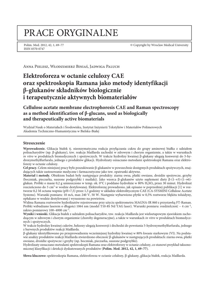 prace oryginalne Polim. Med. 2012, 42, 1, 69–77 ISSN 0370-0747 © Copyright by Wroclaw Medical University Anna Pielesz, Włodzimierz Biniaś, Jadwiga Paluch Elektroforeza w octanie celulozy CAE oraz spektroskopia Ramana jako metody identyfikacji β-glukanów składników biologicznie i terapeutycznie aktywnych biomateriałów Cellulose acetate membrane electrophoresis CAE and Raman spectroscopy as a method identification of β-glucans, used as biologically and therapeutically active biomaterials Wydział Nauk o Materiałach i Środowisku, Instytut Inżynierii Tekstyliów i Materiałów Polimerowych Akademia Techniczno-Humanistyczna w Bielsku-Białej Streszczenie Wprowadzenie. Glikacja białek tj. nieenzymatyczna reakcja przyłączania cukru do grupy aminowej białka z udziałem polisacharydów (np. β-glukany), tzw. reakcja Maillarda zachodzi w zdrowym i chorym organizmie, a także w warunkach in vitro w produktach biomedycznych i spożywczych. W trakcie hydrolizy kwaśnej β-glukany ulegają konwersji do 5-hydroxymethylfurfuralu, jednego z produktów glikacji. Hydrolizaty oznaczano metodami spektroskopii Ramana oraz elektroforezy w octanie celulozy. Cel pracy. Celem niniejszej pracy było poszukiwanie β-glukanów w powszechnie dostępnych produktach spożywczych, znajdujących także zastosowanie medyczne i farmaceutyczne jako tzw. opatrunki aktywne. Materiał i metody. Obiektem badań były następujące produkty: ziarna owsa, płatki owsiane, drożdże spożywcze, grzyby (boczniak, pieczarka, suszone podgrzybki i maślaki). Jako wzorca β-glukanów użyto suplement diety β-(1→3)-(1→6)glukan. Próbki o masie 0,2 g umieszczono w temp. ok. 0°C i poddano hydrolizie w 80% H2SO4 przez 30 minut. Hydrolizat rozcieńczono do 5 cm3 w wodzie destylowanej. Elektroforezę prowadzono, jak opisano w poprzedniej publikacji [1] w roztworze 0,2 M octanu wapnia (pH=7,5) przez 1,5 godziny w układzie elektrolitycznym CAE (CA-SYSMINI Cellulose Acetate Systems). Warunki pomiaru: 10 mA, max 240 V, 50 W. Następnie wybarwiono płytki w 0,5% roztworze błękitu toluidyny, opłukano w wodzie destylowanej i wysuszono na powietrzu. Widma Ramana roztworów hydrolizatów rejestrowano przy użyciu spektrometru MAGNA-IR 860 z przystawką FT-Raman. Próbki wzbudzano laserem o długości 1064 nm (model T10-8S Nd YAG laser). Warunki pomiaru: rozdzielczość – 4 cm–1, zakres pomiarowy 100–4000 cm–1. Wyniki i wnioski. Glikacja białek z udziałem polisacharydów, tzw. reakcja Maillarda jest wieloetapowym zjawiskiem zachodzącym w zdrowym i chorym organizmie (choroby degeneracyjne), a także w warunkach in vitro w produktach biomedycznych i spożywczych. W trakcie hydrolizy kwaśnej cukrów, heksozy ulegają konwersji i dochodzi do powstania 5-hydroxymethylfurfuralu, jednego z barwnych produktów reakcji Maillarda. β-glukany identyfikowano po przeprowadzeniu wcześniejszej hydrolizy kwaśnej w 80% kwasie siarkowym (VI). Na podstawie analizy produktów reakcji Maillarda stwierdzono obecność β-glukanów w następujących produktach: ziarna owsa, płatki owsiane, drożdże spożywcze i grzyby (np. boczniak, pieczarka, suszone podgrzybki). Hydrolizaty oznaczano metodami spektroskopii Ramana oraz elektroforezy w octanie celulozy, co stanowi przykład taksonomicznej klasyfikacji i detekcji dyskutowanych produktów (Polim. Med. 2012, 42, 1, 69–77). Słowa kluczowe: spektroskopia Ramana, elektroforeza w octanie celulozy, β-glukany, glikacja białek, reakcja Maillarda. 70 A. Pielesz i inni Summary Background. The formation of AGEs progressively increases with normal aging, even in the absence of disease (the pathogenesis of diabetes associated vascular disorders and neurodegenerative diseases, including Alzheimer’s disease, Parkinson’s disease). However, they are formed at accelerated rates in age-related diseases. The polysaccharides might play a role in wound healing, both internally and externally, and also that they could play a role against inflammation and may lead to the production of better medicines to be used as supplements in cancer treatment. Objectives. The acid hydrolysis was studied with H2SO4 at 80% concentration to determine the most effective procedure for total hydrolysis of β-glucan. The standard of β-glucans acid hydrolysate were compared for commercial oat and oatmeal, mushrooms: Pleurotus ostreatus, Fungus and yeast Saccharomyces cerevisiae. Material and Methods. The following materials and reagents were used in the examination: reference β-(1→3)-(1→6)glucan, oat and oatmeal, mushrooms: Pleurotus ostreatus, Fungus and yeast Saccharomyces cerevisiae. The Raman spectra of the sample solutions (β-glucan acid hydrolysates) were recorded on a MAGNA-IR 860 with FT-Raman accessory. Sample was irradiated with a 1064 nm line of the T10-8S Nd spectra-physics model: YAG laser and scattered radiation were collected at 180°, using 4 cm-1 resolution. The polysaccharide was hydrolyzed into component monosaccharides with 80% H2SO4 at 0°C for 30 minutes and monosaccharide derivatives were subjected to electrophoresis, as in a ealier authors study, on a strip of cellulose acetate membrane (CA-SYS-MINI Cellulose Acetate Systems) in 0.2 M Ca(OAc)2 (pH 7.5) at 10 mA, max. 240 V for 1.5 h. The strips were stained with 0.5% toluidine blue in 3% HOAc solution and then rinsed in distilled water and air-dried [1]. Results and conclusions. A part of the hexoses (for example glucose) are converted, to products such as 5-hydroxymethylfurfural. Various coloured substances, through the Maillard reaction have been reported for saccharides. The resulting monoand oligosaccharides were analysed by cellulose acetate membrane electrophoresis CAE and Raman spectroscopy. Individual bands or CAE spots were selected to monitor the sugar content in medical plant cell walls and to confirm the identity of the analysed sample: oat and oatmeal, mushrooms: Pleurotus ostreatus, Fungus and yeast Saccharomyces cerevisia