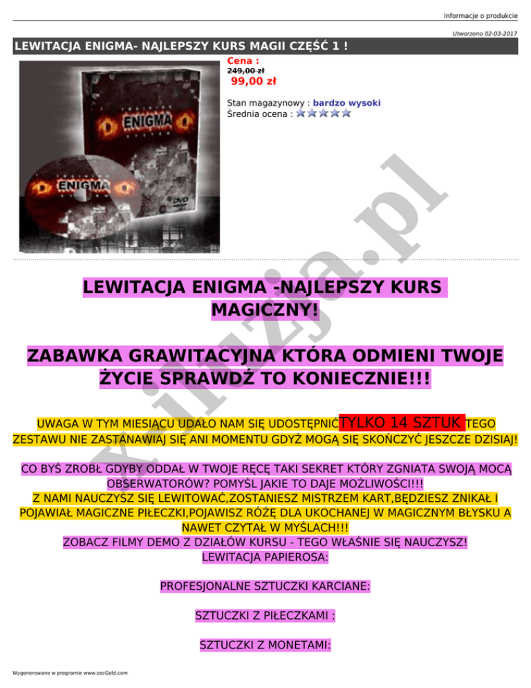 Informacje o produkcie Utworzono 02-03-2017 LEWITACJA ENIGMA- NAJLEPSZY KURS MAGII CZĘŚĆ 1 ! Cena : 249,00 zł 99,00 zł zj a .p l Stan magazynowy : bardzo wysoki Średnia ocena : LEWITACJA ENIGMA -NAJLEPSZY KURS MAGICZNY! ilu ZABAWKA GRAWITACYJNA KTÓRA ODMIENI TWOJE ŻYCIE SPRAWDŹ TO KONIECZNIE!!! x- UWAGA W TYM MIESIĄCU UDAŁO NAM SIĘ UDOSTĘPNIĆTYLKO 14 SZTUK TEGO ZESTAWU NIE ZASTANAWIAJ SIĘ ANI MOMENTU GDYŻ MOGĄ SIĘ SKOŃCZYĆ JESZCZE DZISIAJ! CO BYŚ ZROBŁ GDYBY ODDAŁ W TWOJE RĘCĘ TAKI SEKRET KTÓRY ZGNIATA SWOJĄ MOCĄ OBSERWATORÓW? POMYŚL JAKIE TO DAJE MOŻLIWOŚCI!!! Z NAMI NAUCZYSZ SIĘ LEWITOWAĆ,ZOSTANIESZ MISTRZEM KART,BĘDZIESZ ZNIKAŁ I POJAWIAŁ MAGICZNE PIŁECZKI,POJAWISZ RÓŻĘ DLA UKOCHANEJ W MAGICZNYM BŁYSKU A NAWET CZYTAŁ W MYŚLACH!!! ZOBACZ FILMY DEMO Z DZIAŁÓW KURSU - TEGO WŁAŚNIE SIĘ NAUCZYSZ! LEWITACJA PAPIEROSA: PROFESJONALNE SZTUCZKI KARCIANE: SZTUCZKI Z PIŁECZKAMI : SZTUCZKI Z MONETAMI: Wygenerowano w programie www.oscGold.com ODGADYWANIE MYŚLI WIDZA MENTALISM: SZTUCZKA Z ASAMI: KAPSEL DO SZKLANEJ BUTELKI: WYGINANIE ŁYŻKI WZROKIEM: TELEKINEZA: .p l BONUSOWE EFEKTY... PRAWDA, ŻE TO NIESAMOWITE! ZANIM ZAMÓWISZ I KURIER PRZYNIESIE PACZKĘ DO TWOJEGO DOMU POMYŚL JAKIE TO NIESIE MOŻLIWOŚCI! Uwaga cena do końca tygodnia nie 249 zł TYLKO TERAZ zj a 99zł x- ilu OTO CO DOSTAJESZ KUPUJĄC ZESTAW ENIGMA: KURS DVD SECRET REKWIZYT DO LEWITACJI Nauczysz się: ● ● ● ● ● ● ● ● Znikać i pojawiac monety LEWITOWAĆ! Rozdawać sobie same ASY lub dowolne karty w grze w pokera! Kontrolować karty Znikać i pojawiać piłeczki Przemieszczać w niewidzialny sposób monety! Zmieniać jedne karty w inne! Wykonywać wspaniałe sztuczki z pożyczonymi kartami! Bez wątpienia jest to najbardziej polecany zestaw do nauki w j.polskim na rynku! Informacje o produkcie x- ilu zj a .p l KONIECZNIE ZOBACZ TEŻ INNE CZĘŚCI KURSU ENIGMA: >>>TUTAJ<<<< Wygenerowano w programie www.oscGold.com