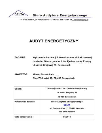 DELTA Biuro Audytora Energetycznego 75–411 Koszalin, ul. Partyzantów 17, tel./fax: 094 342 54 64 [email protected] AUDYT ENERGETYCZNY ZADANIE: Wykonanie instalacji fotowoltaicznej zlokalizowanej na dachu Gimnazjum Nr 1 im. Zjednoczonej Europy ul. Armii Krajowej 29, Szczecinek INWESTOR: Miasto Szczecinek Plac Wolności 13, 78-400 Szczecinek Obiekt: Gimnazjum Nr 1 im. Zjednoczonej Europy ul. Armii Krajowej 29 78-400 Szczecinek Wykonawca audytu : Biuro Audytora Energetycznego DELTA ul. Partyzantów 17, 75-411 Koszalin inŜ. Ewa Horków Data opracowania : 08/2014 Audyt energetyczny : Wykonanie instalacji fotowoltaicznej zlokalizowanej na dachu budynku Gimnazjum Nr 1 1 przy ul. Armii Krajowej 29 w Szczecinku 1. STRONA TYTUŁOWA AUDYTU ENERGETYCZNEGO LOKALNEGO ŹRÓDŁA ENERGII ELEKTRYCZNEJ. 1. DANE IDENTYFIKACYJNE 1.1.Nazwa źródła energii elektrycznej Instalacja fotowoltaiczna do przetwarzania energii promieniowania słonecznego w energię elektryczną 1.2. Rok rozpoczęcia budowy 1.3. Właściciel 1.4. Adres Miasto Szczecinek lub zarządca budynku Plac Wolności 13 (nazwa lub imię i 78-400 Szczecinek nazwisko, adres) 2. Nazwa nr Regon i adres firmy wykonującej audyt : 2014/ 2015r. Gimnazjum Nr 1 im. Zjednoczonej Europy ul. Armii Krajowej 29 78-400 Szczecinek Biuro Audytora Energetycznego DELTA Regon: 330901199 75-411 Koszalin, ul. Partyzantów 17 3. Imię i nazwisko, nr PESEL oraz adres audytora koordynującego wykonanie audytu, posiadane kwalifikacje: inŜ. Ewa Horków, Pesel: 58072804785 75-411 Koszalin, ul. Partyzantów 17 4. Współautorzy audytu : imiona, nazwiska, zakresy prac, posiadane kwalifikacje : Zakres udziału w opracowaniu audytu energetycznego 1. 5. Miejscowość : Koszalin , data wykonania opracowania : sierpień 2014 r. Lp. Imię i nazwisko Posiadane kwalifikacje (w tym ew. uprawnienia) - 6. Spis treści : 1. Strony tytułowe str. 1 2. Karta audytu energetycznego str. 2 3. Materiały i dane do audytu str. 3 4. Analiza rynku energii str. 4 5. Zasada działania paneli fotowoltaicznych str. 5 6. Właściwości paneli fotowoltaicznych str. 6 7. Optymalizacja rozwiązań technologicznych str. 7 8. Planowany zakres robót str. 8 9. Zestawienie kosztów modernizacji str. 9 10. Bilans energii instalacji fotowoltaicznej str. 10 11. Określenie efektów energetycznych str. 11 12. Efekty ekonomiczne modernizacji str. 11 13. Ocena ekonomiczna modernizacji str. 12 14. Opis robót str. 12 15. Obliczenie planowanego efektu ekologicznego str. 13 Audyt energetyczny : Wykonanie instalacji fotowoltaicznej zlokalizowanej na dachu budynku Gimnazjum Nr 1 2 przy ul. Armii Krajowej 29 w Szczecinku 2. KARTA AUDYTU ENERGETYCZNEGO ODNAWIALNEGO ŹRÓDŁA ENERGII ELEKTRYCZNEJ Data wykonania: 4.08.2014r. Podstawowe informacje dotyczące przedsięwzięcia. Wykonanie instalacji fotowoltaicznej zlokalizowanej na dachu budynku Przedsięwzięcie: Gimnazjum Nr 1 im. Zjednoczonej Europy w Szczecinku Budowa kompletnej instalacji fotowoltaicznej o mocy 36,0 kW, składającej się z 144 szt. Opis przedsięwzięcia. modułów PV o wymiarach 1654x989x40 mm 2 i powierzchni całkowitej 235,6 m . Gimnazjum Nr 1 im. Zjednoczonej Europy Dane podmiotu u którego zostanie zrealizowane przedsięwzięcie: ul. Armii Krajowej 29 78-400 Szczecinek Parametry przedsięwzięcia (na podstawie audytu energetycznego) Średnioroczna oszczędność energii finalnej 32 148 kWh/rok Średnioroczna oszczędność energii pierwotnej 96 444 kWh/rok Planowane koszty całkowite 367 400 zł Efekt ekonomiczny 18 855 zł/rok 19,5 lat SPBT Dane sporządzającego audyt odnawialnego źródła energii elektrycznej: Imię i nazwisko: Ewa Horków Nr uprawnień: Upr. bud. nr ZPNB-U 73427/22/98, autoryzacja audytora KAPE nr 48 Nr telefonu: 94 342 54 64, kom. 606 924 862 Podpis: Audyt energetyczny : Wykonanie instalacji fotowoltaicznej zlokalizowanej na dachu budynku Gimnazjum Nr 1 3 przy ul. Armii Krajowej 29 w Szczecinku 3. MATERIAŁY I DANE DO AUDYTU. 1. Inwentaryzacja techniczno-technologiczna kotłowni. 2. Poza inwentaryzacją audytor korzystał z następujących źródeł danych informacji : - dokumentacja projektowa : • dokumentacja archiwalna architektoniczno-budowlana segmentów B1, B2 Gimnazjum Nr 1 • w Szczecinku, • inwentaryzacja własna na potrzeby wykonania audytu. - inne dokumenty : • dostarczone przez Inwestora informacje dot. kosztów zakupu energii elektrycznej, • faktury miesięczne Energia operator, • taryfa dla energii elektrycznej obowiązująca w II kw. 2014r. • normy i przepisy eksploatacyjne, • wytyczne projektowania instalacji fotowoltaicznych, • warunki techniczne, przepisy budowlane i normy branŜowe. 3. Osoby udzielające informacji: - Pan Marcin Wilk – Urząd Miasta Szczecinek - wizja lokalna : w miesiącu lipcu 2014r. 4. W audycie uwzględniono takŜe : - wytyczne i Ŝyczenia Inwestora : - zmniejszenie kosztów wytwarzania energii elektrycznej, - wykorzystanie odnawialnych źródeł energii do produkcji energii elektrycznej, - określenie planowanego do osiągnięcia efektu ekologicznego. Uwagi ogólne dotyczące danych do audytu : Audyt opracowano na potrzeby uzyskania dofinansowania ze środków szwajcarskiego programu współpracy z nowymi krajami członkowskimi Unii Europejskiej SWISS CONTRIBUTION Audyt energetyczny : Wykonanie instalacji fotowoltaicznej zlokalizowanej na dachu budynku Gimnazjum Nr 1 4 przy ul. Armii Krajowej 29 w Szczecinku 4. ANALIZA RYNKU ENERGII. Gimnazjum Nr 1 w Szczecinku, połoŜone jest przy ulicy Armii Krajowej 29 w Szczecinku. Zapotrzebowanie na moc elektroenergetyczną obiektu, wg umowy z dostawcą energii elektrycznej wynosi 38 kW. Planowana do wybudowania instalacja fotowoltaiczna stanowi zespół prądotwórczy, klasyfikowany jako mikroźródło, wykorzystujące energię odnawialną. Instalacja wytwarzać będzie energię elektryczną na potrzeby własne budynku. Występujący okresowo nadmiar energii, w przypadku braku chwilowego zapotrzebowania, oddawany będz