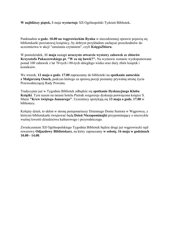 W najbliższy piątek, 8 maja wystartuje XII Ogólnopolski Tydzień Bibliotek. Punktualnie o godz. 10.00 na wągrowieckim Rynku w niecodziennej oprawie pojawią się bibliotekarki powiatowej książnicy, by dobrym przykładem zachęcać przechodniów do uczestnictwa w akcji "zarażania czytaniem", czyli KsięgoZbioru. W poniedziałek, 11 maja nastąpi uroczyste otwarcie wystawy zabawek ze zbiorów Krzysztofa Pukaczewskiego pt. "W co się bawić?". Na wystawie zostanie wyeksponowane ponad 100 zabawek z lat 70-tych i 80-tych ubiegłego wieku oraz duży zbiór książek i komiksów. We wtorek, 12 maja o godz. 17.00 zapraszamy do biblioteki na spotkanie autorskie z Małgorzatą Osuch, podczas którego za sprawą poezji poznamy prywatną stronę życia Przewodniczącej Rady Powiatu. Tradycyjnie już w Tygodniu Bibliotek odbędzie się spotkanie Dyskusyjnego Klubu Książki. Tym razem na tarasie hotelu Pietrak rozgorzeje dyskusja poświęcona książce S. Marai "Krew świętego Januarego". Uczestnicy spotykają się 13 maja o godz. 17.00 w bibliotece. Kolejny dzień, to ukłon w stronę pensjonariuszy Dziennego Domu Seniora w Wągrowcu, z którymi bibliotekarki świętować będą Dzień Niezapominajki przypominający o niezwykle ważnej kwestii dziedzictwa kulturowego i przyrodniczego. Zwieńczeniem XII Ogólnopolskiego Tygodnia Bibliotek będzie drugi już wągrowiecki rajd rowerowy Odjazdowy Bibliotekarz, na który zapraszamy w sobotę, 16 maja w godzinach 10.00 - 14.00.