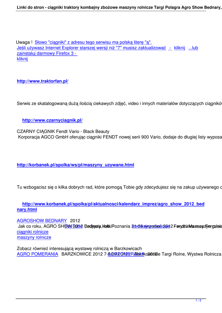 Linki do stron - ciągniki traktory kombajny zbożowe maszyny rolnicze Targi Polagra Agro Show Bednary, Uwaga ! Słowo "ciągniki" z adresu tego serwisu ma polską literę "ą". Jeśli używasz Internet Explorer starszej wersji niż "7" musisz zaktualizować - kliknij ...lub zainstaluj darmowy Firefox 3 kliknij http://www.traktorfan.pl/ Serwis ze skatalogowaną dużą ilością ciekawych zdjęć, video i innych materiałów dotyczących ciągników http://www.czarnyciagnik.pl/ CZARNY CIĄGNIK Fendt Vario - Black Beauty Korporacja AGCO GmbH oferując ciągniki FENDT nowej serii 900 Vario, dodaje do długiej listy wyposa http://korbanek.pl/spolka/ws/pl/maszyny_uzywane.html Tu wzbogacisz się o kilka dobrych rad, które pomogą Tobie gdy zdecydujesz się na zakup używanego c http://www.korbanek.pl/spolka/pl/aktualnosci/kalendarz_imprez/agro_show_2012_bed nary.html AGROSHOW BEDNARY 2012 Jak co roku, AGRO SHOW YouTube 2012 Bednary , zdjęcia,koło fotkiPoznania 21-24 kombajny wrzesień zbożowe 2012 Fendt - wystawa i Massey maszyn Ferguson rolnic ciągniki rolnicze maszyny rolnicze Zobacz również interesującą wystawę rolniczą w Barzkowicach AGRO POMERANIA BARZKOWICE 2012 7-9.09.2012 AGRPOMERANIA r. Barzkowickie 2012 Targi Rolne, Wystwa Rolnicza 1/2 Linki do stron - ciągniki traktory kombajny zbożowe maszyny rolnicze Targi Polagra Agro Show Bednary, http://www.sulky.pl/ W tym serwisie oprócz ciekawych informacji o siewnikach Sulky zobaczysz jak ciągnik CLAAS Xerion 33 W tym serwisie znajdziecie rozsiewacze również ciekawe nawozów opisy , i artykuły o maszynachsiewniki rolniczych zbożowe takich jak: , agregaty bierne brony wirnikowe 2/2