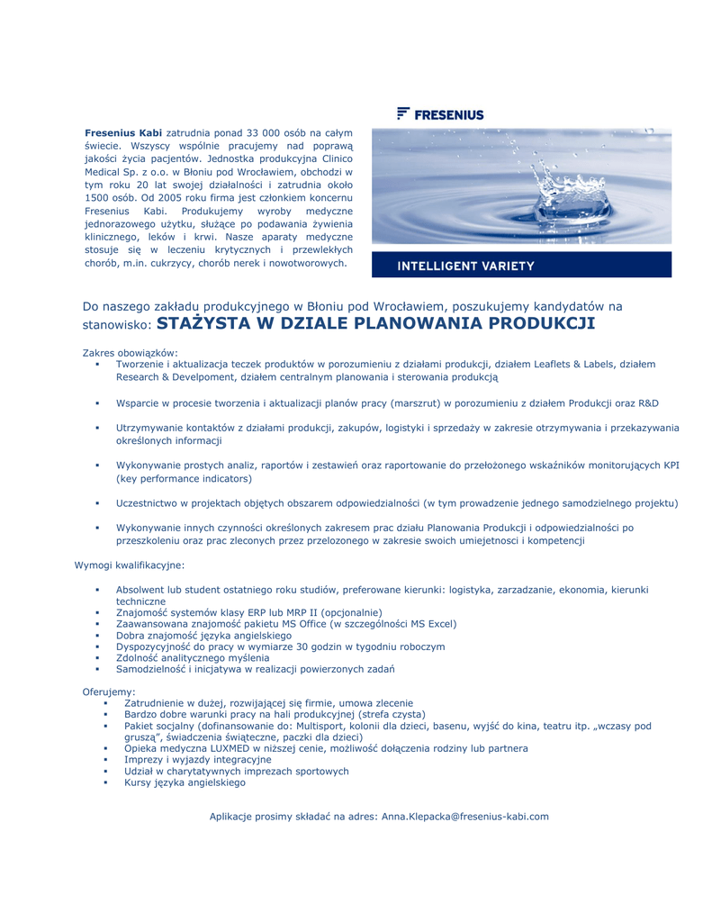 Fresenius Kabi zatrudnia ponad 33 000 osób na całym świecie. Wszyscy wspólnie pracujemy nad poprawą jakości życia pacjentów. Jednostka produkcyjna Clinico Medical Sp. z o.o. w Błoniu pod Wrocławiem, obchodzi w tym roku 20 lat swojej działalności i zatrudnia około 1500 osób. Od 2005 roku firma jest członkiem koncernu Fresenius Kabi. Produkujemy wyroby medyczne jednorazowego użytku, służące po podawania żywienia klinicznego, leków i krwi. Nasze aparaty medyczne stosuje się w leczeniu krytycznych i przewlekłych chorób, m.in. cukrzycy, chorób nerek i nowotworowych. Do naszego zakładu produkcyjnego w Błoniu pod Wrocławiem, poszukujemy kandydatów na stanowisko: STAŻYSTA W DZIALE PLANOWANIA PRODUKCJI Zakres obowiązków: Tworzenie i aktualizacja teczek produktów w porozumieniu z działami produkcji, działem Leaflets & Labels, działem Research & Develpoment, działem centralnym planowania i sterowania produkcją Wsparcie w procesie tworzenia i aktualizacji planów pracy (marszrut) w porozumieniu z działem Produkcji oraz R&D Utrzymywanie kontaktów z działami produkcji, zakupów, logistyki i sprzedaży w zakresie otrzymywania i przekazywania określonych informacji Wykonywanie prostych analiz, raportów i zestawień oraz raportowanie do przełożonego wskaźników monitorujących KPI (key performance indicators) Uczestnictwo w projektach objętych obszarem odpowiedzialności (w tym prowadzenie jednego samodzielnego projektu) Wykonywanie innych czynności określonych zakresem prac działu Planowania Produkcji i odpowiedzialności po przeszkoleniu oraz prac zleconych przez przelozonego w zakresie swoich umiejetnosci i kompetencji Wymogi kwalifikacyjne: Absolwent lub student ostatniego roku studiów, preferowane kierunki: logistyka, zarzadzanie, ekonomia, kierunki techniczne Znajomość systemów klasy ERP lub MRP II (opcjonalnie) Zaawansowana znajomość pakietu MS Office (w szczególności MS Excel) Dobra znajomość języka angielskiego Dyspozycyjność do pracy w wymiarze 30 godzin w tygodniu roboczym Zdolność analitycznego myślenia Samodzielność i inicjatywa w realizacji powierzonych zadań Oferujemy: Zatrudnienie w dużej, rozwijającej się firmie, umowa zlecenie Bardzo dobre warunki pracy na hali produkcyjnej (strefa czysta) Pakiet socjalny (dofinansowanie do: Multisport, kolonii dla dzieci, basenu, wyjść do kina, teatru itp. „wczasy pod gruszą”, świadczenia świąteczne, paczki dla dzieci) Opieka medyczna LUXMED w niższej cenie, możliwość dołączenia rodziny lub partnera Imprezy i wyjazdy integracyjne Udział w charytatywnych imprezach sportowych Kursy języka angielskiego Aplikacje prosimy składać na adres: [email protected]