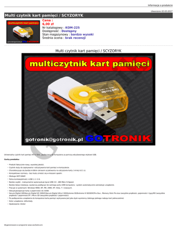 Informacje o produkcie Utworzono 02-03-2017 Multi czytnik kart pamięci / SCYZORYK Cena : 6,00 zł Nr katalogowy : KOM-225 Dostępność : Dostępny Stan magazynowy : bardzo wysoki Średnia ocena : brak recenzji G ot r on ik Multi czytnik kart pamięci / SCYZORYK Uniwersalny czytnik kart pamięci All in One , podłączany do komputera za pomocą wbudowanego wtykowi USB. Cechy produktu: ❍ Produkt fabrycznie nowy, wysokiej jakości. ❍ Czytnik służy do zapisywania i odczytywania kart pamięci w komputerze. ❍ Charakteryzuje się bardzo krótkim okresem oczekiwania na odczytanie karty ( mniej niż 1 s). ❍ Kompaktowe rozmiary - bez trudu zmieści się w kieszeni spodni. ❍ Obsługa HOT-SWAP. ❍ Pełna kombatybilność z USB 1.1 i 2.0. ❍ Bardzo szybki - maksymalnie wykorzystuje łącze USB 2.0 - 480 Mb/s Hi-Speed. ❍ Bardzo łatwa instalacja, wystarczy podłączyć do wolnego portu USB komputera - system automatycznie zainstaluje urządzenie. ❍ Pracuje w systemach: Windows 98SE, NT, ME, 2000, XP, Vista, 7 i nowszych. ❍ Odczytuje/zapisuje karty o pojemności do 32GB: Secure Digital (SD)Secure Digital HC (SDHC)Secure Digital Ultra II SD/Extreme SD/Extreme III SD/SDXCPro Duo , Memory Stick Pro duo (wszytkie prędkości, pojemności i typy)M2 (wszystkie prędkości i pojemności)TF / Micro SD (wszystkie prędkości i pojemności) ❍ Po podłączenieu urządzenia do komputera karta pamięci wykrywana jest jako dysk wymienny (obsługa jednego rodzaju kart jednocześnie) ❍ Kolor urządzenia: żółto-biały ❍ Opakowanie: blister ❍ Wygenerowano w programie www.oscGold.com on ik G ot r Zdjęcia: G ot r on ik Informacje o produkcie Wygenerowano w programie www.oscGold.com on ik ot r G G ot r on ik Informacje o produkcie Wygenerowano w programie www.oscGold.com