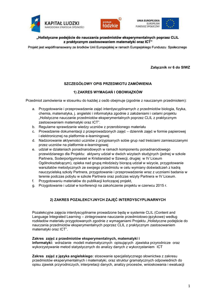 Załącznik nr 6 do SIWZ SZCZEGÓŁOWY OPIS PRZEDMIOTU ZAMÓWIENIA 1) ZAKRES WYMAGAŃ I OBOWIĄZKÓW Przedmiot zamówienia w stosunku do każdej z osób obejmuje (zgodnie z nauczanym przedmiotem): a. Przygotowanie i przeprowadzenie zajęć interdyscyplinarnych z przedmiotów biologia, fizyka, chemia, matematyka, j. angielski i informatyka zgodnie z założeniami i celami projektu „Holistyczne nauczanie przedmiotów eksperymentalnych poprzez CLIL z praktycznym zastosowaniem matematyki oraz ICT”. b. Regularne sprawdzanie wiedzy uczniów z przerobionego materiału c. Prowadzenie dokumentacji z przeprowadzonych zajęć – dziennik zajęć w formie papierowej i elektronicznej na platformie e-learningowej d. Nadzorowanie aktywności uczniów z przypisanych sobie grup nad treściami zamieszczanymi przez uczniów na platformie e-learningowej e. udział w działaniach ponadnarodowych w ramach komponentu ponadnarodowego przewidzianego dla Projektu: aktywny udział w dwóch wizytach studyjnych (jednej w szkole Partnera, Soderportgymnasiet w Kristianstad w Szwecji, drugiej w IV Liceum Ogólnokształcącym), opieka nad grupą młodzieży biorącą udział w wizycie, przygotowanie warsztatów metodycznych ze swojego przedmiotu w celu wymiany doświadczeń z kadrą nauczycielską szkoły Partnera, przygotowanie i przeprowadzenie wraz z uczniami badania w terenie podczas pobytu w szkole Partnera oraz podczas wizyty Partnera w IV Liceum. f. Przygotowaniu materiałów do publikacji kończącej projekt, g. Przygotowanie i udział w konferencji na zakończenie projektu w czerwcu 2015 r. 2) ZAKRES POZALEKCYJNYCH ZAJĘĆ INTERDYSCYPLINARNYCH Pozalekcyjne zajęcia interdyscyplinarne prowadzone będą w systemie CLIL (Content and Language Integrated Learning – zintegrowane nauczanie przedmiotowo-językowe) według rozkładów materiału przygotowanych zgodnie z wymaganiami Projektu „Holistyczne podejście do nauczania przedmiotów eksperymentalnych poprzez CLIL z praktycznym zastosowaniem matematyki oraz ICT”. Zakres zajęć z przedmiotów eksperymentalnych, matematyki i informatyki: wdrażanie modeli matematycznych opisujących zjawiska przyrodnicze oraz wykorzystywanie metod statystycznych do analizy danych z wykorzystaniem ICT Zakres zajęć z języka angielskiego: stosowanie specjalistycznego słownictwa z zakresu przedmiotów eksperymentalnych i matematyki, oraz struktur gramatycznych odpowiednich do opisu zjawisk przyrodniczych, interpretacji danych, analizy procesów, wnioskowania i ewaluacji 1 Tematyka: 1. 2. 3. 4. 5. 6. 7. 8. 9. 10. Świat w skali mikro i makro. Bioróżnorodność Ochrona środowiska Energia Woda Sport i rekreacja Medycyna Wzrost i spadek Współczesne technologie Cykl, rytm, czas. Materiał będzie ralizowany w języku angielskim BIOLOGIA 1. Biologia komórki 1.1. Budowa komórkowa organizmów żywych 1.2. Rozmiary komórek i struktur komórkowych 1.3. Obliczanie rzeczywistej wielkości komórek I tkanek w oparciu o wielkość rysunki I powiększenie mikroskopu 1.4. Stosunek wielkości do objętości 1.5. Rodzaje transportu przez błonę komórkową 1.6. Podział komórki 2. Biochemia życia 2.1 Budowa związków organicznych 2.2 Woda: budowa, własności 2.3 Enzymy: reakcje enzymatyczne, wpływ czynników wpływających na tempo reakcji enzymatycznych 2.4Genetyka molekularna: budowa kwasów nukleinowych, wykrywanie DNA, elektroforeza 2.5Fotosynteza I chemiosynteza 2.6Oddychanie tlenowe I fermentacja 3. Ekologia 3.1 Bioróżnorodność i jej ochrona: metody szacowania I porównywania bioróżnorodności formy ochrony przyrody 3.2 Ekologia populacyjna: krzywe wzrostu populacji, struktury wiekowo-płciowe, cycle rozwojowe wybranych gatunków skorupiaków 3.3 Metody szacowania wielkości populacji 3.4 Metody poboru prób w zależnosci od typów organizmów: współczynnik Lincolna, metoda transektów, metoda kwadratów 3.5 Statystyczne metody przetwarzania danych: obliczanie średniej i odchylenia standartowego, t-test, X2-test, wyznaczanie współczynnika korelacji 3.6 Dostosowanie form prezentacji do różnego rodzaju danych, charkterystyka zmiennych 4. Elementy fizjologii człowieka 2 4.1 Układ pokarmowy, trawienie, reakcje enzymatyczne 4.2 Układ krwionośny: budowa, cykl pracy serca 4.3 Układ oddechowy: budowa, badanie pojemności oddechowej płuc 4.4 Wpływ środowiska na funkcjonowanie układu krążenia i układu oddechowego 4.5 Wpływa aktywności fizycznej na układ krążenia I układ oddechowy 4.5 Układ nerwowy: przewodnictwo nerwowe, badania czasu reakcji CHEMIA 1. Spektroskopowe metody identyfikacji związków organicznych 2. Energia: cykl Habera, prawo Hessa, entalpia, entropia, spontaniczność reakcji 3. Chemia medyczna: działania produktów farmaceutycznych, apiryna I penicilina, opiaty, leki antywirusowe, wpływ produktów farmaceutycznych na środowisko, medycyna nuklearna, wykrywanie obecności narkotyków, izomeria, NMR 4. Wiązania chemiczne: wiązania jonowe, kowalencyjne, siły międzycząsteczkowe 5. Elementy kinetyki chemicznej: kolizja cząsteczek, tempo reakcji 6. Elementy biochemii: białka, cukry, tłuszczce, witaminy, enzymy, barwniki fotosyntetyczne FIZYKA 1. Wektory w przyrodzie. Działania na wektorach. Składanie i rozkładanie. 2. Prędkości średnie i prędkości chwilowe w makro o mikroświecie. 3. Czy ruch jednostajny i jednostajnie zmienny spotykamy w naszym życiu? 4. Ruch jednostajnie zmienny. 5. Składanie ruchów. 6. Karuzela, diabelska pętla i London Eye czyli ruch po okręgu. 7. Rzut poziomy i ukośny. 8. Oddziaływania występujące w przyrodzie. 9. Sanki jadą z górki czyli rozkład sił na równi pochyłej. 10. Czy odbicie piłki od ściany ma jakiś związek z silnikiem rakietowym? 11. Skok na platformę, zderzenia kul bilardowych, zderzenia cząstek w akceleratorach. 12. Zjawisko tarcia w przyrodzie. Czy jest pożyteczne czy szkodliwe? 13. Zjawisko przeciążenia i w niedociążenia w windzie i na zakręcie. Nieważko