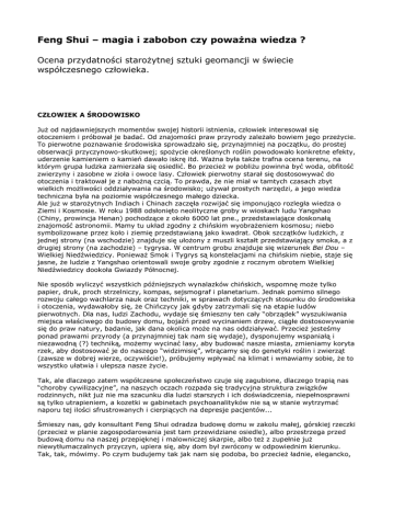 Feng Shui – magia i zabobon czy powaŜna wiedza ? Ocena przydatności staroŜytnej sztuki geomancji w świecie współczesnego człowieka. CZŁOWIEK A ŚRODOWISKO JuŜ od najdawniejszych momentów swojej historii istnienia, człowiek interesował się otoczeniem i próbował je badać. Od znajomości praw przyrody zaleŜało bowiem jego przeŜycie. To pierwotne poznawanie środowiska sprowadzało się, przynajmniej na początku, do prostej obserwacji przyczynowo-skutkowej; spoŜycie określonych roślin powodowało konkretne efekty, uderzenie kamieniem o kamień dawało iskrę itd. WaŜna była takŜe trafna ocena terenu, na którym grupa ludzka zamierzała się osiedlić. Bo przecieŜ w pobliŜu powinna być woda, obfitość zwierzyny i zasobne w zioła i owoce lasy. Człowiek pierwotny starał się dostosowywać do otoczenia i traktował je z naboŜną czcią. To prawda, Ŝe nie miał w tamtych czasach zbyt wielkich moŜliwości oddziaływania na środowisko; uŜywał prostych narzędzi, a jego wiedza techniczna była na poziomie współczesnego małego dziecka. Ale juŜ w staroŜytnych Indiach i Chinach zaczęła rozwijać się imponująco rozległa wiedza o Ziemi i Kosmosie. W roku 1988 odsłonięto neolityczne groby w wioskach ludu Yangshao (Chiny, prowincja Henan) pochodzące z około 6000 lat pne., przedstawiające doskonałą znajomość astronomii. Mamy tu układ zgodny z chińskim wyobraŜeniem kosmosu; niebo symbolizowane przez koło i ziemię przedstawianą jako kwadrat. Obok szczątków ludzkich, z jednej strony (na wschodzie) znajduje się ułoŜony z muszli kształt przedstawiający smoka, a z drugiej strony (na zachodzie) – tygrysa. W centrum grobu znajduje się wizerunek Bei Dou – Wielkiej Niedźwiedzicy. PoniewaŜ Smok i Tygrys są konstelacjami na chińskim niebie, staje się jasne, Ŝe ludzie z Yangshao orientowali swoje groby zgodnie z rocznym obrotem Wielkiej Niedźwiedzicy dookoła Gwiazdy Północnej. Nie sposób wyliczyć wszystkich późniejszych wynalazków chińskich, wspomnę moŜe tylko papier, druk, proch strzelniczy, kompas, sejsmograf i planetarium. Jednak pomimo silnego rozwoju całego wachlarza nauk oraz techniki, w sprawach dotyczących stosunku do środowiska i otoczenia, wydawałoby się, Ŝe Chińczycy jak gdyby zatrzymali się na etapie ludów pierwotnych. Dla nas, ludzi Zachodu, wydaje się śmieszny ten cały “obrządek” wyszukiwania miejsca właściwego do budowy domu, bojaźń przed wycinaniem drzew, ciągłe dostosowywanie się do praw natury, badanie, jak dana okolica moŜe na nas oddziaływać. PrzecieŜ jesteśmy ponad prawami przyrody (a przynajmniej tak nam się wydaje), dysponujemy wspaniałą i niezawodną (?) techniką, moŜemy wycinać lasy, aby budować nasze miasta, zmieniamy koryta rzek, aby dostosować je do naszego “widzimisię”, wtrącamy się do genetyki roślin i zwierząt (zawsze w dobrej wierze, oczywiście!), próbujemy wpływać na klimat i wmawiamy sobie, Ŝe to wszystko ułatwia i ulepsza nasze Ŝycie. Tak, ale dlaczego zatem współczesne społeczeństwo czuje się zagubione, dlaczego trapią nas “choroby cywilizacyjne”, na naszych oczach rozpada się tradycyjna struktura związków rodzinnych, nikt juŜ nie ma szacunku dla ludzi starszych i ich doświadczenia, niepełnosprawni są tylko utrapieniem, a kozetki w gabinetach psychoanalityków nie są w stanie wytrzymać naporu tej ilości sfrustrowanych i cierpiących na depresje pacjentów... Śmieszy nas, gdy konsultant Feng Shui odradza budowę domu w zakolu małej, górskiej rzeczki (przecieŜ w planie zagospodarowania jest tam przewidziane osiedle), albo przestrzega przed budową domu na naszej przepięknej i malowniczej skarpie, albo teŜ z zupełnie juŜ niewytłumaczalnych przyczyn, upiera się, aby dom był zwrócony w odpowiednim kierunku. Tak, tak, mówimy. Po czym budujemy tak jak nam się podoba, bo przecieŜ ładnie, elegancko, bo przecieŜ architekt wszystko cudownie zaplanował a specjalista od konstrukcji obliczył najmniejsze detale. I zdarza się, Ŝe mieszkamy sobie nawet wiele lat, w spokoju, nie nękani Ŝadnymi przysłowiowymi nieszczęściami, podśmiechując się w duchu z tego zabawnego “człowieka z kompasem”. Ale pewnego lata maleńka rzeczka staje się gigantycznym rozlewiskiem i juŜ tylko z daleka patrzymy, jak zapada się nasza wspaniale zaprojektowana willa. Pewnej jesieni równieŜ i nasza skarpa się osuwa i pęknięcia na murach zmuszają nas do pośpiesznego opuszczenia wymarzonego domu. Zdarza się, Ŝe tuŜ po wprowadzeniu się do nowego budynku (zbudowanego z najzdrowszych materiałów, a jakŜe!) zaczynamy chorować, opuszcza nas Ŝona (mąŜ), tracimy pracę. Przydarzają nam się dziwne, niewytłumaczalne zdarzenia, rujnujące nasz spokój i dotychczasowe Ŝycie. I wtedy kiełkuje w nas przez lata odtrącana myśl, Ŝe moŜe jednak...moŜna to było przewidzieć? To prawda, Ŝe “człowiek z kompasem” mówił coś o wielkiej wodzie, ale przecieŜ tu nie było powodzi od przeszło stu lat! Skarpa przed budową była dokładnie zbadana przez geologów, ale jakoś nikt nie zwrócił uwagi, Ŝe nad skarpą rósł kiedyś las zatrzymujący wodę z opadów, a teraz drzewa ktoś wyciął. A przed wprowadzeniem się do “chorego” domu byliśmy okazami zdrowia i mieliśmy bardzo dobre kontakty z rodziną, nie mówiąc juŜ o posiadanym stanowisku, które było przedmiotem zazdrości znajomych...Dlaczego sąsiadowi układa się wspaniale, choć ma dom o identycznym układzie? Czy naprawdę identycznym? A moŜe ma więcej okien na zachodniej ścianie ? A moŜe sypialnię ma tam, gdzie ja łazienkę? To tylko kilka aspektów, związanych z oceną środowiska. Nawet nie zdajemy sobie sprawy jak bardzo jesteśmy uzaleŜnieni od natury. Choć wydaje nam się, Ŝe moŜemy bezkarnie ingerować w jej prawa, prędzej czy później ponosimy klęskę. CzyŜ nie lepiej popłynąć z nurtem rzeki, niŜ stracić najpiękniejs