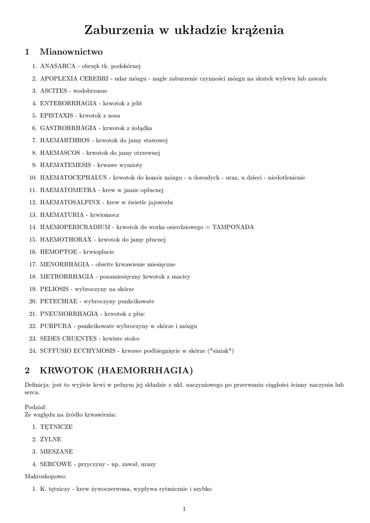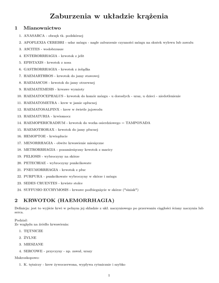 Zaburzenia w układzie krążenia 1 Mianownictwo 1. ANASARCA - obrzęk tk. podskórnej 2. APOPLEXIA CEREBRI - udar mózgu - nagłe zaburzenie czynności mózgu na skutek wylewu lub zawału 3. ASCITES - wodobrzusze 4. ENTERORRHAGIA - krwotok z jelit 5. EPISTAXIS - krwotok z nosa 6. GASTRORRHAGIA - krwotok z żołądka 7. HAEMARTHROS - krwotok do jamy stawowej 8. HAEMASCOS - krwotok do jamy otrzewnej 9. HAEMATEMESIS - krwawe wymioty 10. HAEMATOCEPHALUS - krwotok do komór mózgu - u dorosłych - uraz, u dzieci - niedotlenienie 11. HAEMATOMETRA - krew w jamie opłucnej 12. HAEMATOSALPINX - krew w świetle jajowodu 13. HAEMATURIA - krwiomocz 14. HAEMOPERICRADIUM - krwotok do worka osierdziowego = TAMPONADA 15. HAEMOTHORAX - krwotok do jamy płucnej 16. HEMOPTOE - krwioplucie 17. MENORRHAGIA - obwite krwawienie miesięczne 18. METRORRHAGIA - pozamiesięczny krwotok z macicy 19. PELIOSIS - wybroczyny na skórze 20. PETECHIAE - wybroczyny punkcikowate 21. PNEUMORRHAGIA - krwotok z płuc 22. PURPURA - punkcikowate wybroczyny w skórze i mózgu 23. SEDES CRUENTES - krwiste stolce 24. SUFFUSIO ECCHYMOSIS - krwawe podbiegnięcie w skórze (*siniak*) 2 KRWOTOK (HAEMORRHAGIA) Definicja: jest to wyjście krwi w pełnym jej składzie z ukł. naczyniowego po przerwaniu ciągłości ściany naczynia lub serca. Podział: Ze względu na źródło krwawienia: 1. TĘTNICZE 2. ŻYLNE 3. MIESZANE 4. SERCOWE - przyczyny - np. zawał, urazy Makroskopowo: 1. K. tętniczy - krew żywoczerwona, wypływa rytmicznie i szybko 1 2. K. żylny - krew ciemnoczerwona, wypływa powoli, jednostajnie 3. K. z naczyń włosowatych - sączenie z powierzchni rany 4. Krew czarna (przypominająca fusy od kawy) - po zetknięciu z HCl (np. w żołądku) Podział ze względu na przyczynę: 1. Na skutek uszkodzenia naczynia 1. URAZOWE (HAEMORRHAGIAE TRAUMATICAE) 2. SAMOISTNE (HAEMORRHAGIAE SPONTANEAE) i. Z PĘKNIĘCIA (H. PER RHEXIN) - następuje osłabienie i uszkodzenie ściany naczynia: A. ścieńczenie ściany B. uwypuklenie (tętniak) C. pęknięcie wywołane nagłym wzrostem ciśnienia krwi ii. Z NADŻARCIA (H. PER ARROSIONEM) - choroba z sąsiedztwa jest czynnikiem uszkadzającym: A. gruźlica B. wrzód żołądka C. nowotwór 2. Bez naruszenia ciągłości naczynia - krwotoki z naczyń włosowatych, drobne pojedyncze wybroczyny na skórze i błonach śluzowych (m.in. przejaw skazy krwotocznej naczyniowej/płytkowej). Krwotoki fizjologiczne: 1. miesiączka 2. krwawienie z pękniętego pęcherzyka Graffa 3. krwawienie z odklejonego łożyska Podział ze względu na miejsce krwawienia: 1. ZEWNĘTRZNE (H. EXTERNA) (a) BEZPOŚREDNIE (DIRECTA) - krew wypływa bezpośrednio na zewnątrz (b) POŚREDNIE (INDIRECTA) - krew gromadzi się w wewnątrz narządu i dopiero później wypływa na zewnątrz 2. WEWNĘTRZNE (H. INTERNA) (a) KRWIAK (HAEMATOMA) Definicja: jest to wylew krwi który uciska i rozsuwa składniki tkanek ale ich NIE USZKADZA, np. siniak. Także gromadzenie się krwi w jamach ciała i narządach rurowych. Podział: i. Krwiak NADTWARDÓWKOWY - zawsze w wyniku urazu, pomoc: ewakuacja krwiaka - nawiercenie dziury w czaszce, następstwa zależą od czasu trwania ucisku tk. mózgowej. ii. Krwiak PODTWARDÓWKOWY - zawsze na tle chorobowym: A. zmiany chorobowe naczyń - u ludzi starych B. tętniak wrodzony mózgu - u młodych iii. Krwiak PODPAJĘCZYNÓWKOWY - w nadciśnieniu, pęknięciu tętniaka iv. Krwiak DOKOMOROWY - u noworodków: tk. mózgowa słabo rozwinięta → niedotlenowanie → poszerzenie naczyń → pęknięcie. Zejście: i. wchłonięcie ii. uprzątnięcie → powstaje blizna (b) OGNISKO KRWOTOCZNE (FOCUS HAEMORRHAGICUS) - wylew który niszczy miejscowo tkanki - gł. w mózgu i trzustce. Budowa ogniska krwotocznego w mózgu: i. na zewnątrz - tk. mózgowa uciśnięta przez krew, później pojawiają się makrofagi obładowane hemosyderyną 2 ii. postrzępiona tk. glejowa wymieszana z krwią iii. centralnie - wylana krew Przyczyny: i. u ludzi starych - miażdżyca ii. u młodych - tętniak Zejście: i. Mózg - JAMA POUDAROWA (LACUNA POSTAPOPLETICA) - bo słaba proliferacja kom. glejowych ii. Trzustka - JAMA POUDAROWA - bo enzymy trawienne rozpuszczają tk. łączną iii. Inne narządy - blizna Następstwa krwotoku zależą od: 1. Lokalizacji - szczególnie niebezpieczne w: 4 komorze, korze nadnerczy, przegrodzie międzykomorowej. 2. Ilości krwi - do 500ml - brak następstw 3. Szybkości wypływu Szczególnie niebezpieczne: 1. nawet minimalne krwotoki do rdzenia przedłużonego 2. rozległe do kory nadnerczy, ukł. przewodzącego serca, worka osierdziowego (tamponada serca - ucisk na żż. płucne → przerwanie ciągłości krążenia) Skutki utraty krwi: 1. spadek ciśnienia (o 10 mm Hg na każde 500ml) 2. spadek tętna 3. nadprodukcja katecholamin (→ skurcz włośniczek i wzrost ciśnienia) 4. osłabienie 5. płytki oddech Wyniki sekcji po wstrząsie z krwotoku: 1. przekrwienie narządów 2. wybroczyny pod nasierdziem, opłucną 3. przekrwienie płuc i cechy obrzęku 4. błony szkliste w płucach 5. niedotlenienie (prowadzące do stłuszczenia i martwicy narządów) 6. zakrzepy w drobnych naczyniach 3 WSTRZĄS (SHOCK) Definicja: wyraz zaburzenia równowagi między pojemnością koryta naczyniowego a ilością krwi w naczyniach. Przyczyna: szybka utrata 0.5-1l krwi tętniczej lub powolna 3-4l żylnej. Następstwa: 1. HEMODYNAMICZNE ↓ objętości krwi → ↓ RR → pobudzenie baroreceptorów → ↑ [katecholamin] → skurcz naczyń (bladość), pocenie → przesunięcie wody z tkanek do naczyń → ↑ ciśnienia. 2. METABOLICZNE Przesunięcie wody z tkanek do naczyń → zagęszczenie jonów (np. H + → kwasica (→ udrożnienie WSZYSTKICH (zamiast 20% jak to jest normalnie) naczyń włosowatych) - DLATEGO PODAJEMY WĘGLANY HCO3− ) → przesunięcie wody do tkanek → ↑ gęstości krwi (tu kończą się reakcje odwracalne) → powstają skrzepliny (można zapobiec PODAJĄC ŚRODKI PRZECIWSKRZEPLIWE). 3 