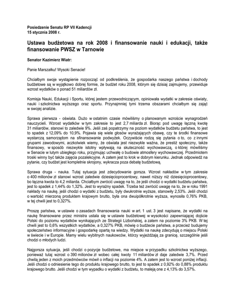 Posiedzenie Senatu RP VII Kadencji 15 stycznia 2008 r. Ustawa budżetowa na rok 2008 i finansowanie nauki i edukacji, także finansowanie PWSZ w Tarnowie Senator Kazimierz Wiatr: Panie Marszałku! Wysoki Senacie! Chciałbym swoje wystąpienie rozpocząć od podkreślenia, że gospodarka naszego państwa i dochody budżetowe są w wyjątkowo dobrej formie, że budżet roku 2008, którym się dzisiaj zajmujemy, przewiduje wzrost wydatków o ponad 51 miliardów zł. Komisja Nauki, Edukacji i Sportu, której jestem przewodniczącym, opiniowała wydatki w zakresie oświaty, nauki i szkolnictwa wyższego oraz sportu. Przynajmniej tymi trzema obszarami chciałbym się zająć w swojej analizie. Sprawa pierwsza - oświata. Dużo w ostatnim czasie mówiliśmy o planowanym wzroście wynagrodzeń nauczycieli. Wzrost wydatków w tym zakresie to jest 2,7 miliarda zł. Biorąc pod uwagę łączną kwotę 31 miliardów, stanowi to zaledwie 9%. Jeśli zaś popatrzymy na poziom wydatków budżetu państwa, to jest to spadek z 12,09% do 10,9%. Pojawia się wiele głosów wyrażających obawę, czy te środki finansowe wystarczą samorządom na sfinansowanie podwyżek. Oczywiście rodzą się pytania o to, co z innymi grupami zawodowymi, aczkolwiek wiemy, że oświata jest niezwykle ważna, że prestiż społeczny, także finansowy, w sposób niezwykle istotny wpływają na skuteczność wychowawczą, o której mówiliśmy w Senacie w lutym ubiegłego roku, przyjmując uchwałę o budowie atmosfery wychowawczej. Przedmiotem troski winny być także zajęcia pozalekcyjne. A zatem jest to krok w dobrym kierunku. Jednak odpowiedź na pytanie, czy budżet jest kompletnie skrojony, wykracza poza debatę budżetową. Sprawa druga - nauka. Tutaj sytuacja jest zdecydowanie gorsza. Wzrost nakładów w tym zakresie o 400 milionów zł stanowi wzrost zaledwie dziesięcioprocentowy, nawet niższy niż dziesięcioprocentowy, bo łączna kwota to 4,2 miliarda. Chciałbym zwrócić uwagę na to, że jeśli chodzi o wydatki budżetu państwa, jest to spadek z 1,44% do 1,32%. Jest to wyraźny spadek. Trzeba też zwrócić uwagę na to, że w roku 1991 nakłady na naukę, jeśli chodzi o wydatki z budżetu, były dwukrotnie wyższe, stanowiły 2,53%. Jeśli chodzi o wartość mierzoną produktem krajowym brutto, była ona dwuipółkrotnie wyższa, wynosiła 0,76% PKB, w tej chwili jest to 0,327%. Proszę państwa, w ustawie o zasadach finansowania nauki w art. 1 ust. 3 jest napisane, że wydatki na naukę finansowane przez ministra ustala się w ustawie budżetowej w wysokości zapewniającej dojście Polski do poziomu wydatków wynikających ze Strategii Lizbońskiej, a zatem na poziomie 3% PKB. W tej chwili jest to 0,6% wszystkich wydatków, a 0,327% PKB, mówię o budżecie państwa, a przecież budujemy społeczeństwo informacyjne i gospodarkę opartą na wiedzy. Wydatki na naukę zdecydują o miejscu Polski w świecie i w Europie. Mamy wielu wybitnych naukowców, którzy wyjeżdżają za granicę, szczególnie jeśli chodzi o młodych ludzi. Najgorsza sytuacja, jeśli chodzi o pozycje budżetowe, ma miejsce w przypadku szkolnictwa wyższego, ponieważ tutaj wzrost o 390 milionów zł wobec całej kwoty 11 miliardów zł daje zaledwie 3,7%. Przed chwilą jeden z moich przedmówców mówił o inflacji na poziomie 4%. A zatem jest to wzrost poniżej inflacji. Jeśli chodzi o odniesienie tego do produktu krajowego brutto, to jest to spadek z 0,92% do 0,88% produktu krajowego brutto. Jeśli chodzi w tym wypadku o wydatki z budżetu, to maleją one z 4,13% do 3,57%. Pojawia się poważny problem płac nauczycieli. Jest wiele narosłych problemów finansowych w szkolnictwie wyższym, wynikających z tego, że w ciągu ostatnich osiemnastu lat nastąpił trzykrotny wzrost liczby studentów, podczas gdy nakłady na szkolnictwo wyższe nie zmieniają się, jest niewielka fluktuacja, ale nie zmieniają się. A przecież Polska podpisała dokumenty związane z wdrażaniem procesu bolońskiego, który zakłada, że wydatki na szkolnictwo wyższe będą na poziomie 2% produktu krajowego brutto. W roku 2008 0,88%, czyli to jest 1/3 przewidywanego stanu. Jeśli chodzi o gorące problemy finansowe, to w pierwszym rzędzie trzeba mówić o płacach nauczycieli akademickich, o wydatkach rzeczowych, a także o stanie spoczynku profesorów. Są trzy grupy zawodowe, które podlegają mianowaniu przez prezydenta Rzeczypospolitej: sędziowie, generałowie i profesorowie. Ale tylko ta trzecia grupa nie ma stanu spoczynku, a nakłady na ten cel wcale nie byłyby takie duże. Jeszcze ważniejsza sprawa dotyczy wydatków rzeczowych uczelni. Otóż poprawianie wynagrodzeń nauczycieli akademickich wiązało się z tym, że ograniczano wydatki rzeczowe i doprowadzono do stanu, że w roku 2006 wydatki rzeczowe uczelni stanowiły 4-5% wszystkich wydatków, podczas gdy stan normalny jest wtedy, gdy to jest około 20%. W roku 2007 to się nieco poprawiło i teraz te wydatki to 5-6%. Muszę powiedzieć, że jako przedstawiciel Komisji Nauki, Edukacji i Sportu mam szczególne prawo mówić o tych sprawach, ponieważ w ubiegłej kadencji przez prawie rok tym problemem zajmowaliśmy się i został on opisany w wydawnictwie naszej komisji o sytuacji finansowej szkół wyższych. Jeśli chodzi o projekt budżetu, to wpłynęło do komisji wiele opinii: Konferencji Rektorów Akademickich Szkół Polskich, Rady Głównej Szkolnictwa Wyższego, NSZZ "Solidarność" Krajowej Sekcji Nauki, Konferencji Rektorów Uniwersytetów Polskich. Biorąc te wszystkie okoliczności pod uwagę, przedkładam państwu poprawkę zwiększającą nakłady na działalność dydaktyczną uczelni wyższych o 200 milionów zł. Jest to poprawka bezpieczna, uwarunkowana wpływami do budżetu z podatku VAT, przetestowana przy okazji uchwalania ubiegłorocznego budżetu. Myślę, że to jest nasz wkład jako Senatu w popieranie, w rozwój szkolnictwa wyższego, środowiska akademickiego