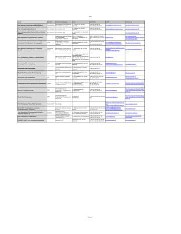 Parki Nazwa Akronim Podmiot zarządzajacy Adres telefon/fax E-mail Strona www Park Naukowo-Technologiczny Euro-Centrum Euro-Centrum Park Naukowo-Technologiczny Euro-Centrum Sp. z o.o. ul. Ligocka 103, 40-568 Katowice (+48-32) 205 00 92 fax (+48-32) 250 47 85 [email protected] www.euro-centrum.com.pl Park Przemysłowy Euro-Centrum Euro-Centrum Euro-Centrum S.A. ul. Ligocka 103, 40-568 Katowice (+48-32) 205 00 78 fax (+48-32) 250 47 85 [email protected] www.euro-centrum.com.pl Park Przemysłowy Euro-Centrum (filia w Chełmie Śląskim) Euro-Centrum Euro-Centrum S.A. ul. Owocowa 10 41-403 Chełm Śląski Park Przemysłowo-Technologiczny "Zagłębie" www.euro-centrum.com.pl Zagłębiowska Agencja Rozwoju ZAR - ul. Sielecka 11; S.A. (w likwidacji); UM - ul. 11 Listopada 20, 42Urząd Miejski w Będzinie 500 Będzin ZAR - (+48-32) 761 46 99; UM - (+48-32) 267 70 41 do 44 [email protected] http://www.zar.org.pl; http://www.bedzin.pl/default.aspx?ne wsId=299&docId=4483 http://www.spnt.sosnowiec.pl/ Sosnowiecki Park Naukowo-Technologiczny SPNT Urząd Miejski w Sosnowcu, Aleja Zwycięstwa 20, 41-200 Wydział Rozwoju i Współpacy z Sosnowiec Zagranicą (+48-32) 296 04 09, 296 04 67, fax (+48-32) 296 06 05 [email protected], [email protected] Park Naukowo-Technologiczny "Technopark Gliwice" Technopark Gliwice Park Naukowo-Technologiczny ul. Konarskiego 18c, 44-100 "Technopark Gliwice" Sp. z o.o. Gliwice (+48-32) 335 85 00, fax (+48-32) 335 85 00 karolina.warchalowska@technopark. gliwice.pl http://www.technopark.gliwice.pl [email protected] Park Przemysłowy i Usługowy w Bielsku Białej Górnośląski Park Przemysłowy GPP Agencja RozwojuRegionalnego S.A. w Bielsku-Białej ul. 1 Dywizji Pancernej 45, 43300 Bielsko Biała Agencja Rozwoju Regionalnego (+48-33) 818 47 79 S.A. w Bielsku Białej - ul. Cieszyńska 365, 43-382 Bielsko Biała [email protected] Górnosląski Park Przemysłowy Sp. z o.o. ul. Konduktorska 39A, 40-155 Katowice [email protected], [email protected] www.gppkatowice.pl (+48-32) 781 20 00, fax. (+48-32) 781 20 32 Goleszowski Park Przemysłowy Goleszowski Park Przemysłowy ul. Przemysłowa 10, 43-440 Sp. z o.o. Goleszów (+48-33) 852 81 81 Śląski Park Przemysłowo-Technologiczny Śląski Park Przemysłowy Sp. z o.o. ul. Szyb Walenty 26, 41-700 Ruda Śląska (+48-32) 789 51 01, fax. (+48-32) 789 51 14 [email protected] http://www.sppt.pl/ ul. Grunwaldzka 275, 43-600 Jaworzno (+48-32) 614 21 00 do 03; fax. 32 614 21 04 [email protected] www.jpp.jaworzno.pl www.arl-jaworzno.com.pl Jaworznicki Park Przemysłowy JPP Agencja Rozwoju Lokalnego S.A. Częstochowski Park Przemysłowo-Technologiczny CZPPT ul. Wały Dwernickiego 117/121, tel. (+48) 34 373 10 92, Agencja Rozwoju Regionalnego ul. Odlewników 43, tel. 601 095 161, w Częstochowie S.A. 42-200 Częstochowa fax. 34 373 10 78 [email protected] http://www.czpp.com.pl/czestochows ki-park-przemyslowo-technologiczny Bytomski Park Przemysłowy BPP Górnośląska Agencja Przekształceń Przedsiębiorstw GAPP S.A. ul. Siemianowicka 98 41-902 Bytom (+48-32) 789 53 06, fax. (+48-32) 789 53 27 [email protected] http://www.gapp.pl/index.php?option =com_content&view=article&id=75&I temid=28 Żorski Park Przemysłowy ŻPP Górnośląska Agencja Przekształceń Przedsiębiorstw GAPP S.A. ul. Boczna 8 44-240 Żory (+48-32) 756 00 02, 608 023 [email protected] 063 Park Przemysłowy "Cross Point" w Żorach "Cross Point" King Sturge Bielski Park Technologiczny Lotnictwa, Przedsiębiorczości i Innowacji Park Przemysłowo Technologiczny EkoPark w Piekarach Śląskich Sp. z o.o. Park Przemysłowy "STARA HUTA" SYNERGY PARK - Park biznesowo-przemysłowy EkoPark http://www.gapp.pl/index.php?option =com_content&view=article&id=77&I temid=28 aleksandra.malanowicz@kingsturge. com www.crosspoint.com.pl [email protected] Bielski Park Techniki Lotniczej Sp. z o.o. ul. Stefana Kośki 43 43-512 Kaniów [email protected], (+48-32) 750 82 32, fax ([email protected], 32) 750 82 33 [email protected] www.parklotniczy.pl Park Przemysłowo Technologiczny EkoPark w Piekarach Śląskich Sp. z o.o. ul. Walentego Roździeńskiego 24, 41-946 Piekary Śląskie (+48-32) 289 04 84, fax. (+48-32) 289 04 78 [email protected] www.ekopark.piekary.pl Gliwickie Zakłady Urządzeń Technicznych S.A. (+48-32) 338 15 01, fax. ul. Robotnicza 2 44-100 Gliwice (+48 32) 231 69 08 [email protected] http://www.gzut.pl/zaklady/parkprzemyslowy/ Metropolis S.A. Korfantego 141A, 40-154 Katowice [email protected] www.synergypark.pl (+48-32) 720 40 00, 256 46 46, fax. (+48-32) 255 23 70 Strona 1