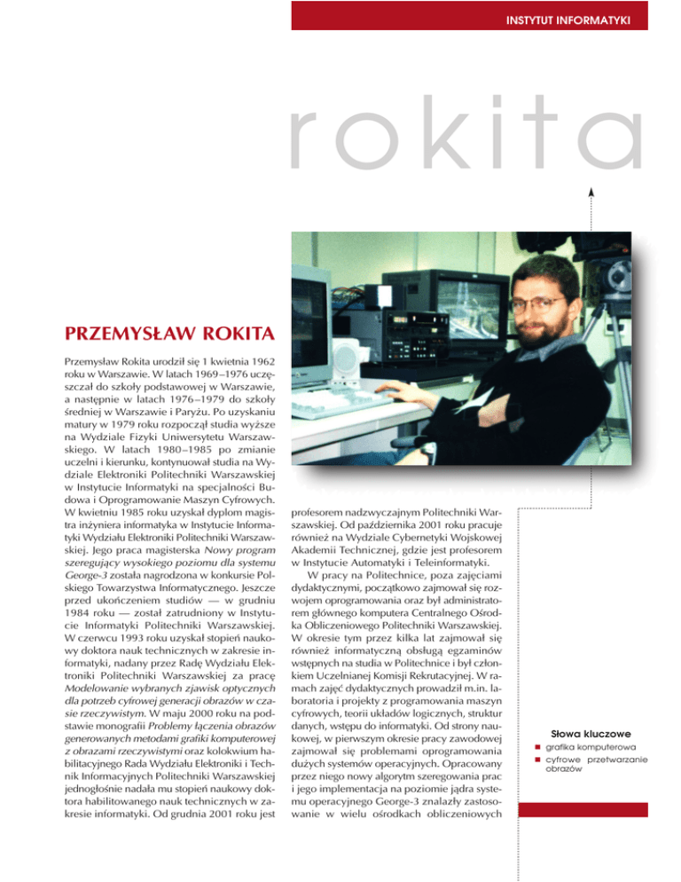 INSTYTUT INFORMATYKI rokita PRZEMYSŁAW ROKITA Przemysław Rokita urodził się 1 kwietnia 1962 roku w Warszawie. W latach 1969–1976 uczęszczał do szkoły podstawowej w Warszawie, a następnie w latach 1976 –1979 do szkoły średniej w Warszawie i Paryżu. Po uzyskaniu matury w 1979 roku rozpoczął studia wyższe na Wydziale Fizyki Uniwersytetu Warszawskiego. W latach 1980 –1985 po zmianie uczelni i kierunku, kontynuował studia na Wydziale Elektroniki Politechniki Warszawskiej w Instytucie Informatyki na specjalności Budowa i Oprogramowanie Maszyn Cyfrowych. W kwietniu 1985 roku uzyskał dyplom magistra inżyniera informatyka w Instytucie Informatyki Wydziału Elektroniki Politechniki Warszawskiej. Jego praca magisterska Nowy program szeregujący wysokiego poziomu dla systemu George-3 została nagrodzona w konkursie Polskiego Towarzystwa Informatycznego. Jeszcze przed ukończeniem studiów — w grudniu 1984 roku — został zatrudniony w Instytucie Informatyki Politechniki Warszawskiej. W czerwcu 1993 roku uzyskał stopień naukowy doktora nauk technicznych w zakresie informatyki, nadany przez Radę Wydziału Elektroniki Politechniki Warszawskiej za pracę Modelowanie wybranych zjawisk optycznych dla potrzeb cyfrowej generacji obrazów w czasie rzeczywistym. W maju 2000 roku na podstawie monografii Problemy łączenia obrazów generowanych metodami grafiki komputerowej z obrazami rzeczywistymi oraz kolokwium habilitacyjnego Rada Wydziału Elektroniki i Technik Informacyjnych Politechniki Warszawskiej jednogłośnie nadała mu stopień naukowy doktora habilitowanego nauk technicznych w zakresie informatyki. Od grudnia 2001 roku jest profesorem nadzwyczajnym Politechniki Warszawskiej. Od października 2001 roku pracuje również na Wydziale Cybernetyki Wojskowej Akademii Technicznej, gdzie jest profesorem w Instytucie Automatyki i Teleinformatyki. W pracy na Politechnice, poza zajęciami dydaktycznymi, początkowo zajmował się rozwojem oprogramowania oraz był administratorem głównego komputera Centralnego Ośrodka Obliczeniowego Politechniki Warszawskiej. W okresie tym przez kilka lat zajmował się również informatyczną obsługą egzaminów wstępnych na studia w Politechnice i był członkiem Uczelnianej Komisji Rekrutacyjnej. W ramach zajęć dydaktycznych prowadził m.in. laboratoria i projekty z programowania maszyn cyfrowych, teorii układów logicznych, struktur danych, wstępu do informatyki. Od strony naukowej, w pierwszym okresie pracy zawodowej zajmował się problemami oprogramowania dużych systemów operacyjnych. Opracowany przez niego nowy algorytm szeregowania prac i jego implementacja na poziomie jądra systemu operacyjnego George-3 znalazły zastosowanie w wielu ośrodkach obliczeniowych Słowa kluczowe n grafika komputerowa n cyfrowe przetwarzanie obrazów INSTYTUT INFORMATYKI R (Politechniki Warszawskiej, LOT-u, Centrum Informatycznego Gospodarki Morskiej). Wraz z rozpowszechnieniem się mikroprocesorów i komputerów osobistych zmienił się jego krąg zainteresowań naukowych — zajął się problematyką systemów odpornych na uszkodzenia oraz grafiką komputerową. W ramach prac nad systemami odpornymi na uszkodzenia opracował nową architekturę rekonfigurowalnego procesora tablicowego. Niestety, skromne możliwości finansowe nie pozwoliły na dalsze rozwijanie tego pomysłu. W tym okresie pracował również w zespole Instytutu Informatyki Politechniki Warszawskiej, realizującym prototyp symulatora lotu. Zespół ten, kierowany przez profesora Jana Zabrodzkiego, w późniejszym okresie przekształcił się w Zakład Grafiki Komputerowej Instytutu Informatyki. Wynikiem prac Przemysława Rokity w ramach tego projektu była specjalna szybka biblioteka procedur graficznych niskiego poziomu. W latach 1989 –1991 pracował jako programista, projektant oprogramowania oraz kierownik zespołu w Dziale Oprogramowania Eksportowego przedsiębiorstwa zagranicznego Karen — filii amerykańskiej firmy Logical Design Works z Krzemowej Doliny w Kalifornii. Podstawową zaletą tej pracy — oczywiście poza aspektem finansowym — był bardzo dobry dostęp do najnowszego sprzętu komputerowego. Trzeba pamiętać, że był to okres, kiedy na Politechnice trzeba było rezerwować dostęp do komputera typu IBM PC z tygodniowym wyprzedzeniem. W firmie można było otrzymać kilka komputerów do wyłącznej dyspozycji. W ramach zespołów, w których Przemysław Rokita brał udział i które sam prowadził, powstawało oprogramowanie dla wszystkich obecnych w tym okresie na rynku komputerów osobistych. Zrealizowane oprogramowanie było dystrybuowane w USA oraz Europie Zachodniej — były to kompilatory, arkusze kalkulacyjne oraz gry komputerowe. Z punktu widzenia wcześniejszych zainteresowań naukowych Przemysława Rokity szczególnie interesująca była praca przy realizacji komputerowych gier symulacyjnych (m.in. symulator wyścigów samochodowych oraz strategiczna gra symulacyjna „Solidarność”). Generowanie płynnych interaktywnych animacji na ówczesnym sprzęcie było bardzo trudnym zadaniem, a ich realizacja wymagała rozwiązania wielu interesujących problemów naukowych i inżynierskich — co było bardzo ciekawym doświadczeniem. W 1991 roku Przemysław Rokita wrócił do pracy w Instytucie Informatyki Politechniki Warszawskiej, gdzie oprócz pracy dydaktycz- nej (m.in. poprowadził wykład z „Programowania w asemblerze”) zajął się głębiej problematyką grafiki komputerowej. Efektem tej pracy była obroniona w 1993 roku rozprawa doktorska. Główny obszar zainteresowań naukowych Przemysława Rokity to grafika komputerowa, cyfrowe przetwarzanie obrazów oraz problemy percepcji obrazów. Poza licznymi publikacjami, efektem jego prac badawczych jest też rozwój dydaktyki — m.in. wykłady „Przetwarzanie i rozpoznawanie obrazów” oraz „Cyfrowe przetwarzanie obrazu”. Pod jego opieką zostały zakończone dwie prace doktorskie,