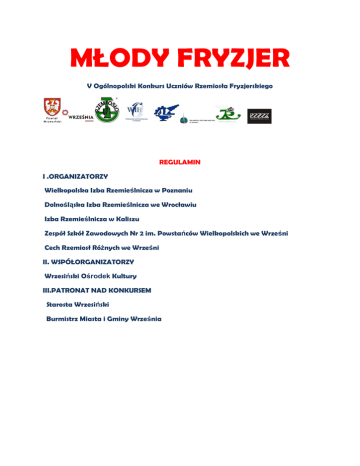 MŁODY FRYZJER V Ogólnopolski Konkurs Uczniów Rzemiosła Fryzjerskiego REGULAMIN I .ORGANIZATORZY Wielkopolska Izba Rzemieślnicza w Poznaniu Dolnośląska Izba Rzemieślnicza we Wrocławiu Izba Rzemieślnicza w Kaliszu Zespół Szkół Zawodowych Nr 2 im. Powstańców Wielkopolskich we Wrześni Cech Rzemiosł Różnych we Wrześni II. WSPÓŁORGANIZATORZY Wrzesiński Ośrodek Kultury III.PATRONAT NAD KONKURSEM Starosta Wrzesiński Burmistrz Miasta i Gminy Września IV .ZADANIA KONKURSU -wyłonienie reprezentacji -3 osoby Dział Damski -3 osoby Dział Męski z każdej z ww. Izb do startu we FRYZJERSKICH MISTRZOSTWACH POLSKI 8-9 maja 2016r. Poznań „Zgodnie z § 10 pkt 3-5 rozporządzenia Ministra Edukacji Narodowej z dnia 14 września 2012 r. w sprawie egzaminu czeladniczego, egzaminu mistrzowskiego oraz egzaminu sprawdzającego, przeprowadzanych przez komisje egzaminacyjne izb rzemieślniczych (Dz. U. z 2012 r., poz. 1117), Laureaci Konkursu mogą być zwolnieni z zadań egzaminacyjnych etapu praktycznego egzaminu czeladniczego, które były przedmiotem w/w Konkursu.” V .WARUNKI UCZESTNICTWA W KONKURSIE a/ wiek zawodnika nie może przekroczyć 21 lat w dniu startu i nie może być czeladnikiem; b/ poszczególne Izby Rzemieślnicze, Cechy oraz inne Organizacje i instytucje branżowe mają prawo zgłaszania do 10 zawodników w każdym dziale; c/ pisemne zgłoszenie zawierające dane: imię i nazwisko, datę urodzenia, rok nauki, adres zamieszkania, dane mistrza szkolącego; d/ w dniu startu w czasie losowania stanowisk należy przedłożyć umowę o naukę lub jej aneks. Należy posiadać legitymację lub inny dokument tożsamości; e/ udział w konkursie jest bezpłatny; f/ koszty dojazdu oraz wyżywienie ponosi uczestnik konkursu; VI .W CELU SPRAWNEGO PRZEPROWADZENIA KONKURSU POWOŁUJE SIĘ a/ Komisję Kontroli wspólnie dla działu damskiego i męskiego w składzie do 5 osób b/ Komisję Jury wspólnie dla działu damskiego i męskiego w składzie do 5 osób c/ Skład Komisji Kontroli oraz Komisji Jury winien się składać z Organizatorów Konkursu. VII .TERMIN ZGŁASZANIA ZAWODNIKÓW UPŁYWA 10 kwietnia 2016r. KONKURENCJA INDYWIDUALNA: DZIAŁ DAMSKI –FRYZURA Z FAL I PIERŚCIENI NA MOKRO a’la Monroe DZIAŁ DAMSKI - FRYZURA DZIENNA KONSUMENCKA - STRZYŻENIE I UCZESANIE DZIAŁ MĘSKI - FRYZURA UŻYTKOWA - MODNE MODELOWANIE DZIAŁ MĘSKI - FRYZURA KLASYCZNA - STRZYŻENIE I MODELOWANIE KONKURENCJE MISTRZOWSKIE: Dział Męski :fryzura użytkowa - modne modelowanie fryzura klasyczna – strzyżenie i modelowanie Dział Damski: fryzura dzienna konsumencka – strzyżenie i uczesanie z przeczesaniem na wieczorową KONKURENCJE DLA ABSOLWENTOW: Dział Damski: Fryzura Twoich marzeń-zgodnie z aktualnie obowiązującymi trendami Dział Męski: Fryzura Twoich marzeń- zgodnie z aktualnie obowiązującymi trendami Wszystkie wyżej wymienione konkurencje objęte powyższym regulaminem wykonywane są na główkach manekina lub żywym modelu. ZAKWALIFIKOWANIE DO KONKURSU W/G KOLEJNOŚCI ZGŁOSZEŃ