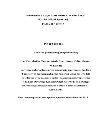 POMORSKI URZĄD WOJEWÓDZKI W GDAŃSKU Wydział Polityki Społecznej PS-II.431.3.8.2015 PROTOKÓŁ z kontroli problemowej przeprowadzonej w Kaszubskim Towarzystwie Sportowo – Kulturalnym w Luzinie dotycząca wykorzystania przez organizacje pozarządowe środków budżetowych przekazanych przez Pomorski Urząd Wojewódzki w Gdańsku w na realizację zadań z zakresu pomocy społecznej w ramach Otwartego Konkursu Ofert Wojewody Pomorskiego na realizację zadań publicznych z zakresu pomocy społecznej – Edycja 2014. Kontrola przeprowadzona zgodnie z planem kontroli na rok 2015 2 I. Zasady i warunki organizacji kontroli Działając na podstawie art. 28 ustawy z dnia 23 stycznia 2009 r. i administracji rządowej w województwie (Dz. U. Nr 31, poz. 206 o wojewodzie z późn. zm.), art. 17 ustawy z dnia 24 kwietnia 2003 r. o działalności pożytku publicznego i o wolontariacie (j.t. Dz. U. z 2014 r. poz. 1118 z późn. zm.), w związku z art. 25 ust. 1 i ust. 5 ustawy z dnia 12 marca 2004r. o pomocy społecznej ( j.t. Dz. U. z 2013 r. poz. 182 z późń. zm.), rozporządzenia Ministra Polityki Społecznej z dnia 23 marca 2005 r. w sprawie nadzoru i kontroli w pomocy społecznej (Dz. U. Nr 61, poz. 543 z późn. zm.) oraz umów zawartych w ramach Otwartego Konkursu Ofert Wojewody Pomorskiego – edycja 2014 r., przeprowadzona została kontrola problemowa w Kaszubskim Towarzystwie Sportowo – Kulturalnym w Luzinie obejmująca wykorzystanie w 2014 r. środków budżetowych przekazanych przez Pomorski Urząd Wojewódzki w Gdańsku na realizację zadań z zakresu pomocy społecznej. Kontrolę przeprowadzono w siedzibie Kaszubskiego Towarzystwa Sportowo – Kulturalnego – Luzino, ul. Mickiewicza 22 gdzie znajduje się również Gminny Ośrodek Sportu Rekreacji i Turystyki oraz w Świetlicy Środowiskowej we wsi Dąbrówka (gm. Luzino) Celem kontroli była ocena realizacji zadania z zakresu pomocy społecznej przez Kaszubskie Towarzystwo Sportowo – Kulturalne w Luzinie na podstawie umowy zawartej w 2014 r. z Wojewodą Pomorskim. Przedmiotem badania kontrolnego w szczególności było ustalenie: - merytorycznej poprawności realizacji zadania, - warunków realizacji zadania, - prawidłowości gospodarowania środkami dotacyjnymi w zakresie zgodności realizowanego zadania z zapisami umowy zawartej z Wojewodą ( w tym zachowanie określonego w umowie poziomu udziału dotacji z budżetu Wojewody w całości kosztów zadania), - prawidłowości ewidencji wydatkowanych środków dotacyjnych, - efektów zrealizowanego projektu. 3 Całokształt przedmiotu kontroli badano na podstawie: ustawa z dnia 12 marca 2004 r. o pomocy społecznej (j. t. Dz. U. z 2013 r. poz. 182 z późń. zm.), ustawa z dnia 24 kwietnia 2003 r. o działalności pożytku publicznego i o wolontariacie (j.t. Dz. U. z 2014 r. poz. 1118 z późn. zm.), rozporządzenie Ministra Pracy i Polityki Społecznej z dnia 15 grudnia 2010 r. w sprawie ramowego wzoru oferty i ramowego wzoru umowy dotyczących realizacji zadania publicznego oraz wzoru sprawozdania z wykonania tego zadania (Dz. U. z 2011 r. Nr 6, poz. 25), ustawa z dnia 27 sierpnia 2009 r. o finansach publicznych (Dz.U. z 2013 r. poz. 885 z późn. zm.), ustawa z dnia 29 września 1994r. o rachunkowości ( Dz.U. z 2013 r. poz. 330 z późn. zm.) Umowa dotacyjna Nr 72/PS z dnia 16 czerwca 2014 r., zawarta pomiędzy Wojewodą Pomorskim reprezentowanym przez Krystynę Kobylińską – Zastępcę Dyrektora Wydziału Polityki Społecznej Pomorskiego Urzędu Wojewódzkiego a Kaszubskim Towarzystwem Sportowo – Kulturalnym w Luzinie reprezentowanym przez Piotra Klechę – Prezesa oraz Rafała Karcza – Wiceprezesa. Kontrolę przeprowadziły w dniu 29 października 2015 r.: - Małgorzata Szady – starszy inspektor wojewódzki w Wydziale Polityki Społecznej Pomorskiego Urzędu Wojewódzkiego w Gdańsku, posiadająca Upoważnienie Nr 308/2015 (PS-II.0030.18.2015) z dnia 21 października 2015r., - Aneta Onichowska - inspektor wojewódzki w Wydziale Polityki Społecznej Pomorskiego Urzędu Wojewódzkiego w Gdańsku, posiadająca (PS-I.0030.18.2015) z dnia 21 października 2015r. W toku kontroli wyjaśnień udzielali: - Piotr Klecha – Prezes, - Paweł Radecki – Koordynator. Upoważnienie Nr 309/2015 4 II. Ustalenia kontrolne: W 2014 r. Pomorski Urząd Wojewódzki w Gdańsku przekazał Kaszubskiemu Towarzystwu Sportowo – Kulturalnemu w Luzinie w wyniku rozstrzygnięć Otwartego Konkursu Ofert Wojewody Pomorskiego na realizację zadań publicznych z zakresu pomocy społecznej dotację w kwocie 5 000 zł na realizację programu: „Tworzenie i prowadzenie placówek wsparcia dziennego dla dzieci i młodzieży z rodzin dysfunkcyjnych w gminie Luzino”– zgodnie z umową Nr 72/PS z dnia 16 czerwca 2014 r. Istotą tego zadania było prowadzenie zajęć dla grupy dzieci i młodzieży z rodzin dysfunkcyjnych, które wykazywały symptomy różnorodnych zaburzeń w zachowaniu, posiadających negatywne wzorce środowiskowe, mających trudności w nauce, zamieszkałych na terenie i okolic gminy Luzino ,w okresie czerwiec 2014r. – grudzień 2014r. Realizacja zadania polegała na przeprowadzeniu pozalekcyjnych zajęć sportowych przez instruktorów sportowych dla ww. grupy w obiektach Gminnego Ośrodka Sportu Rekreacji i Turystyki w Luzinie, tj. na Hali Widowiskowo – Sportowej gdzie uprawiane są liczne zajęcia sportowe w sekcjach: piłka nożna, siatkówka, koszykówka, kickboxing, aerobic, taniec sportowy i towarzyski oraz zajęcia na mieszczących się nieopodal boiskach. Największym zainteresowaniem cieszyły się treningi piłki nożnej i tę dziedzinę sportu najbardziej popularyzują instruktorzy Towarzystwa. charakter Zajęcia te były nieodpłatne i miały profilaktyczny i przeciwdziałający wchodzeniu młodych ludzi w sytuacje ryzykowne (alkohol, środki psychoaktywne). Prowadzone były przez doświadczonego animatora sportu, pracującego wcześniej jako pedagog ulicy. Pona