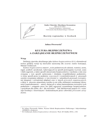 Studia i Materiały. Miscellanea Oeconomicae Rok 18, Nr 3/2014 Wydział Zarządzania i Administracji Uniwersytetu Jana Kochanowskiego w Kielcach Rozwój regionalny w liczbach Juliusz Piwowarski1 KULTURA BEZPIECZEŃSTWA A ZARZĄDZANIE BEZPIECZEŃSTWEM Wstęp Definicję zjawiska określanego jako kultura bezpieczeństwa (k.b.) sformułował twórca polskiej wersji tej niezwykle użytecznej dla security studies koncepcji, Marian Cieślarczyk: Kultura bezpieczeństwa stanowi „wzór podstawowych założeń, wartości, norm, reguł, symboli i przekonań, wpływających na sposób postrzegania wyzwań, szans i (lub) zagrożeń, a także sposób odczuwania bezpieczeństwa i myślenia o nim oraz związany z tym sposób zachowania i działania (współdziałania) podmiotów, w różny sposób przez te podmioty wyuczonych i wyartykułowanych w procesach szeroko rozumianej edukacji, w tym również w naturalnych procesach wewnętrznej integracji i zewnętrznej adaptacji oraz w innych procesach organizacyjnych, a także w procesie umacniania szeroko (a nie tylko militarnie) rozumianej obronności [samoobronności – autor], służących w miarę harmonijnemu rozwojowi tych podmiotów i osiąganiu przez nie [jak] najszerzej rozumianego bezpieczeństwa, z pożytkiem dla siebie, ale i dla otoczenia”2. Tak zdefiniowane pojęcie k.b. wykazuje korelacje z kreowanymi i doskonalonymi przez człowieka procesami zarządzania. 1 2 Dr Juliusz Piwowarski, Rektor, Wyższa Szkoła Bezpieczeństwa Publicznego i Indywidualnego APEIRON w Krakowie. M. Cieślarczyk, Kultura bezpieczeństwa i obronności, Wyd. AP, Siedlce 2010, s. 210. 87 Trzy wymiary kultury bezpieczeństwa Kultura bezpieczeństwa, może być analizowana w trzech wymiarach: · Pierwszy wymiar – składają się nań określone idee, system wartości i duchowość osoby ludzkiej3; · Drugi wymiar – odnosi się do społecznych oddziaływań organizacji oraz do systemów prawa, wynalazczości, innowacji etc.; · Trzeci wymiar – obejmuje wszelkie materialne aspekty egzystencji ludzkiej, będące wytworami człowieka4. Wymiary kultury bezpieczeństwa Cieślarczyk nazywa „filarami kultury bezpieczeństwa”5. Składowe tych wymiarów do pewnego stopnia przenikają się. Na przykład wiedza będąca składnikiem pierwszego wymiaru k.b., poza należącymi do niego, uznanymi przez człowieka wartościami i zasadami, jest też domeną drugiego racjonalno-organizacyjno-prawnego wymiaru k.b. (także związanego z myślą techniczną). Zarządzanie bezpieczeństwem, tak jak nauki o bezpieczeństwie, warunkuje naukowe poszukiwania, które charakteryzują się holistycznym podejściem. Jednym z przykładów jest funkcja organizacyjna będąca częścią zarządzania. Teorię i praktykę zarządzania, należy traktować jako składowe dopełniające się, które uzyskują komplementarność wyników badań. „Próbą pokonania parcelacji mogą być badania interdyscyplinarne. Zakładają one istnienie określonej sieci dyscyplin (…), równoczesne korzystanie ze sposobu podejścia i metod więcej niż jednej dyscypliny. Z tego powodu coraz częściej głosi się potrzebę przejścia do studiów o charakterze postdyscyplinarnym, rozumianych jako wyjście poza dotychczasową sieć dyscyplinarną w poszukiwaniu instrumentów holistycznego objęcia badanego wycinka życia społecznego”6. Zarządzanie i bezpieczeństwo Zjawiska i procesy społeczne będące częścią organizacji rozumianej in general oraz towarzyszące im pojęcia administrowanie i zarządzanie, związane są tak z zarządzaniem publicznym7 jak również z działaniami o charakterze niepublicznym. Powiązane są one z życiem jednostek, z ich samoorganizacją oraz z zarządzaniem przedsiębiorczością. Należy pamiętać, że funkcje jakie pełnią prawo 3 Duchowość – pojęcie opisywane przez naukę, szersze aniżeli pojęcie religia. Por.: P. Socha (red.), Duchowy rozwój człowieka, Wydawnictwo Uniwersytetu Jagiellońskiego, Kraków 2000. 4 A. Kłoskowska, Socjologia kultury, PWN, Warszawa 2007, s. 103 i nast.; A. Kroeber, Istota kultury, PWN, Warszawa 2002, s. 195 i n. 5 M. Cieślarczyk, Fenomen bezpieczeństwa i zjawisko kryzysów postrzegane w perspektywie kulturowej, [w:] Jedność i różnorodność, E. Rekłajtis, B. Wiśniewski, J. Zdanowski (red.), ASPRA-JR, Warszawa 2010, s. 96 i n. 6 H. Izdebski, Elementy teorii i filozofii prawa, Lexis Nexis, Warszawa 2008, s. 51. 7 J.Piwowarski, B. Płonka, Etyka w administracji i zarządzaniu publicznym. Motywacje, realizacja, bezpieczeństwo, Kraków 2012. 88 i dopełniająca zarządzanie bezpieczeństwem kultura organizacyjna, ukierunkowane są tak bezpośrednio jak i pośrednio na podnoszenie jakości życia, poprzez zapewnianie bezpieczeństwa człowieka. Towarzyszą temu moralność i etyka, którym pomaga prawo i dobre zarządzanie, a jednym z podstawowych elementów jakości życia jest możliwie jak najwyższy poziom poczucia bezpieczeństwa. Spektralna definicja pojęcia bezpieczeństwo sformułowana w CRISD APEIRON8 przez Juliusza Piwowarskiego, określa kategorię badawczą bezpieczeństwo z punktu widzenia epistemologicznego, aksjologicznego, ontologicznego oraz socjologicznego: Bezpieczeństwo, jest to dla określonego jednostkowego lub zbiorowego podmiotu bezpieczeństwa, odnoszące się do niego bezpośrednio lub też pośrednio, wielowarstwowe zjawisko i pojęcie, którego spektrum tworzą następujące cztery komponenty: 9 · pożądany stan, który oznacza dla danego podmiotu poziom efektywności kontroli nad możliwymi w danym miejscu i przedziale czasu zagrożeniami wartości istotnych dla tego podmiotu; inaczej mówiąc, bezpieczeństwo jest to stan odzwierciedlający wynik różnicy potencjałów – potencjał samobronności danego podmiotu z jednej i potencjał zagrożeń tego podmiotu z drugiej strony, istniejące w określonej czasoprzestrzeni, (podejście epistemologiczne) · wartość o charakterze instrumenta