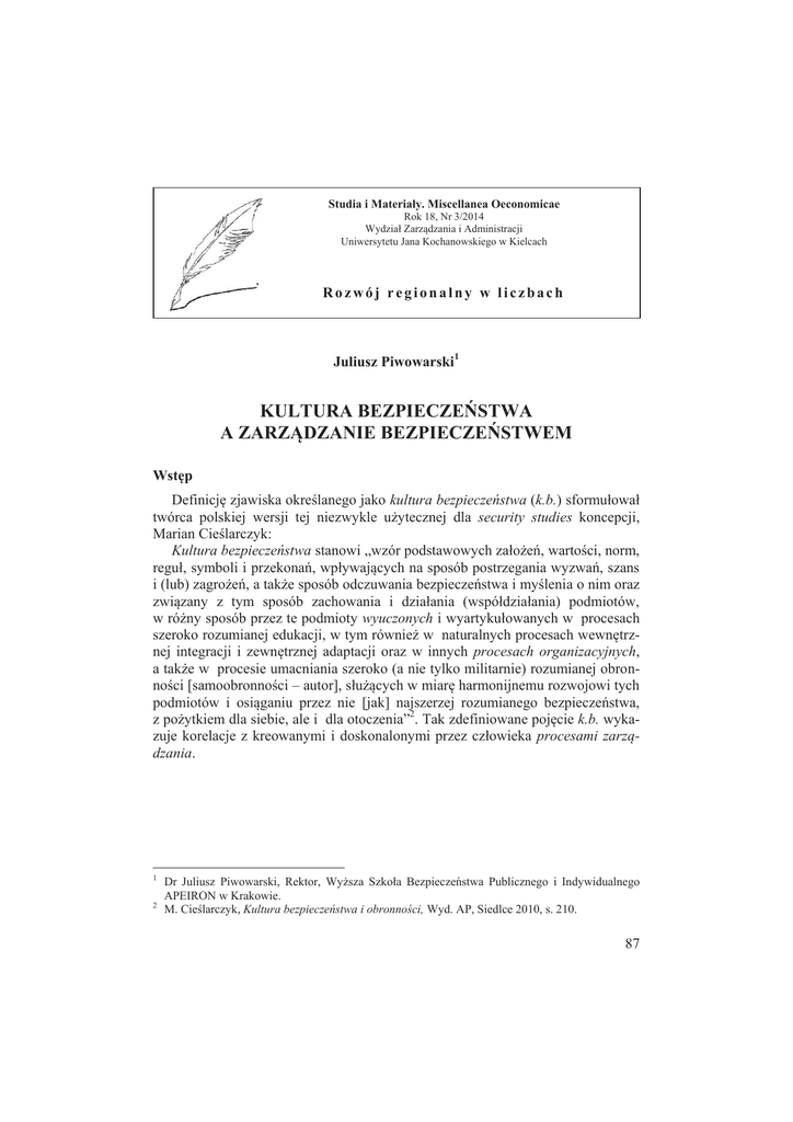 Juliusz Piwowarski, Kultura bezpieczenstwa a zarzadzanie