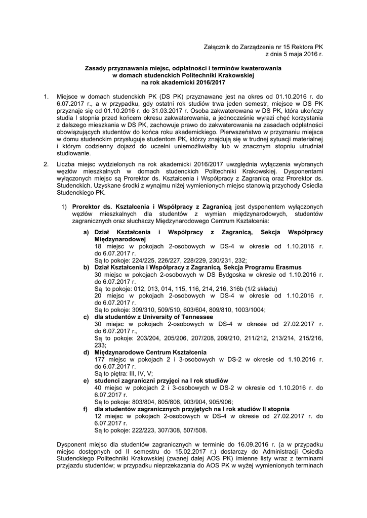 Załącznik do Zarządzenia nr 15 Rektora PK z dnia 5 maja 2016 r. Zasady przyznawania miejsc, odpłatności i terminów kwaterowania w domach studenckich Politechniki Krakowskiej na rok akademicki 2016/2017 1. Miejsce w domach studenckich PK (DS PK) przyznawane jest na okres od 01.10.2016 r. do 6.07.2017 r., a w przypadku, gdy ostatni rok studiów trwa jeden semestr, miejsce w DS PK przyznaje się od 01.10.2016 r. do 31.03.2017 r. Osoba zakwaterowana w DS PK, która ukończy studia I stopnia przed końcem okresu zakwaterowania, a jednocześnie wyrazi chęć korzystania z dalszego mieszkania w DS PK, zachowuje prawo do zakwaterowania na zasadach odpłatności obowiązujących studentów do końca roku akademickiego. Pierwszeństwo w przyznaniu miejsca w domu studenckim przysługuje studentom PK, którzy znajdują się w trudnej sytuacji materialnej i którym codzienny dojazd do uczelni uniemożliwiałby lub w znacznym stopniu utrudniał studiowanie. 2. Liczba miejsc wydzielonych na rok akademicki 2016/2017 uwzględnia wyłączenia wybranych węzłów mieszkalnych w domach studenckich Politechniki Krakowskiej. Dysponentami wyłączonych miejsc są Prorektor ds. Kształcenia i Współpracy z Zagranicą oraz Prorektor ds. Studenckich. Uzyskane środki z wynajmu niżej wymienionych miejsc stanowią przychody Osiedla Studenckiego PK. 1) Prorektor ds. Kształcenia i Współpracy z Zagranicą jest dysponentem wyłączonych węzłów mieszkalnych dla studentów z wymian międzynarodowych, studentów zagranicznych oraz słuchaczy Międzynarodowego Centrum Kształcenia: a) Dział Kształcenia i Współpracy z Zagranicą, Sekcja Współpracy Międzynarodowej 18 miejsc w pokojach 2-osobowych w DS-4 w okresie od 1.10.2016 r. do 6.07.2017 r. Są to pokoje: 224/225, 226/227, 228/229, 230/231, 232; b) Dział Kształcenia i Współpracy z Zagranicą, Sekcja Programu Erasmus 30 miejsc w pokojach 2-osobowych w DS Bydgoska w okresie od 1.10.2016 r. do 6.07.2017 r. Są to pokoje: 012, 013, 014, 115, 116, 214, 216, 316b (1/2 składu) 20 miejsc w pokojach 2-osobowych w DS-4 w okresie od 1.10.2016 r. do 6.07.2017 r. Są to pokoje: 309/310, 509/510, 603/604, 809/810, 1003/1004; c) dla studentów z University of Tennessee 30 miejsc w pokojach 2-osobowych w DS-4 w okresie od 27.02.2017 r. do 6.07.2017 r., Są to pokoje: 203/204, 205/206, 207/208, 209/210, 211/212, 213/214, 215/216, 233; d) Międzynarodowe Centrum Kształcenia 177 miejsc w pokojach 2 i 3-osobowych w DS-2 w okresie od 1.10.2016 r. do 6.07.2017 r. Są to piętra: III, IV, V; e) studenci zagraniczni przyjęci na I rok studiów 40 miejsc w pokojach 2 i 3-osobowych w DS-2 w okresie od 1.10.2016 r. do 6.07.2017 r. Są to pokoje: 803/804, 805/806, 903/904, 905/906; f) dla studentów zagranicznych przyjętych na I rok studiów II stopnia 12 miejsc w pokojach 2-osobowych w DS-4 w okresie od 27.02.2017 r. do 6.07.2017 r. Są to pokoje: 222/223, 307/308, 507/508. Dysponent miejsc dla studentów zagranicznych w terminie do 16.09.2016 r. (a w przypadku miejsc dostępnych od II semestru do 15.02.2017 r.) dostarczy do Administracji Osiedla Studenckiego Politechniki Krakowskiej (zwanej dalej AOS PK) imienne listy wraz z terminami przyjazdu studentów; w przypadku nieprzekazania do AOS PK w wyżej wymienionych terminach pisemnej informacji o rezygnacji z miejsc, które nie zostały lub nie będą wykorzystane, dysponent będzie obciążany za niewykorzystane miejsca w wysokości 50% opłaty czynszowej na podstawie obciążeń wewnętrznych, do czasu przekazania takiej informacji do AOS PK. Możliwość zwrotu miejsc dotyczy całych pokoi, a nie miejsc pojedynczych. 2) Prorektor ds. Studenckich jest dysponentem wyłączonych węzłów mieszkalnych dla studentów przyjętych na I rok studiów, doktorantów, osób niepełnosprawnych, członków AZS PK, członków Parlamentu Samorządu Studenckiego PK, Rady Osiedla oraz Rady Mieszkańców Domów Studenckich: a) dla doktorantów 16 miejsc w pokojach 2-osobowych w DS-4 w okresie od 1.10.2016 r. do 6.07.2017 r. Są to pokoje: 424/425, 426/427, 428/429, 430/431; b) dla osób niepełnosprawnych 18 miejsc w okresie od 1.10.2016 r. do 6.07.2017 r.: – 6 miejsc w pokojach 1 i 2-osobowych w DS-1. Są to pokoje: 114A (1-osobowy), 114B (2-osobowy), 115A (1-osobowy), 115B (2osobowy); – 4 miejsca w pokojach 1-osobowych w DS-3. Są to pokoje: 112A, 112B, 113A, 113B; – 8 miejsc w pokojach 2-osobowych w DS-4. Są to pokoje: 103/104, 105/106, 503, 504; c) dla osób przyjętych na I rok studiów 346 miejsc w okresie od 1.10.2016 r. do 6.07.2017 r.: – 30 miejsc w DS-1, – 20 miejsc w DS-1 (dla studentów przyjętych na I rok studiów II stopnia), – 100 miejsc w DS-2, – 160 miejsc w DS-3, – 20 miejsc DS-4 (dla studentów przyjętych na I rok studiów II stopnia), – 16 miejsc w DS-B1; d) Akademicki Związek Sportowy – Klub Uczelniany PK 16 miejsc w pokojach 2-osobowych w DS-4 w okresie od 1.10.2016 r. do 6.07.2017 r. Są to pokoje: 403/404, 405/406, 407/408, 422/423; e) Parlament Samorządu Studenckiego 16 miejsc w pokojach 2-osobowych w DS-4 w okresie od 1.10.2016 r. do 6.07.2017 r. Są to pokoje: 409/410, 411/412, 413/414, 415/416. Zasady przyznawania miejsc dla tej grupy osób zostały określone w dalszej części dokumentu; f) Rada Osiedla/Rady Mieszkańców Domów Studenckich 36 miejsc w okresie od 1.10.2016 r. do 6.07.2017 r. Do dnia 16.05.2016 r. Rada Osiedla Domów Studenckich przekaże do AOS PK listę z wykazem osób (aktualnych członków RO/RM), które w roku akademickim 2016/2017 r. będą kontynuowały studia na PK oraz wskazaniem DS, w którym każda z tych osób będzie kwaterowana. 3) Kierownik Osiedla Studenckiego jest dysponentem pozostałych miejsc w domach studenckich. 3. Miejsca w domach studenckich będą przyznawane według następujących zasad. 1) Wszyscy studenci PK ubiegający się o miejsca w DS PK zobowiązani są do wysłania e-wniosku o przyznanie miejsca w DS PK drogą elektroniczną w sy